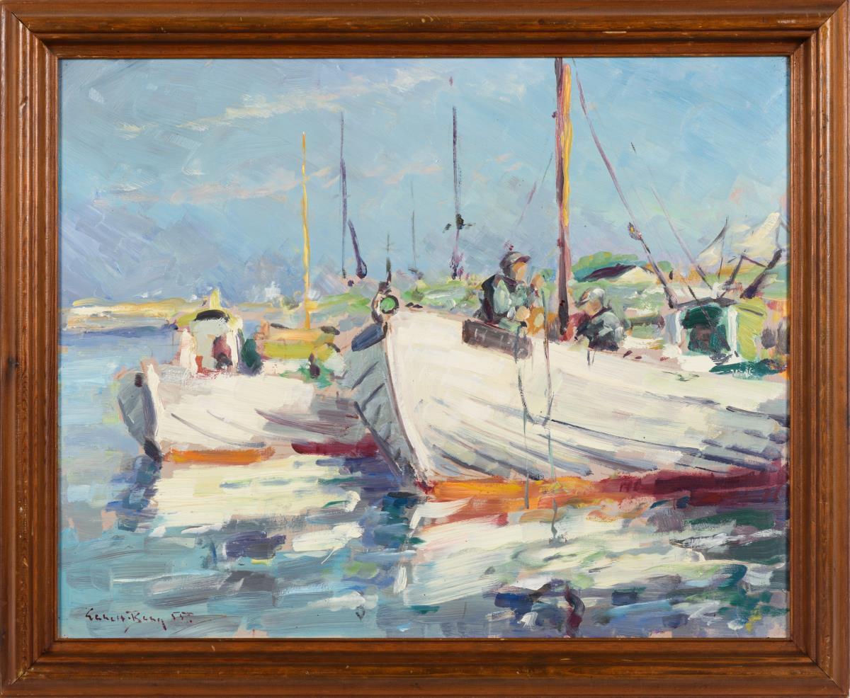 Undeutlich signiert: Sonnige Hafenansicht
