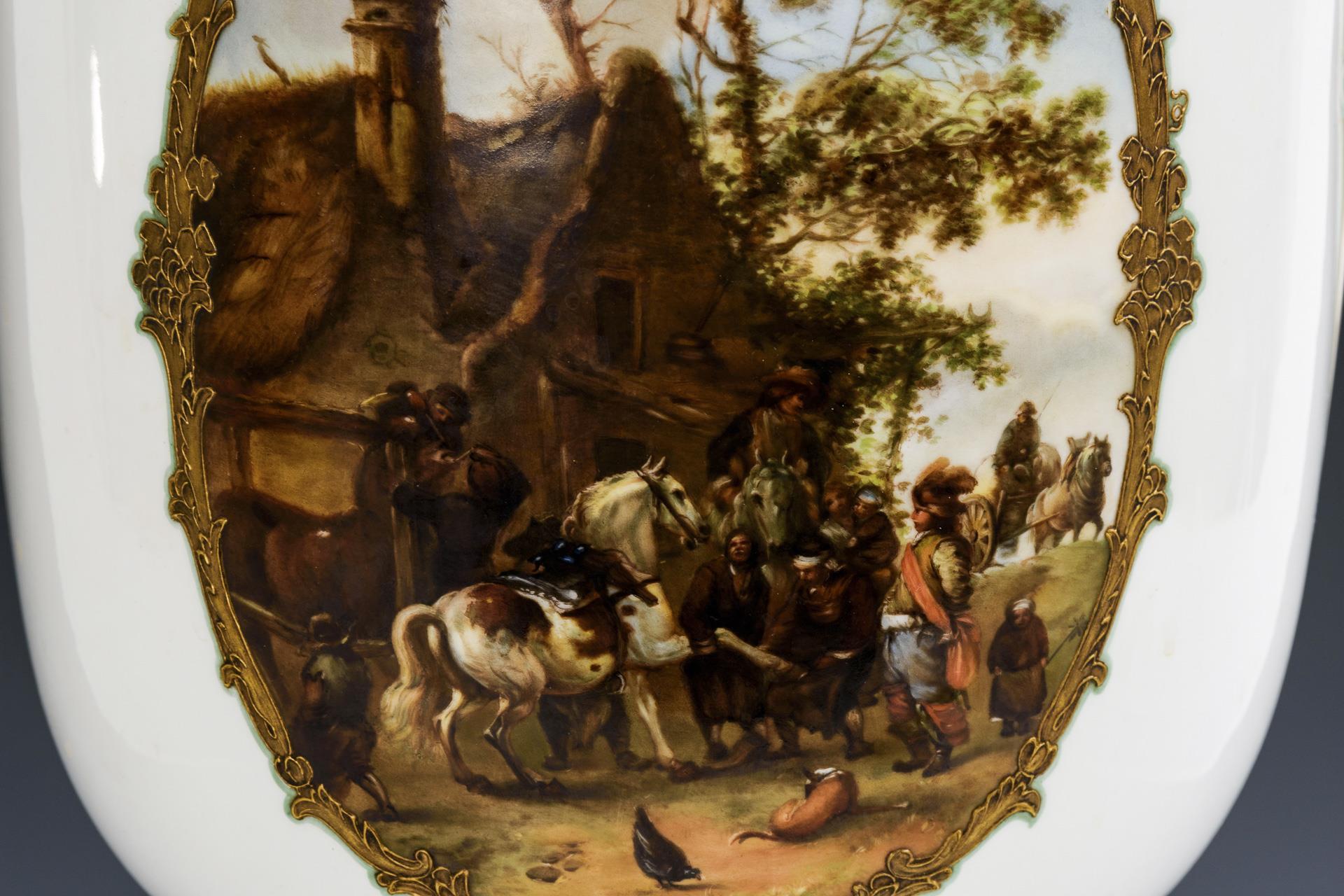Cylindrical body with two curved acanthus leaf handles, fluted shaft and round foot, on a square base. On the front an oval medallion painted in gold in relief depicting a blacksmith scene, after a painting by Philips Wouwerman (1619-1668). Lid missing, minimal gold wear.