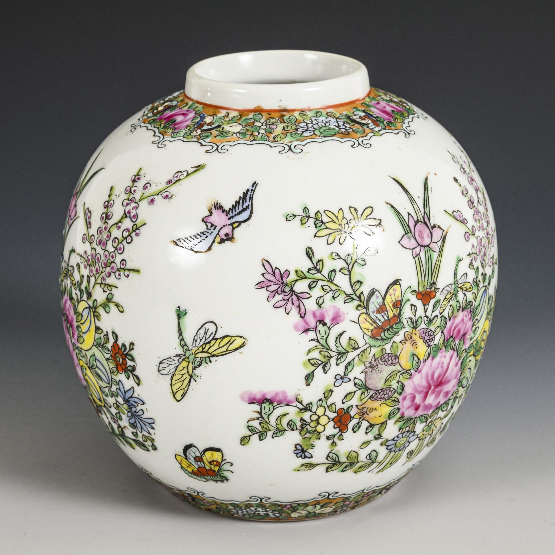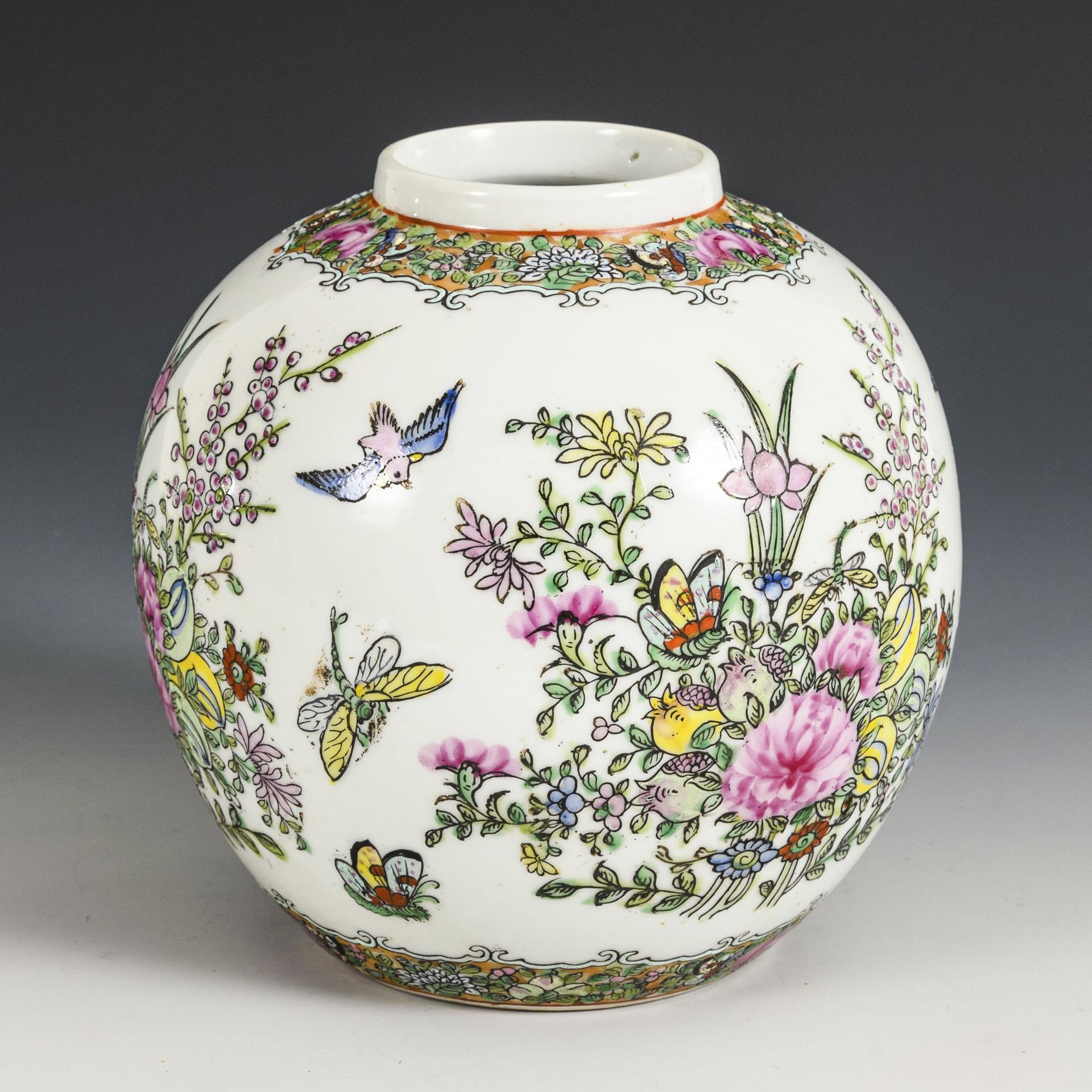 Delicate, floral painting in polychrome enamel colors. Birds and butterflies above flowers. Glazed inside, shoulder with thicker body.