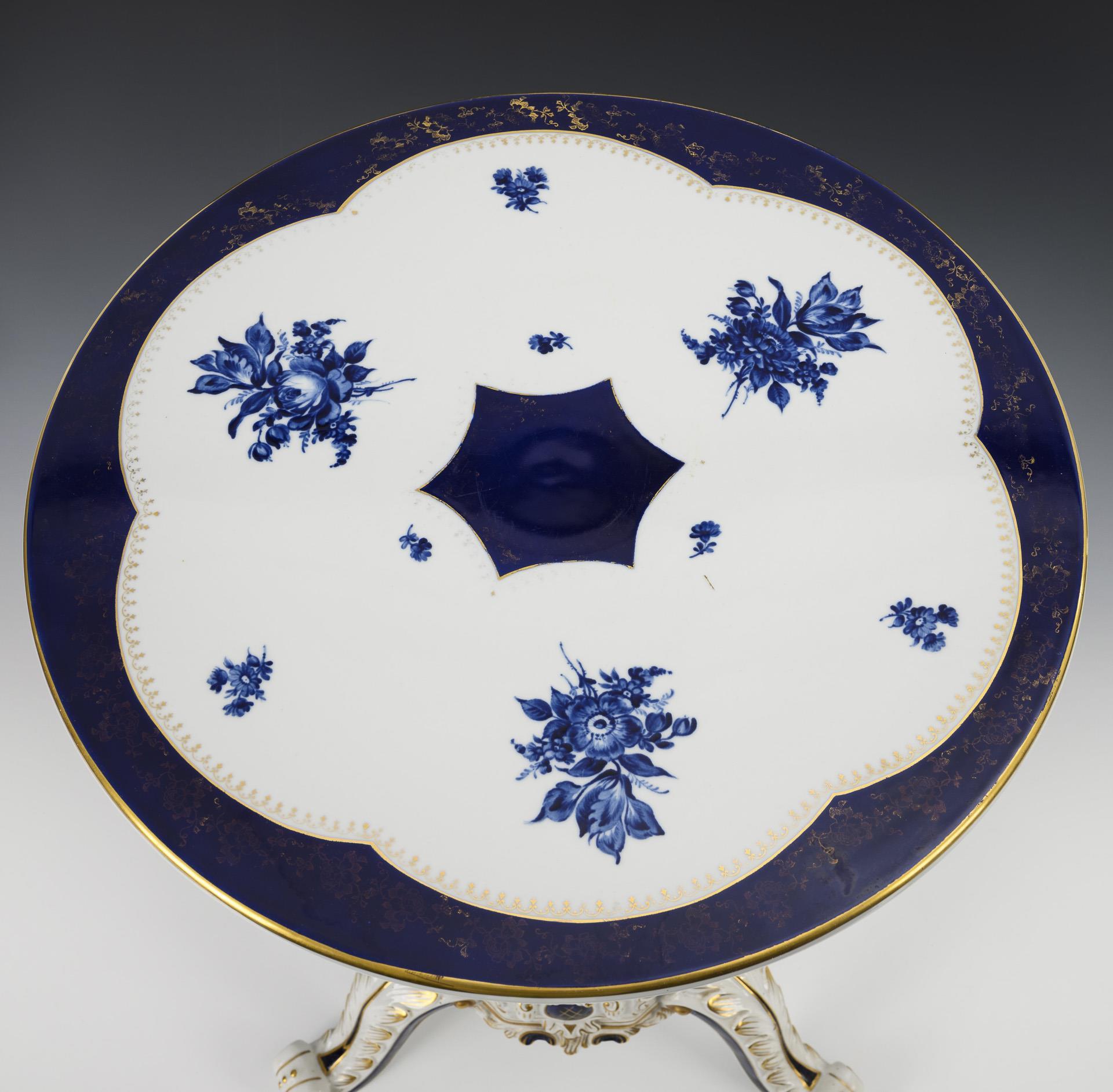 Underglaze blue partial ground, underglaze blue floral bouquets, gold decoration. H 65 cm, Ø table top 46 cm. 9.8 kg.