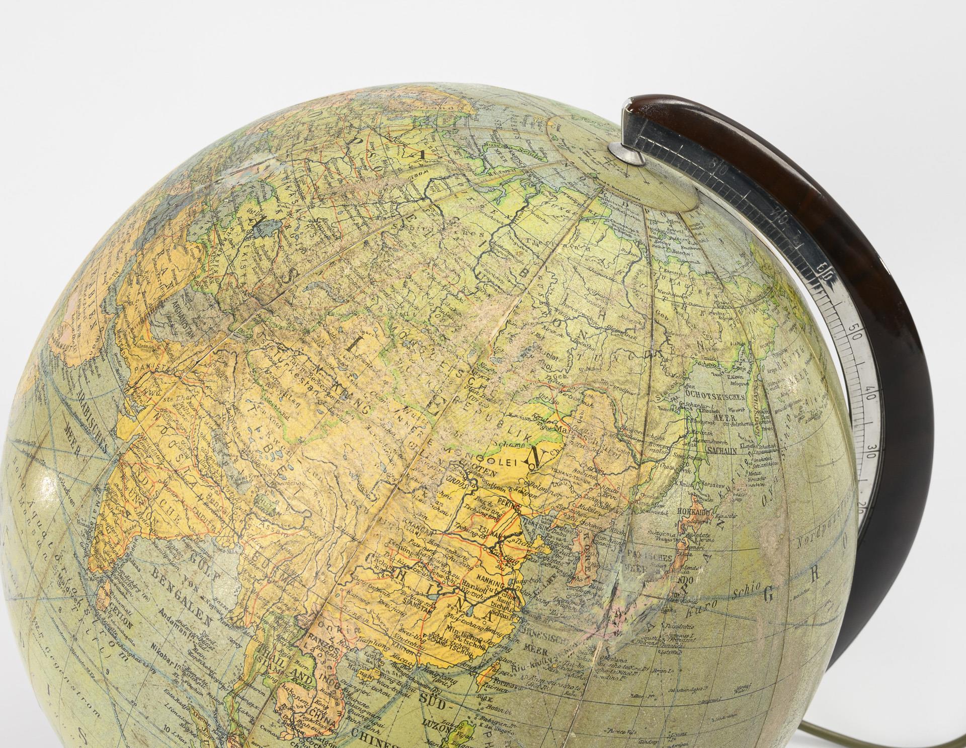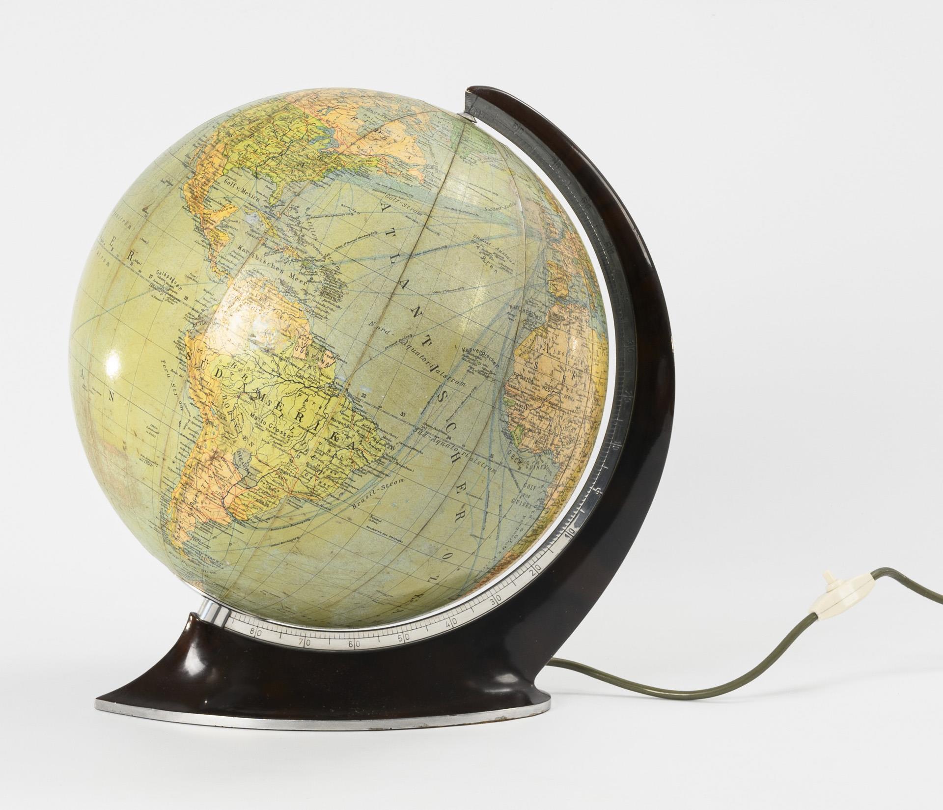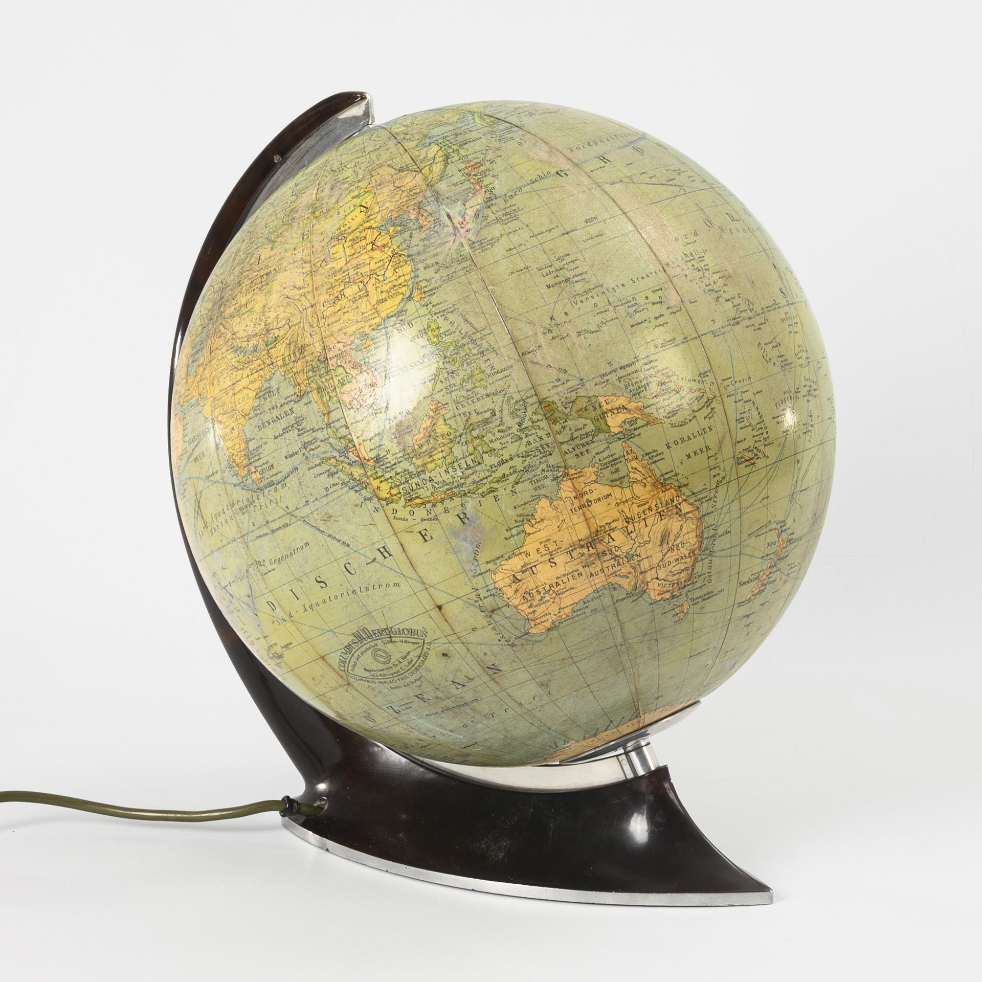 Political and physical. System: Villinger. Edited by Dr. R. Neuse and cartographer C. Luther. Columbus Verlag Paul Oestergaard, Berlin and Stuttgart. On spherical base and with degree curve. Lighting works. Rubbed, wiring renewed.