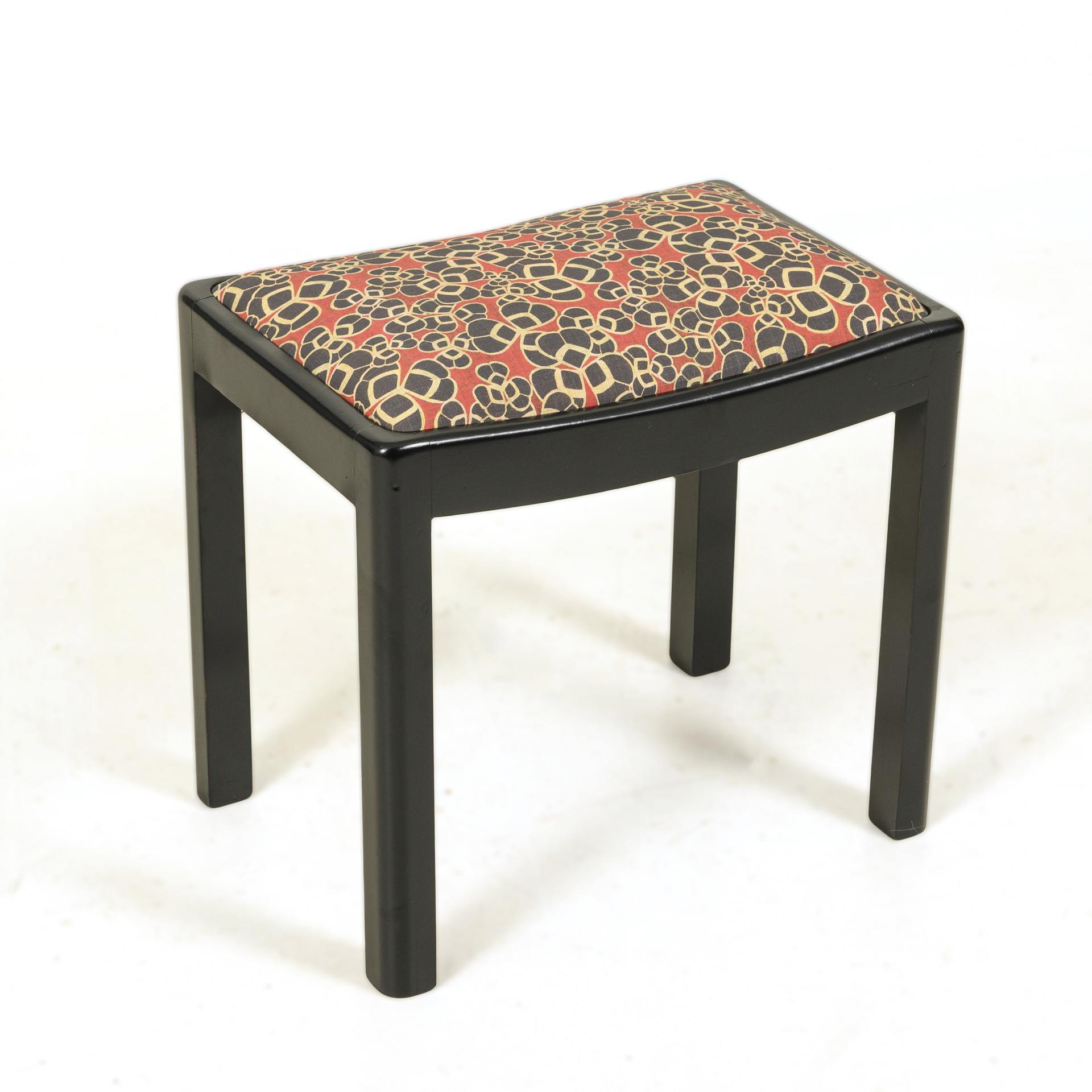 Rectangular stool with upholstered seat and added, stylized floral patterned fabric after a design by the Wiener Werkstätten, on 4 straight legs.
