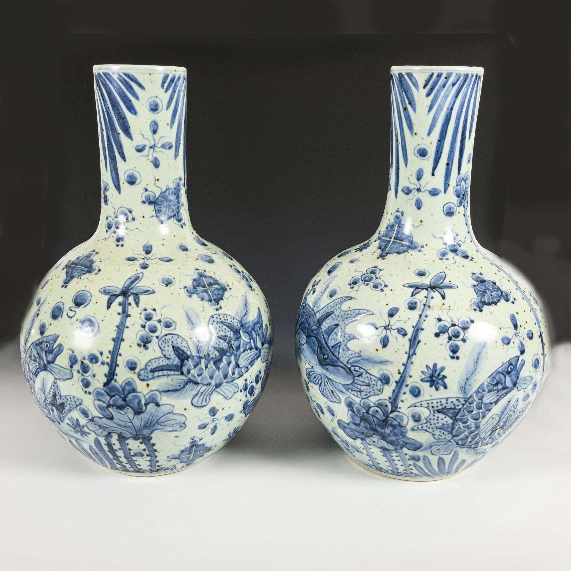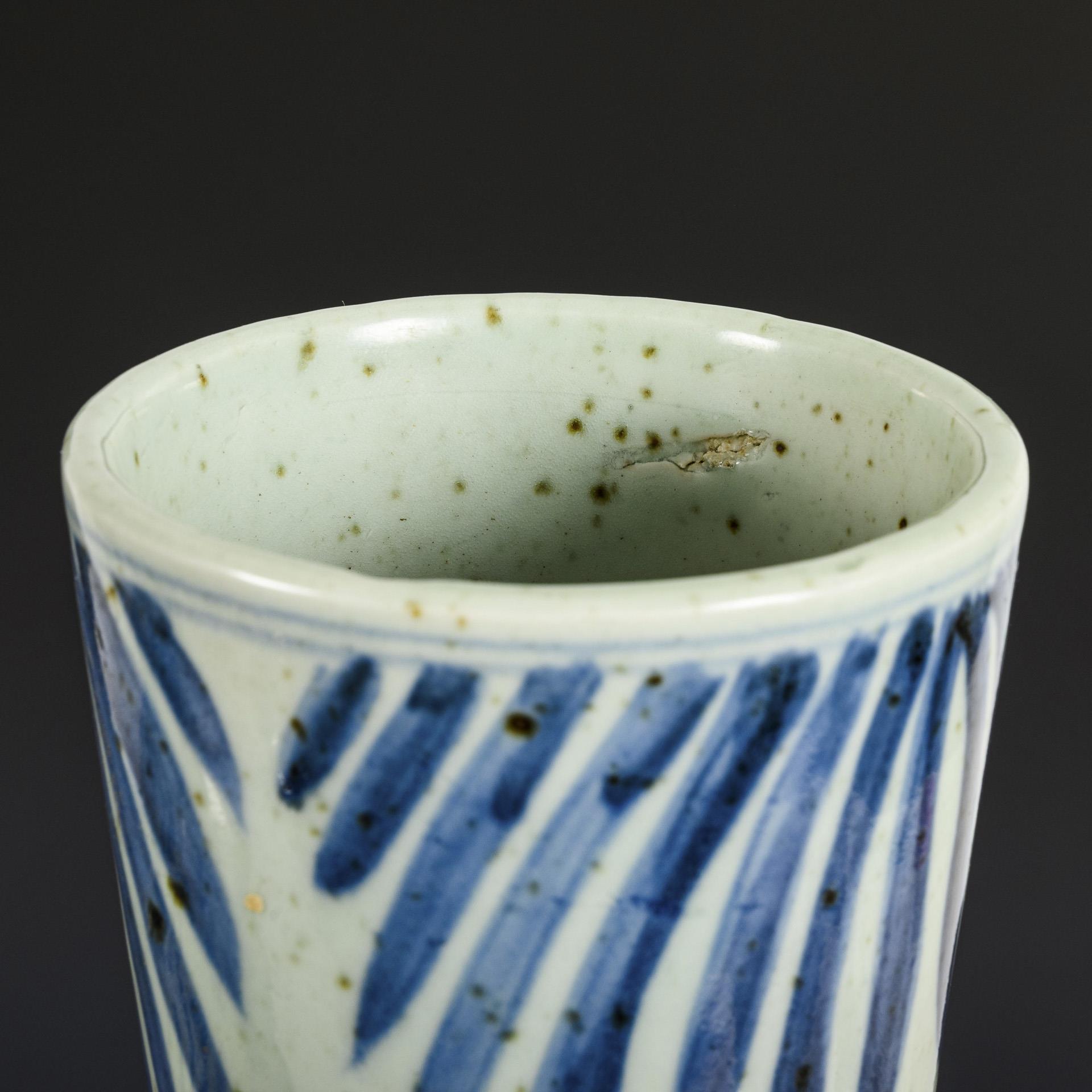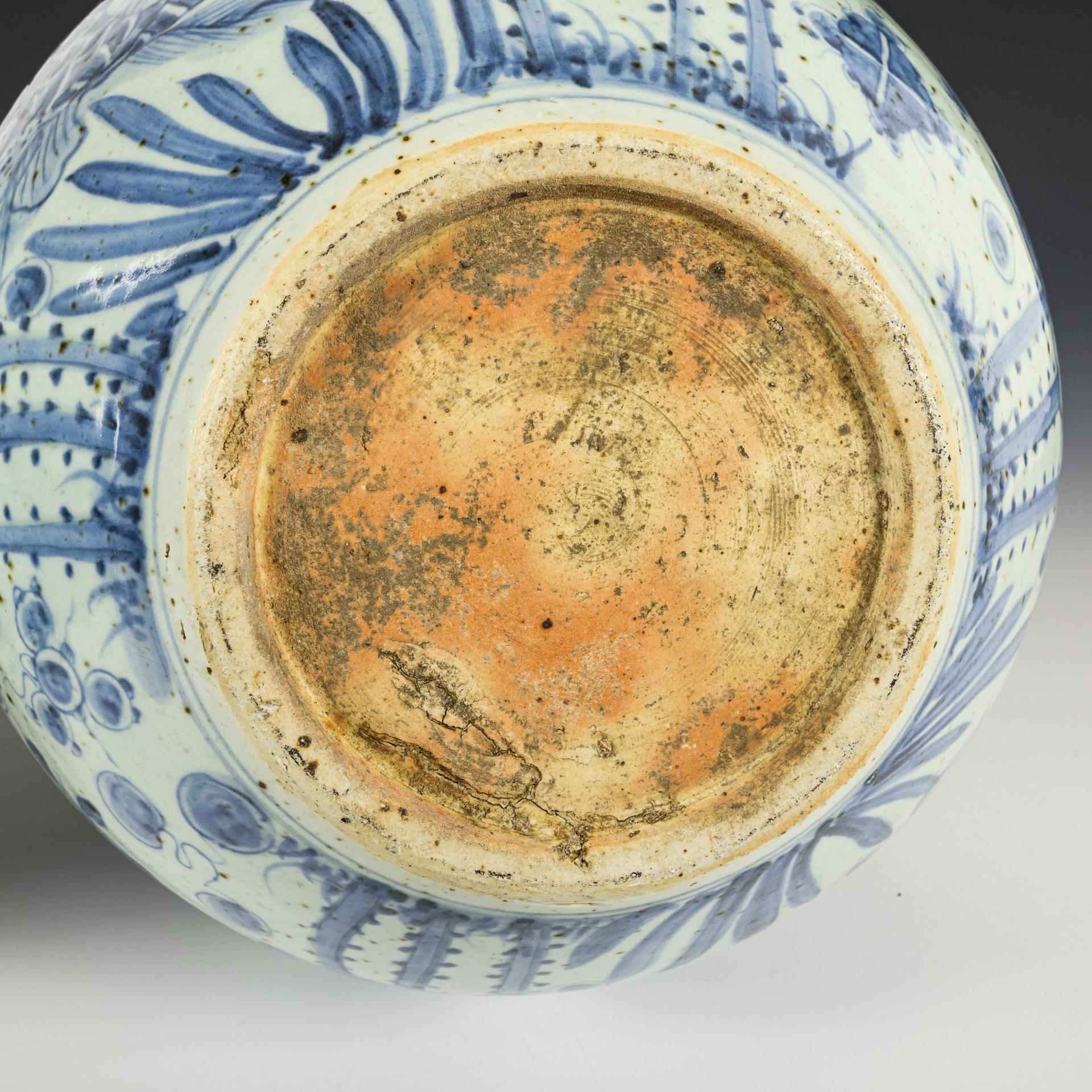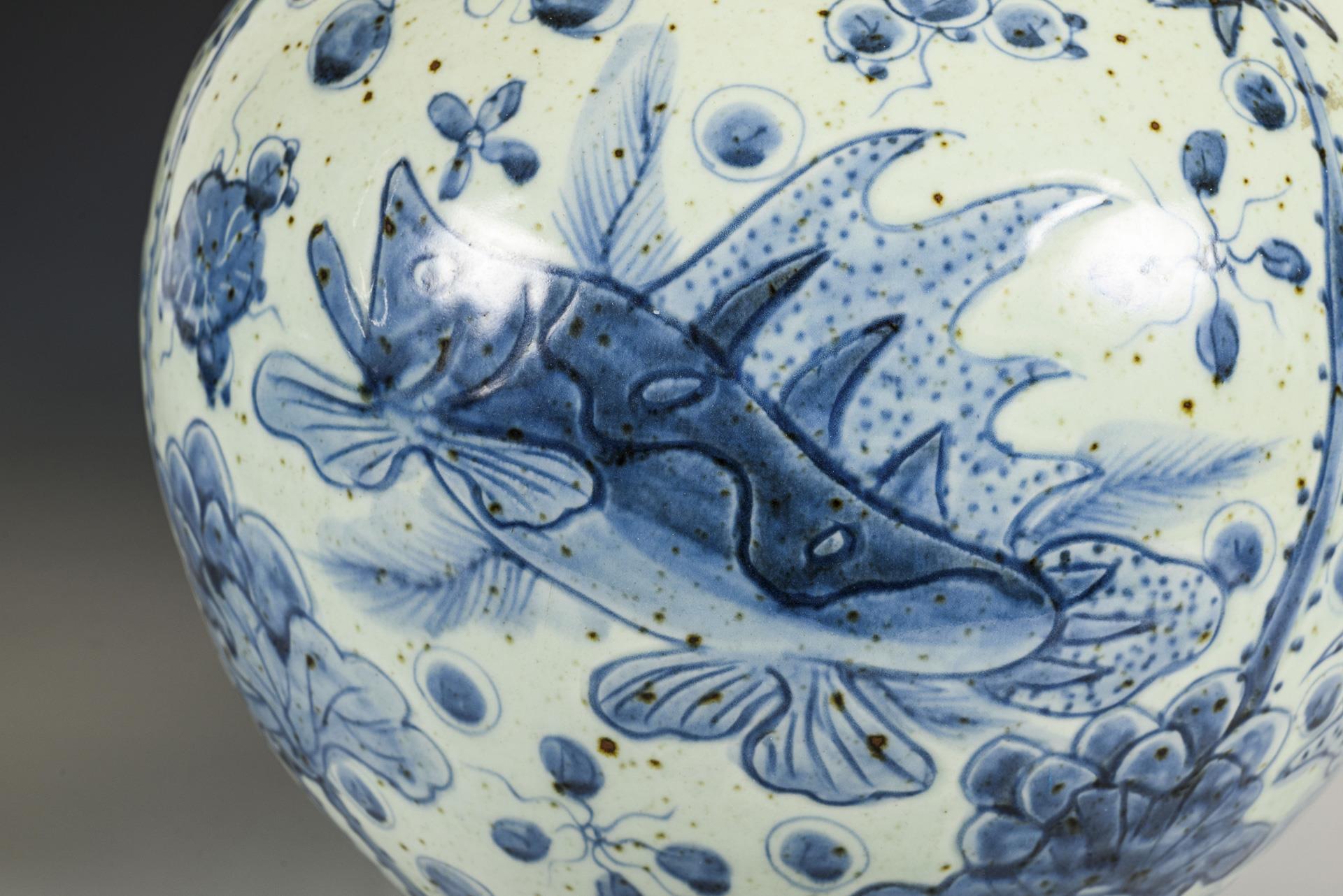 Wall decoration: Pikeperch between water lilies and tadpoles. Fish and plant depiction weakly textured. Partially gray to reddish fired body, base somewhat uncleanly worked. Many even firing marks in the glaze.