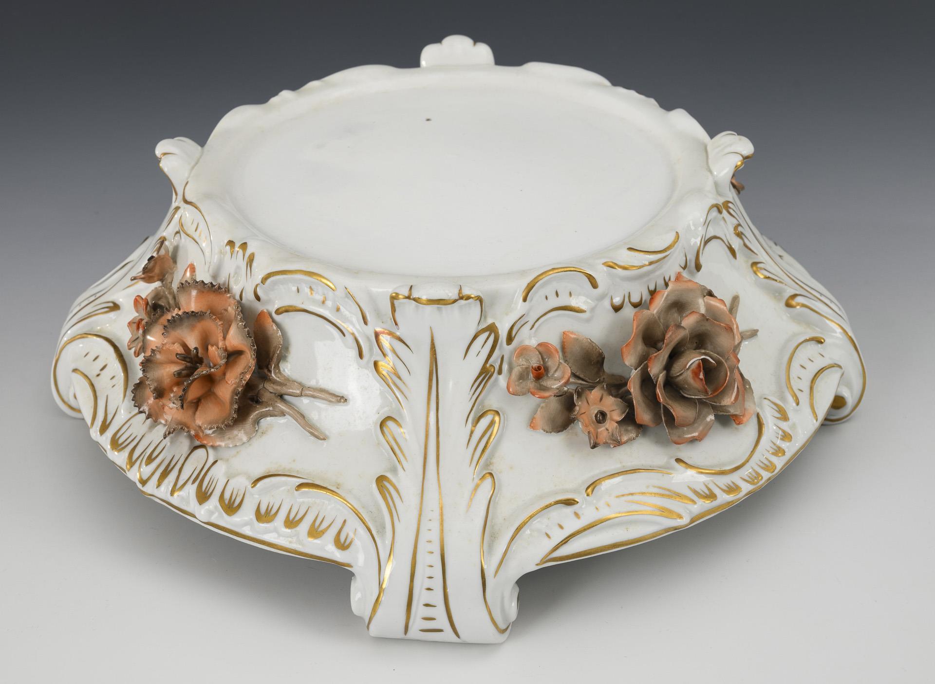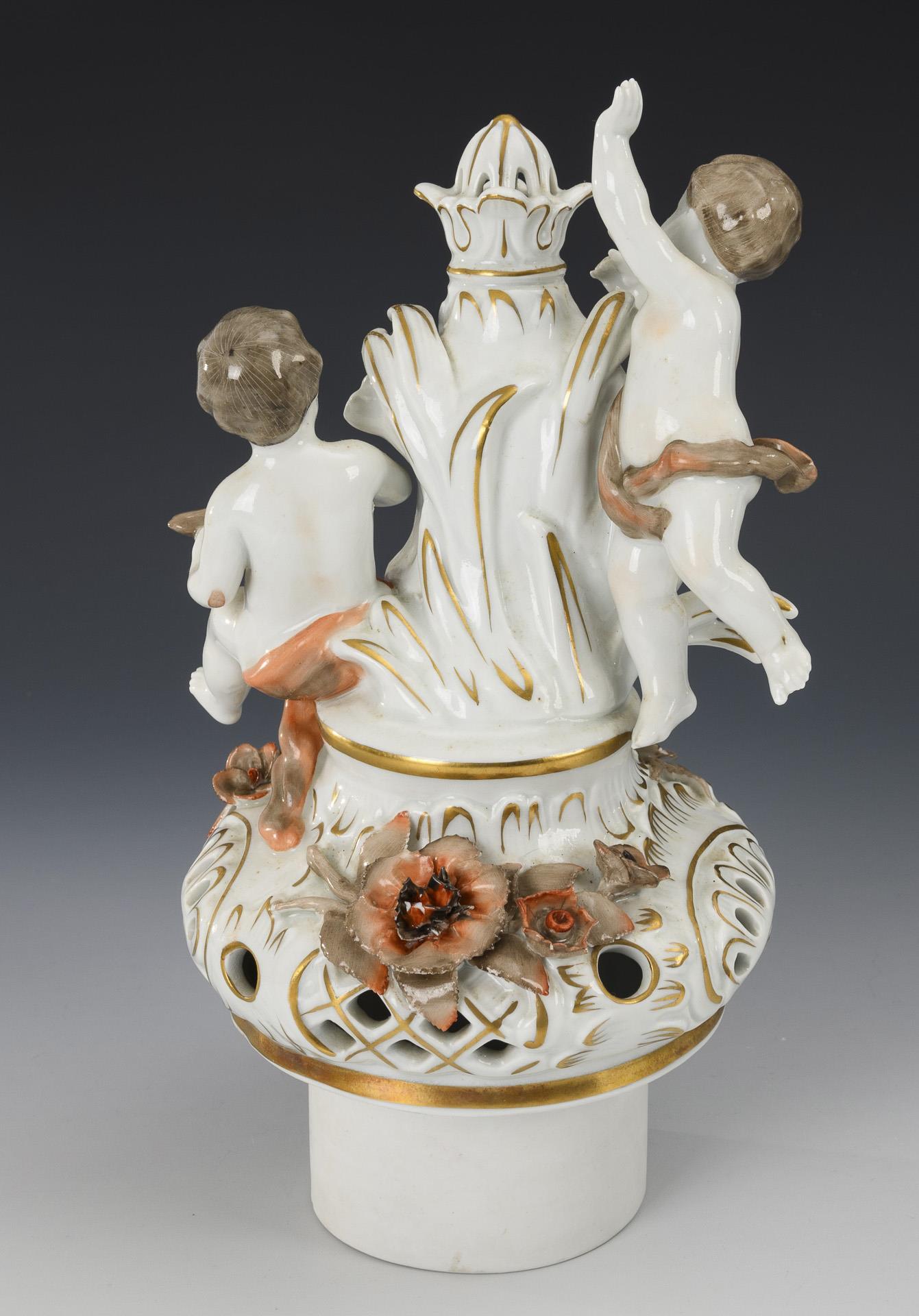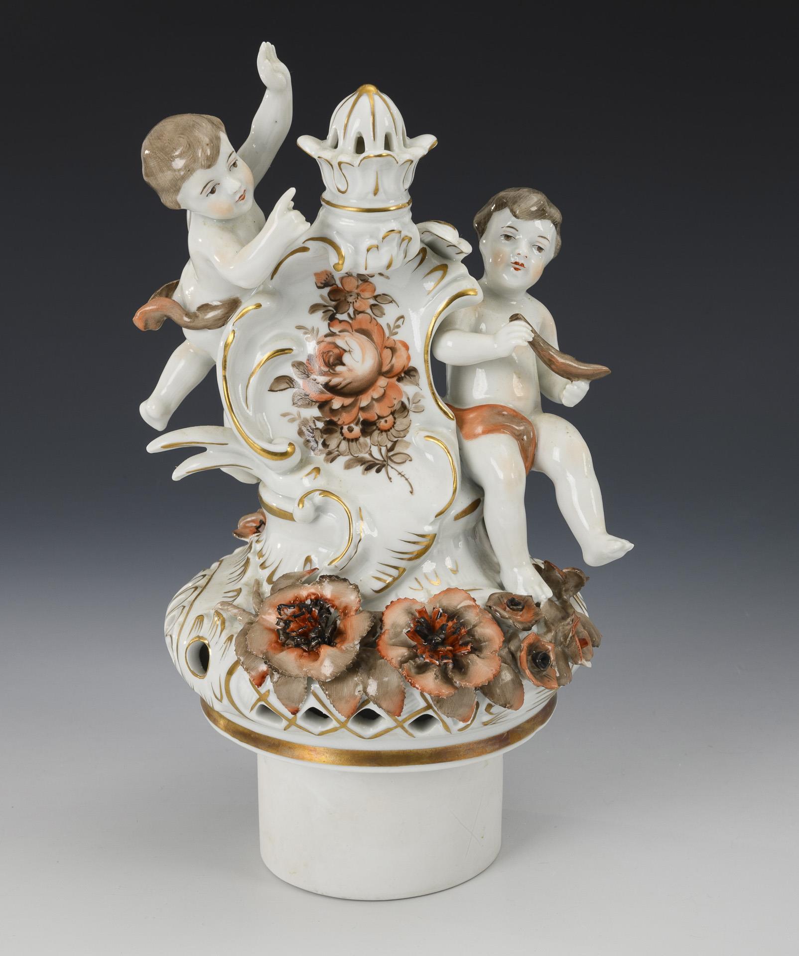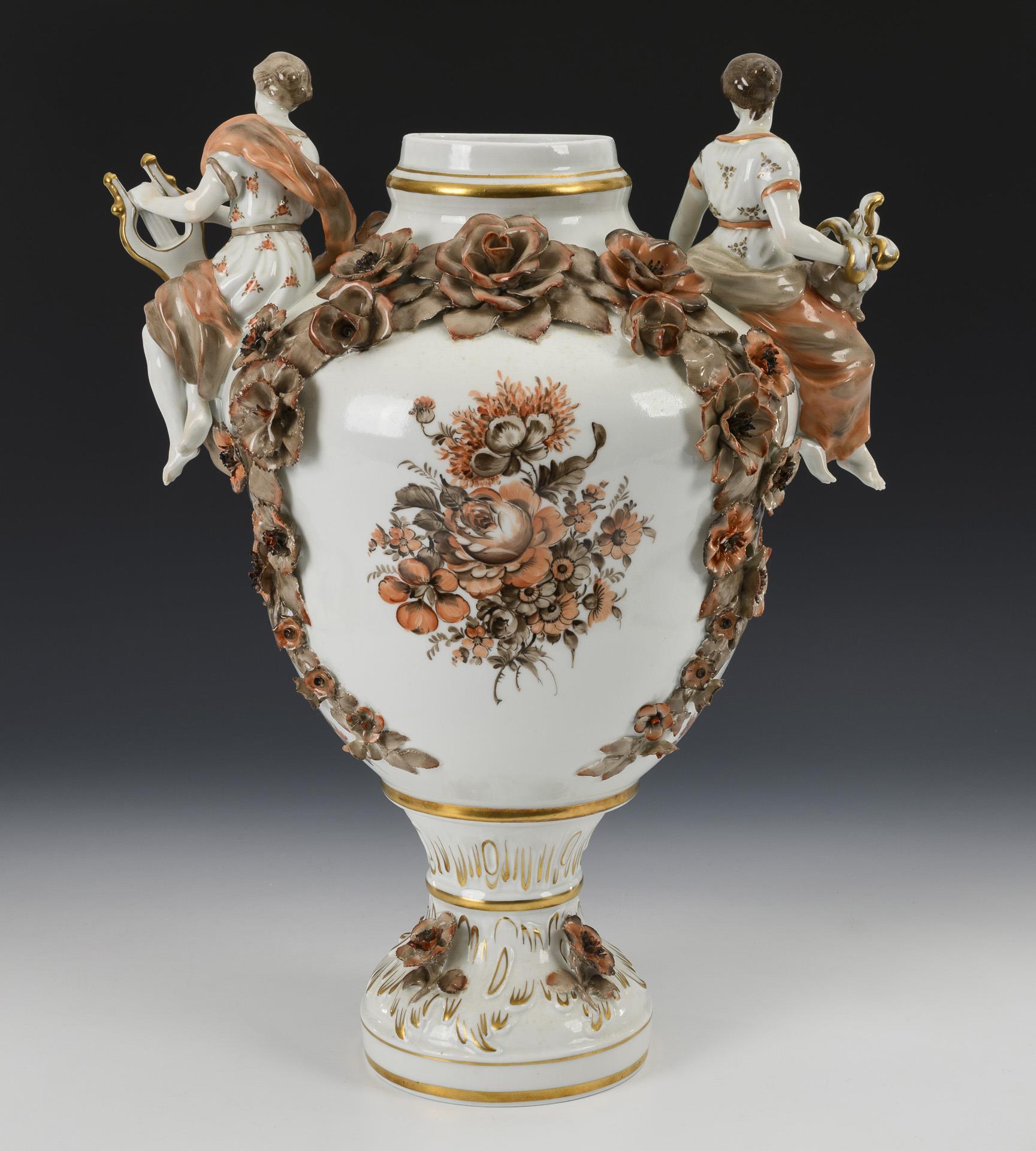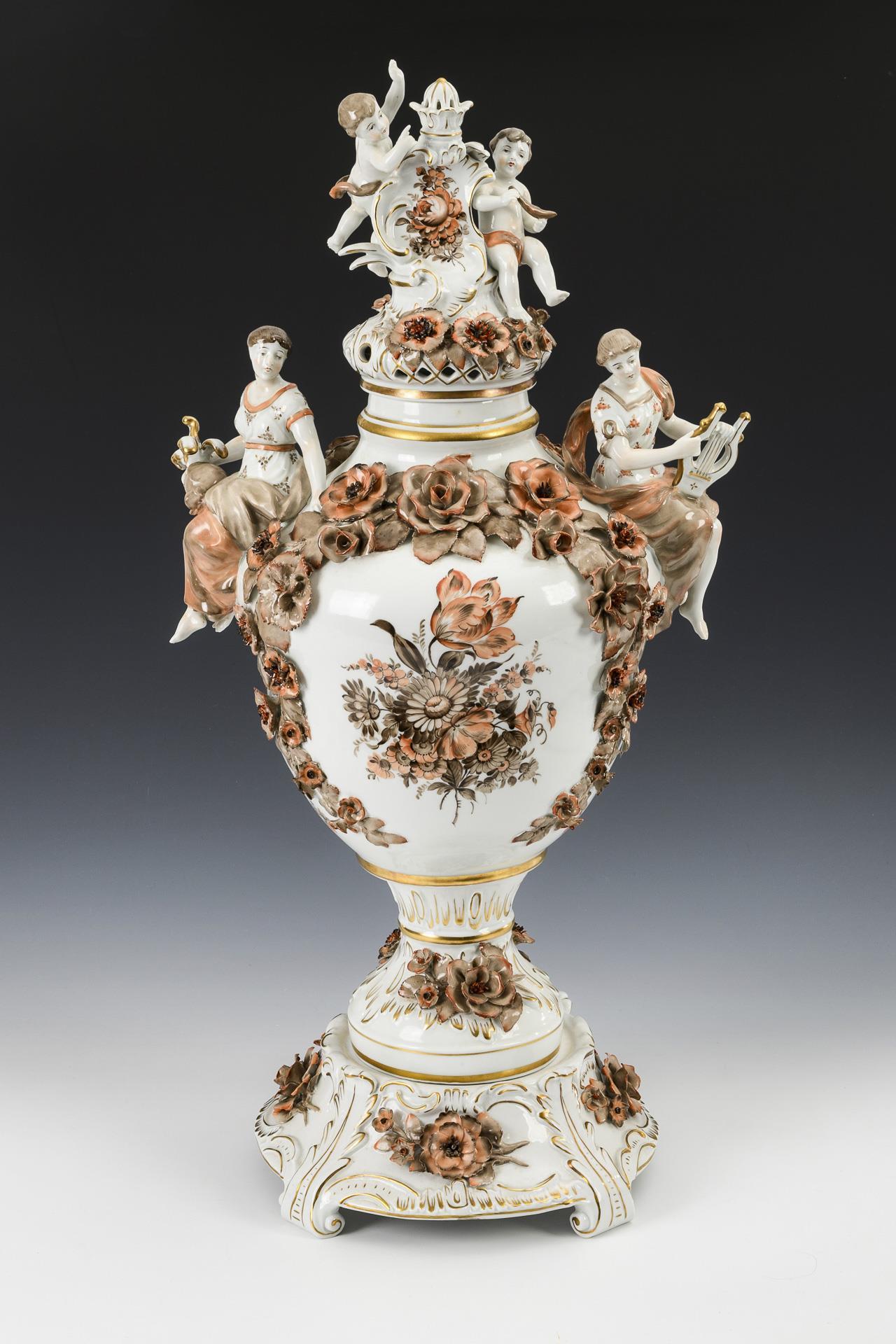 Richly floral baluster body with two female figures seated on the shoulder with helmet and lyre, high lid with two putti seated on a crowned rocaille shield. With a four-footed base. The front with a bouquet of flowers painted in shades of brown and red, decorated in brown, red and gold. Minimal chips to the lining, small chips to the rim.