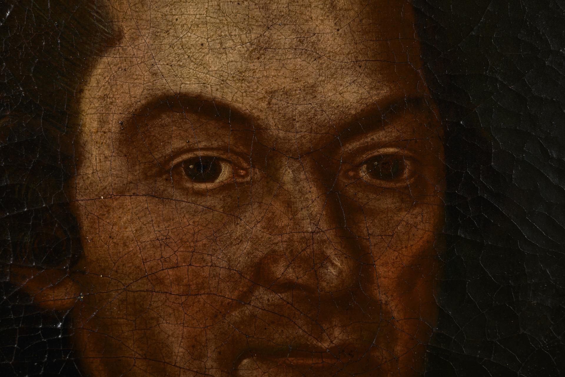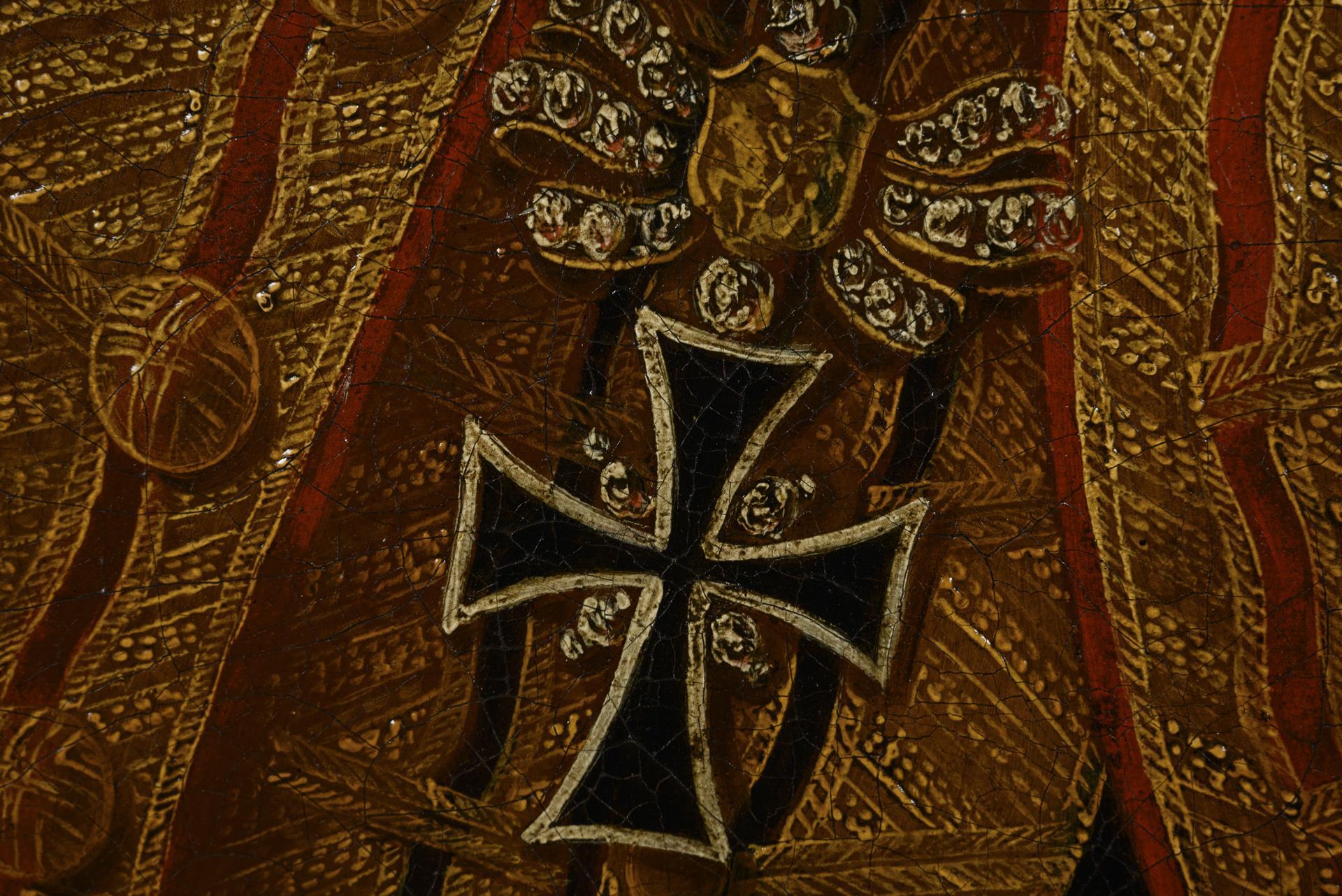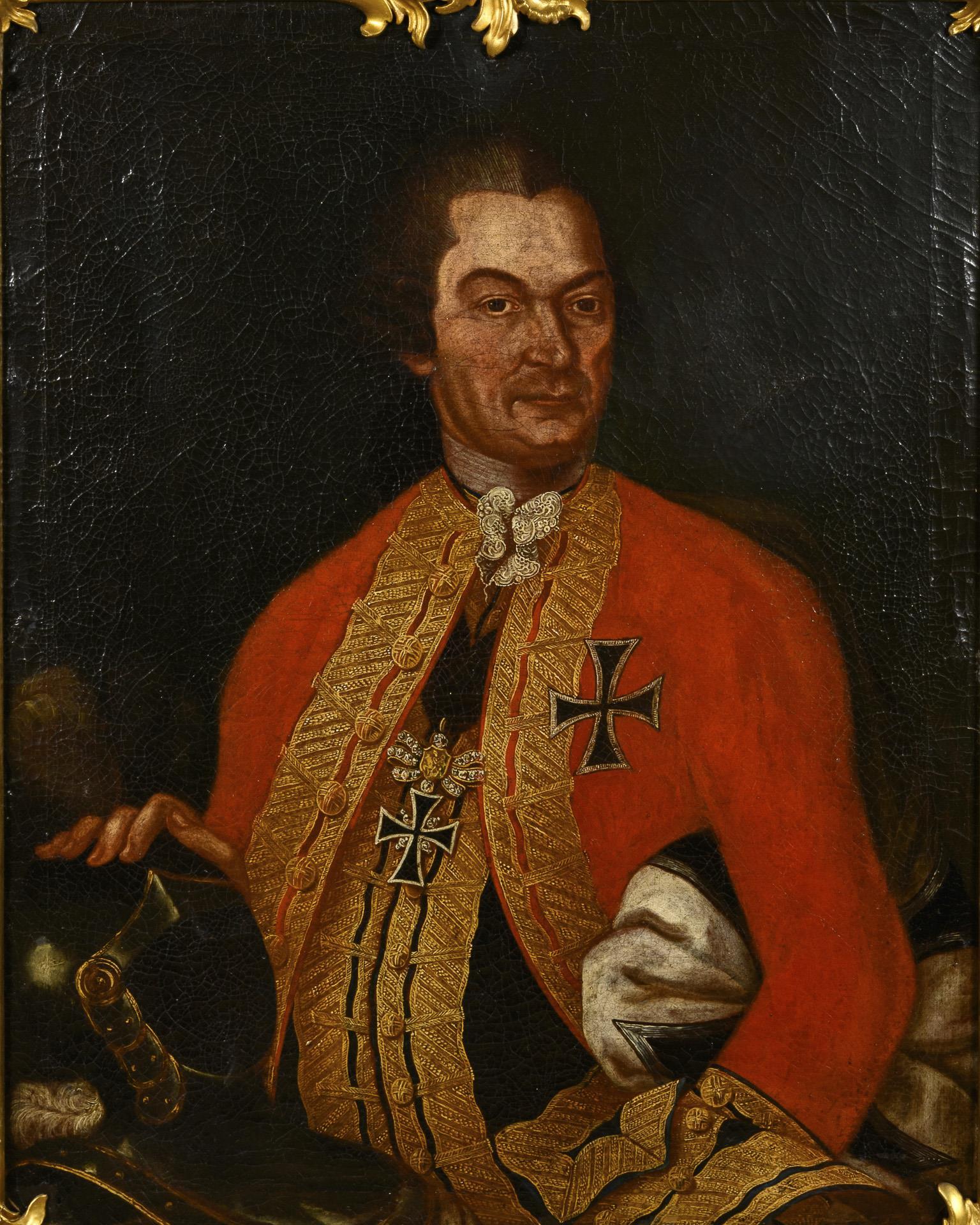 Portrait of the nobleman (1719 - 1803) in a red frock coat with gold brocade, dark plaited wig and helmet against a dark background. His membership of the Teutonic Order, which he joined at the age of 24 and initially pursued a military career, is clearly visible, but after years and due to illness he finally switched to the administration of the same. Significant traces of age.