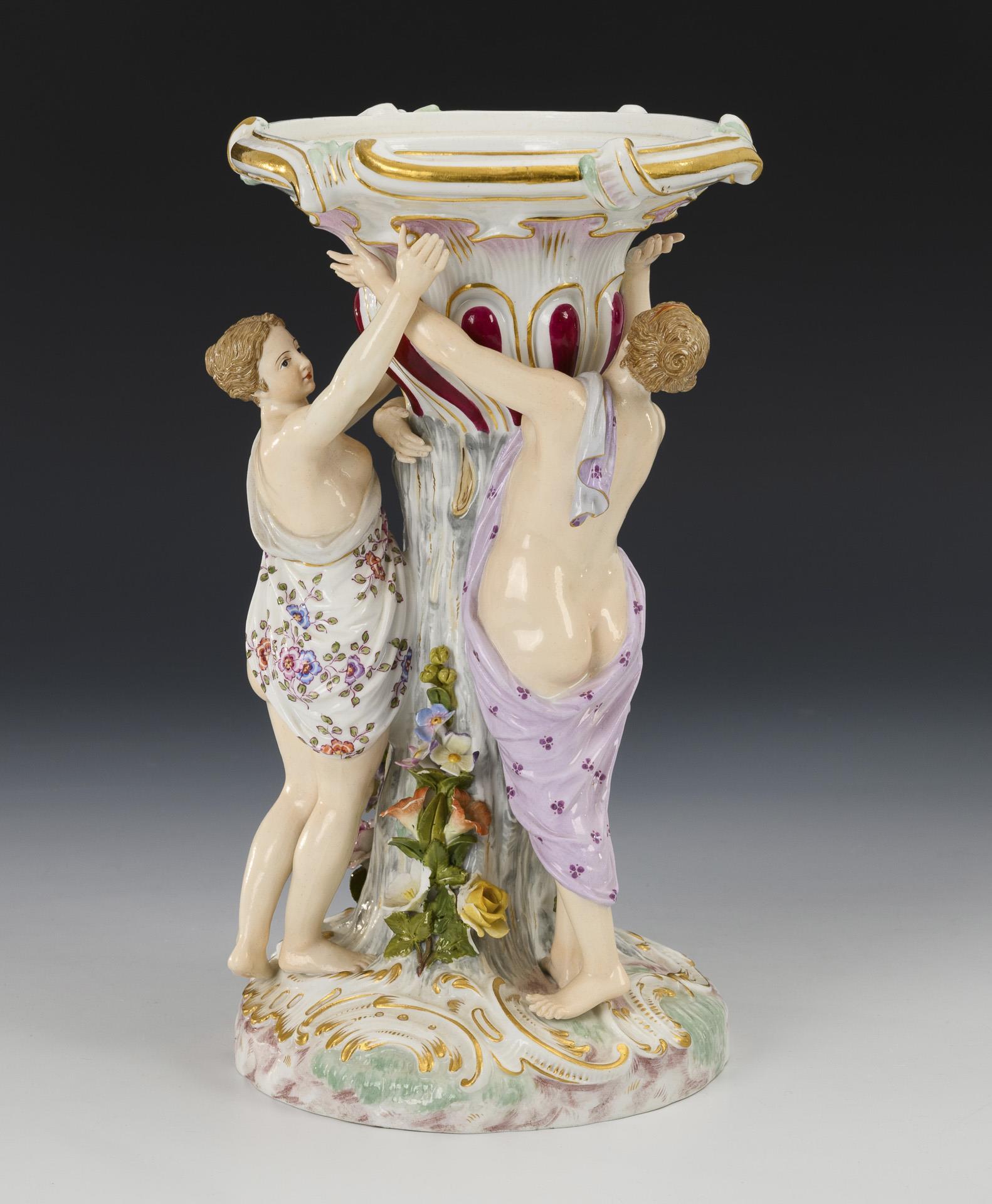 Three women standing at a flower-covered tree trunk, rocaille base. Without top bowl, some flowers chipped.