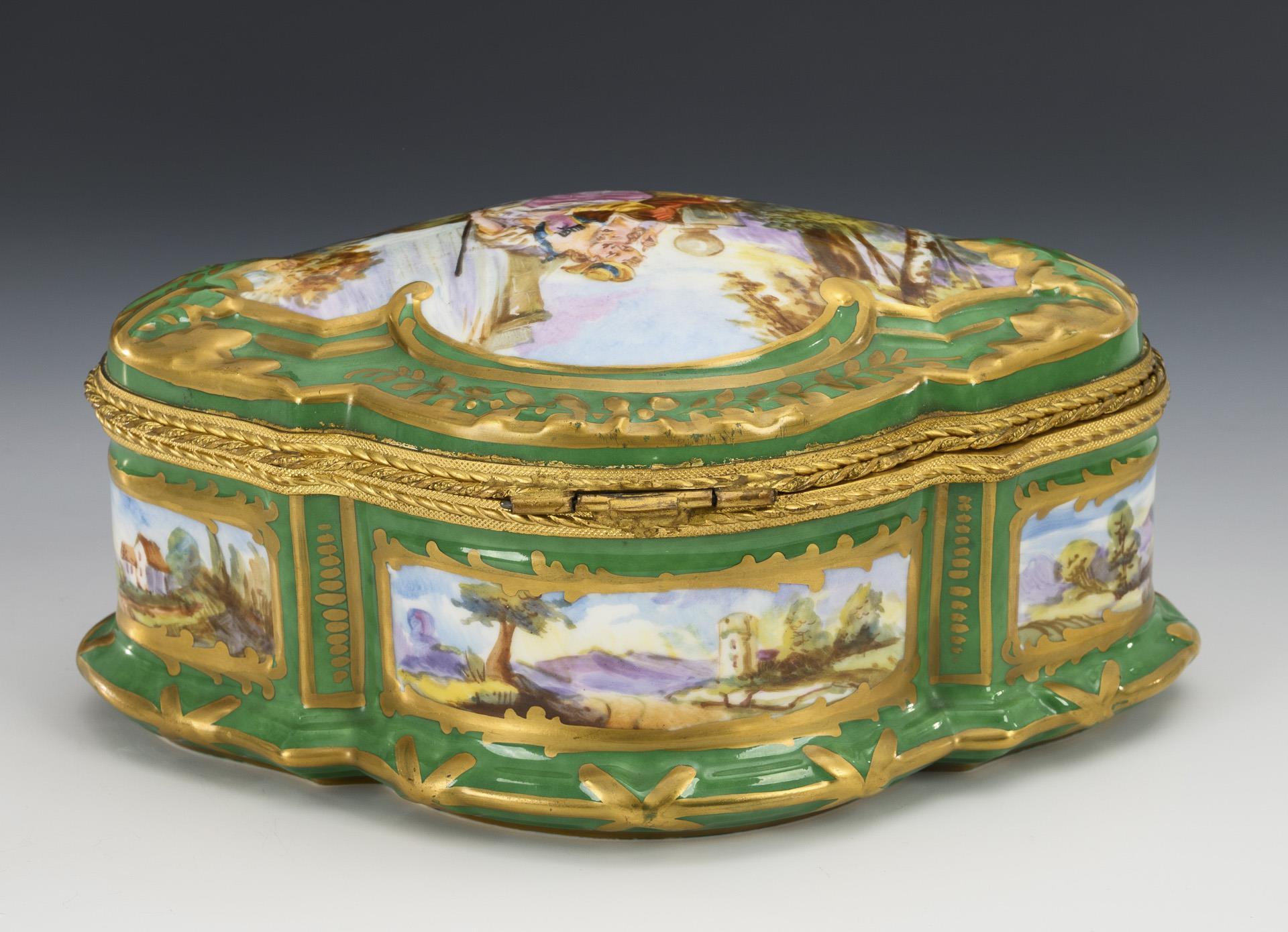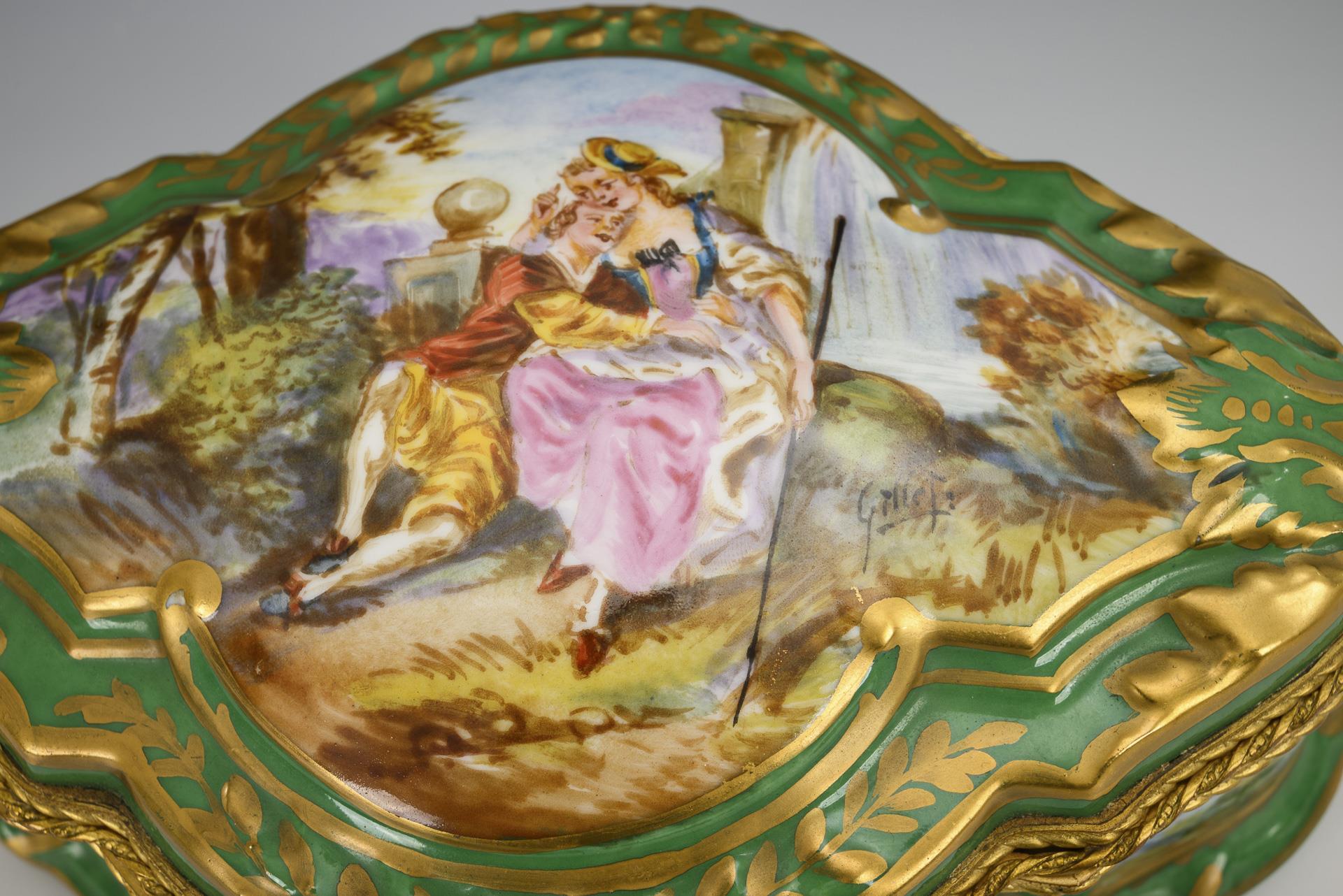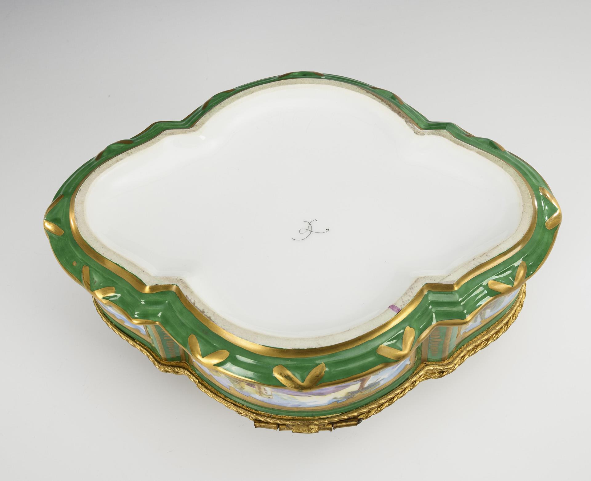 Quatrefoil box with metal-mounted hinged lid. Green ground, the lid depicting a gallant scene, the body with rectangular cartouches with landscape painting.