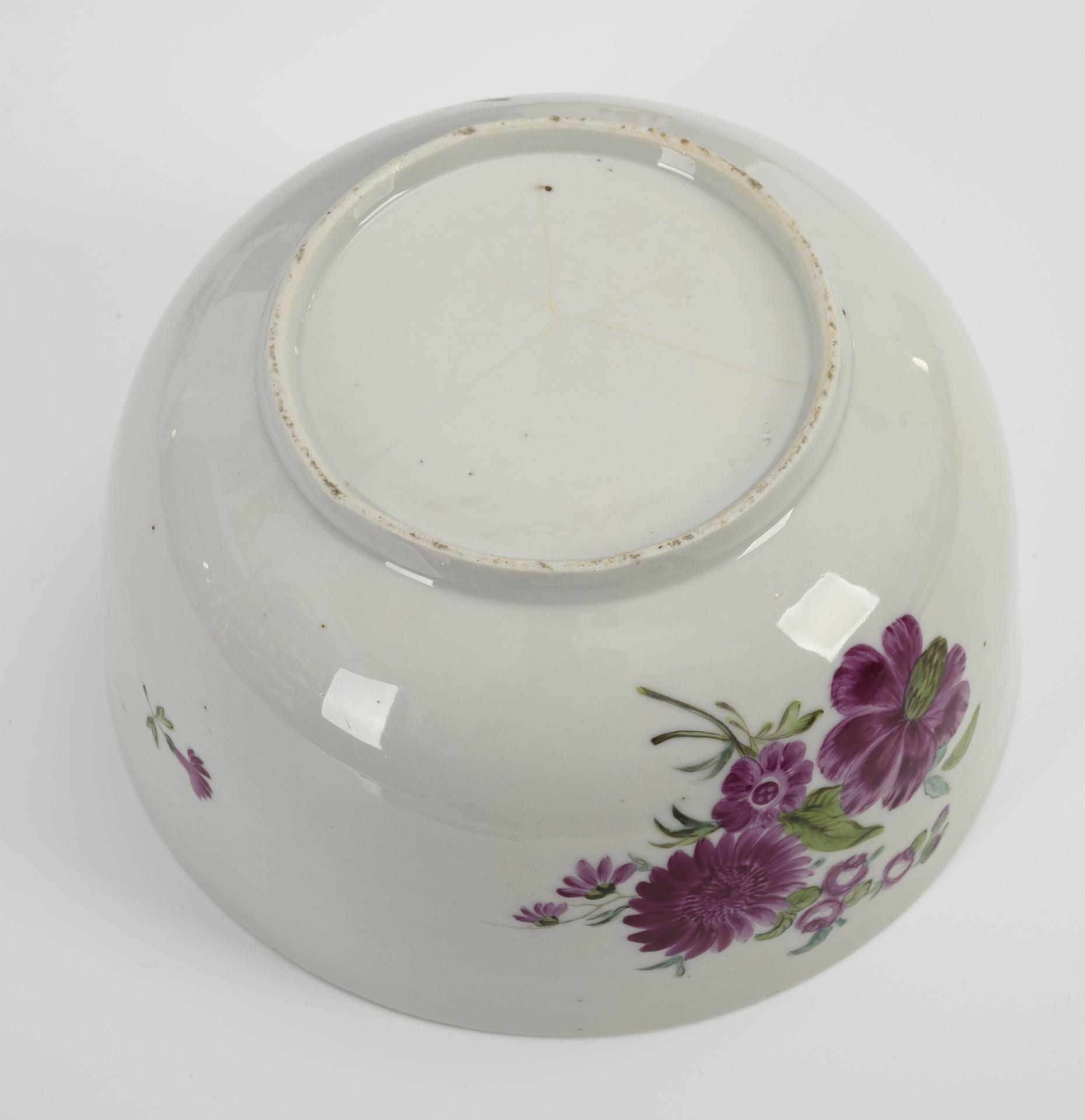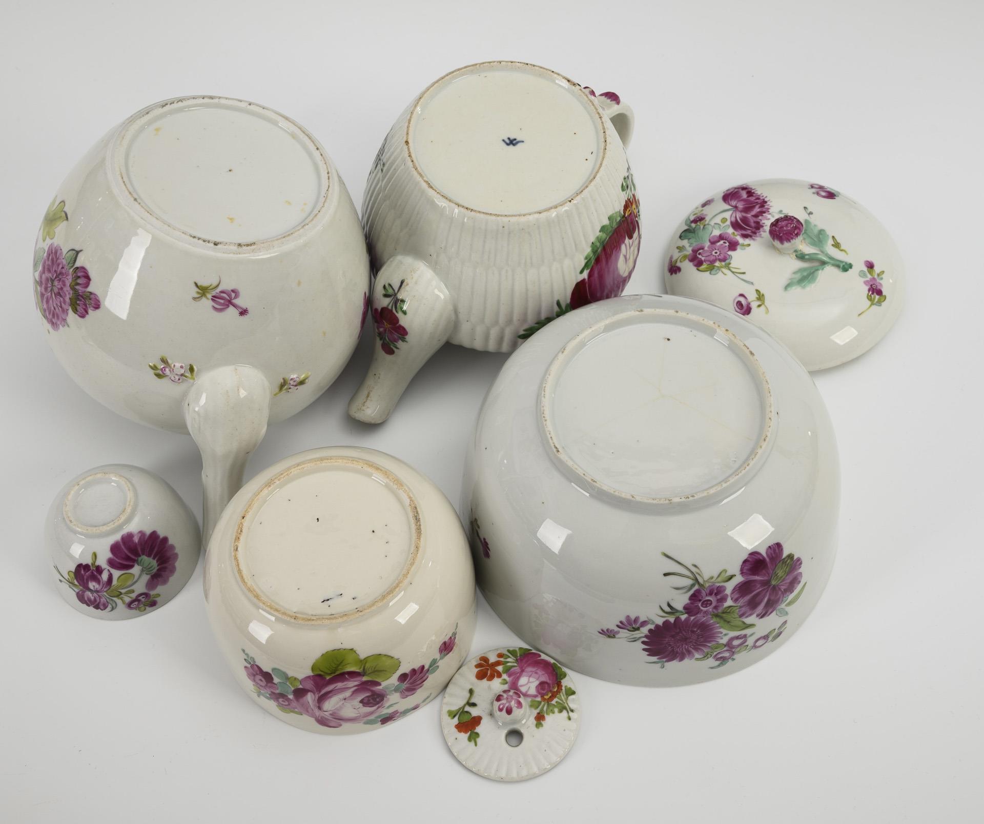 4 pieces, unmarked, with smooth walls and flower bouquets in purple and green: teapot (H 13 cm), sugar bowl (H 10 cm), bowl (Ø 16 cm) and small bowl (H 4 cm). / 1 piece Wallendorf, model "Broken Staff" with stylized flower painting (H 11 cm). Cumbency with hairline crackle in the base, sugar bowl knob glued, minimal chips to rim of 1 teapot lid.