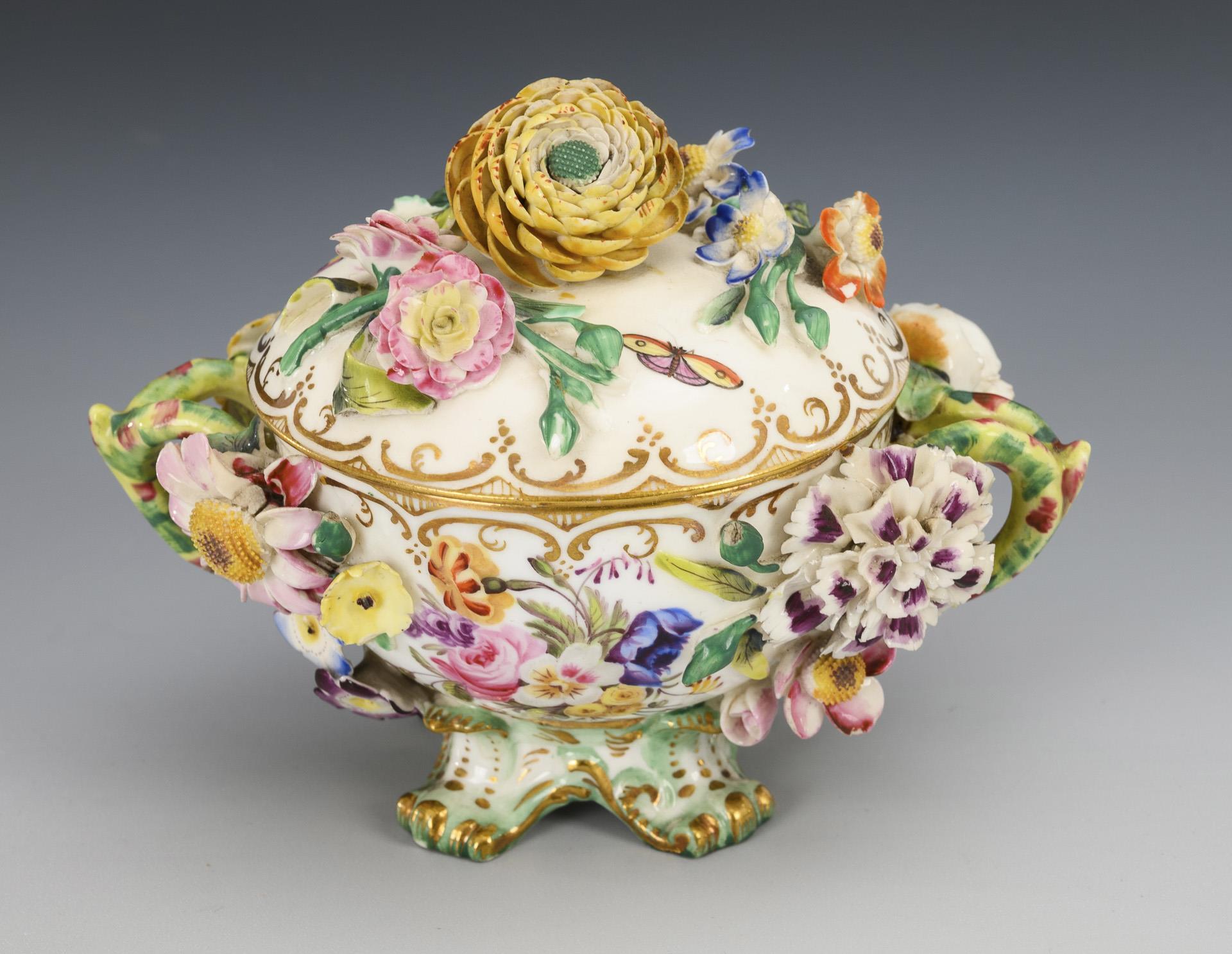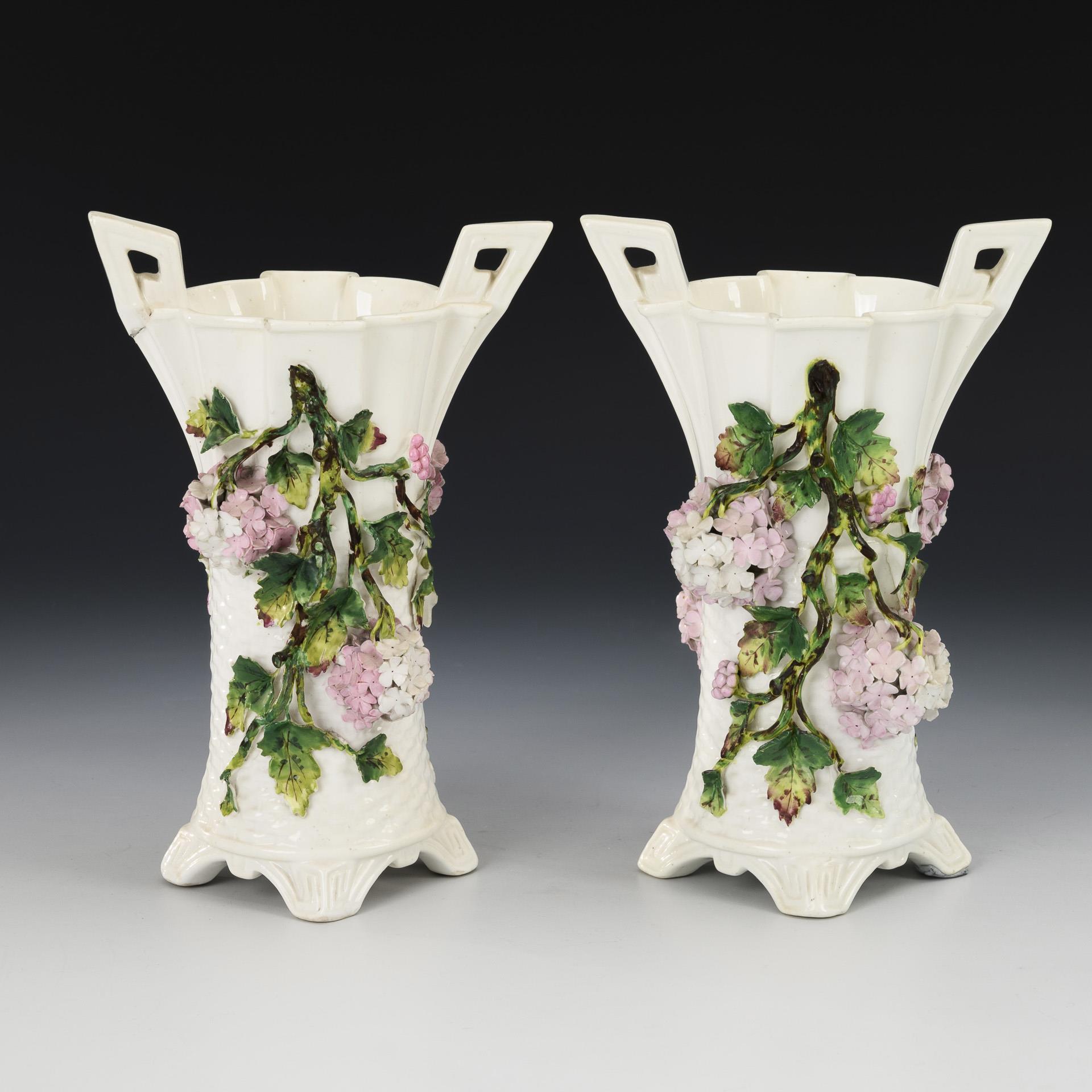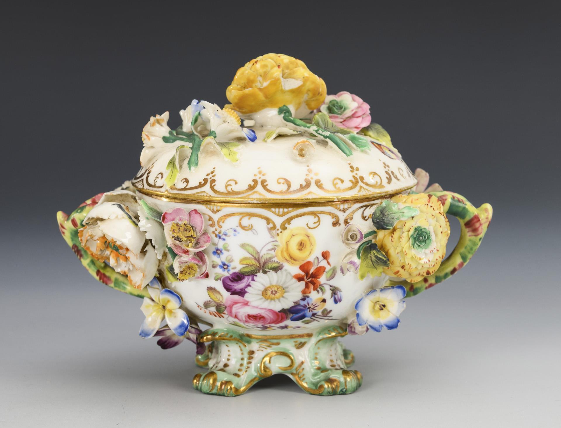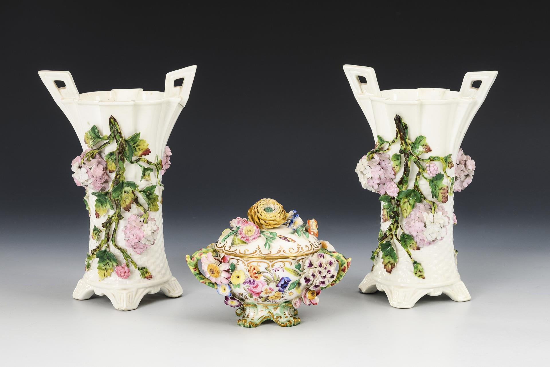 2 concave vases with basket structure, 2 angled handles and applied branches with snowball blossoms (H 19.5 cm). / 1x sugar bowl with rocaille decoration, lid, two branch handles and rich flower covering (h 10 cm). Brests glued to the lining, 1 vase handle and 1 tin leaf.