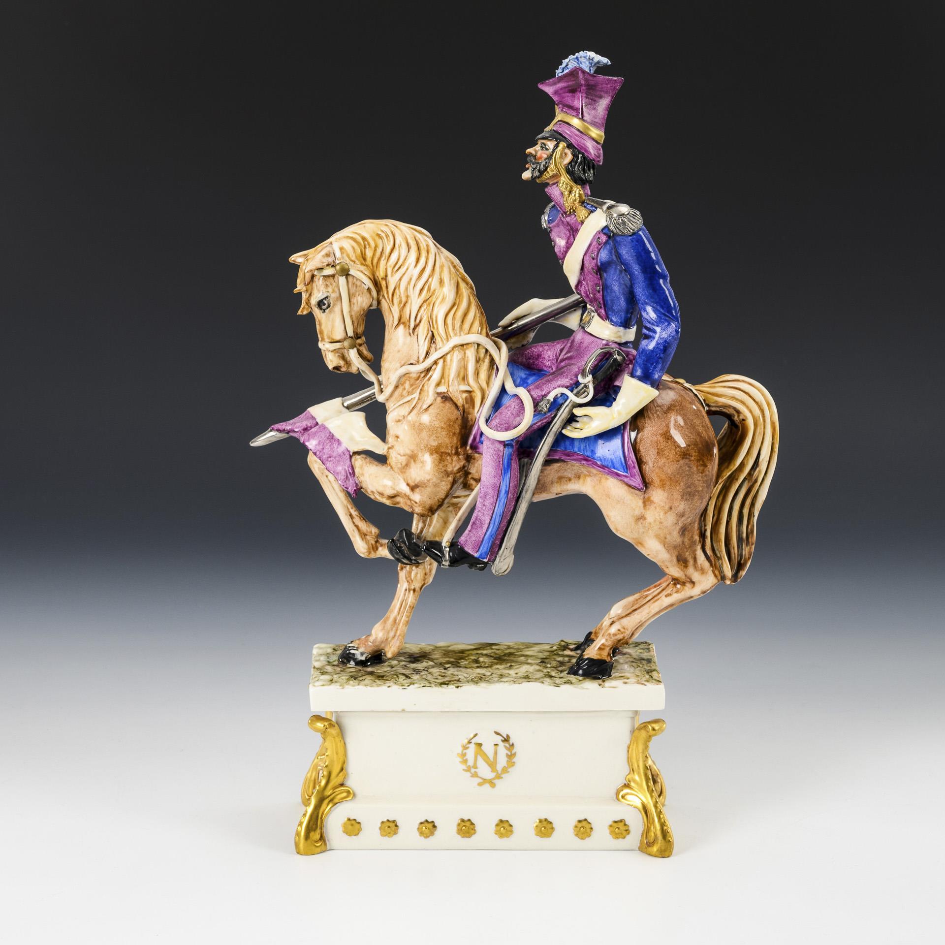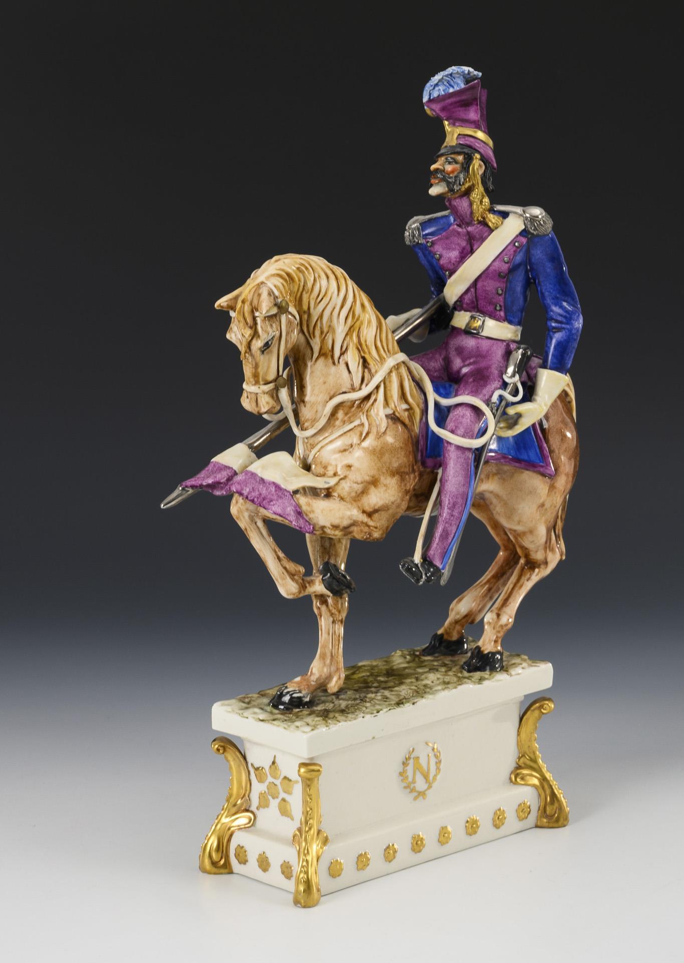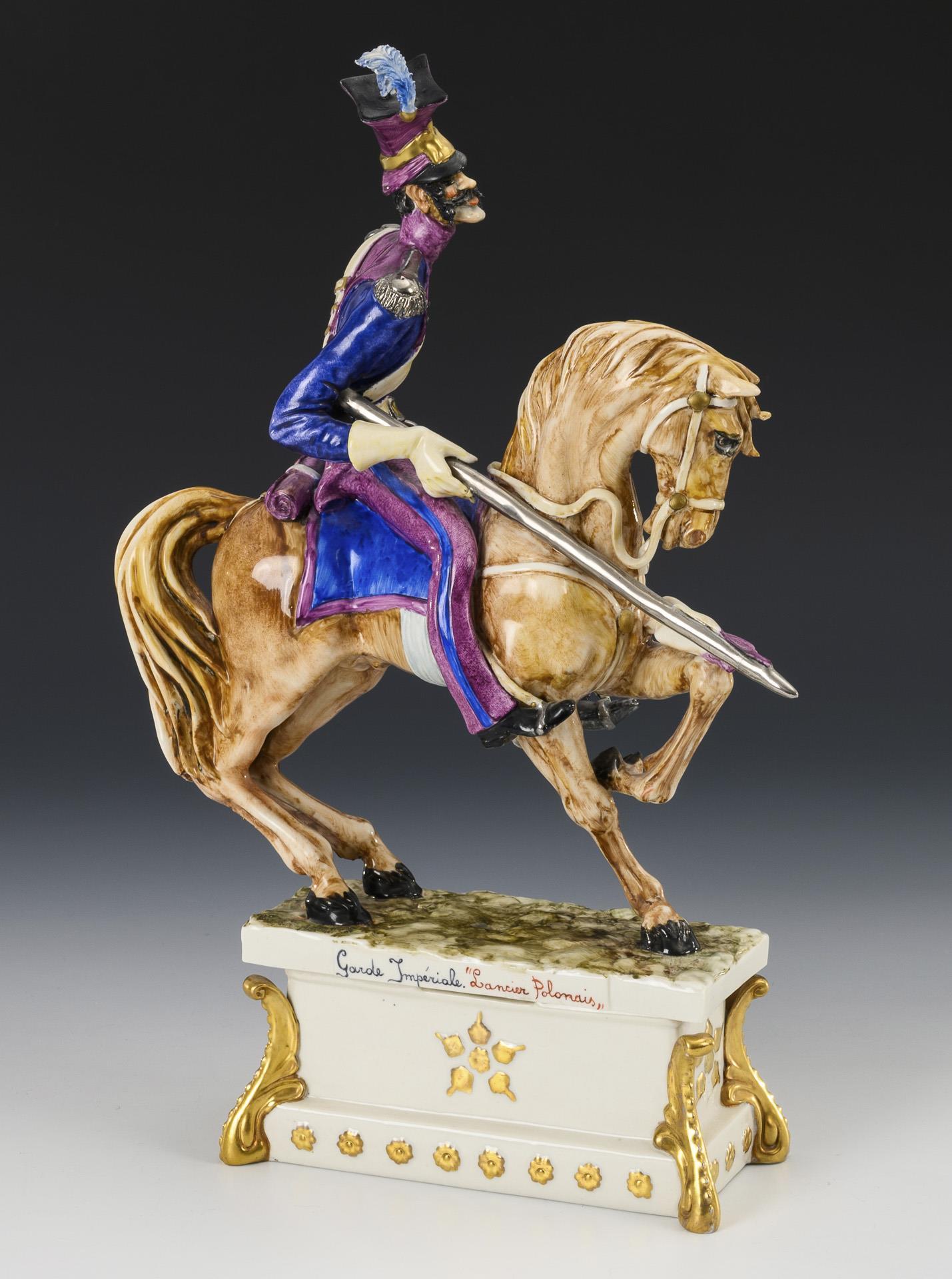Polish soldier sitting on a horse with lowered lance, on a rectangular base, verso inscribed "Garde Imperiale. 'Lancier Polonais'".