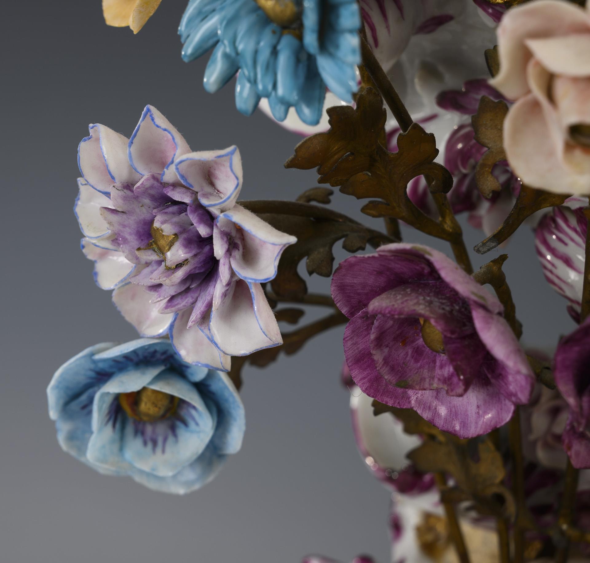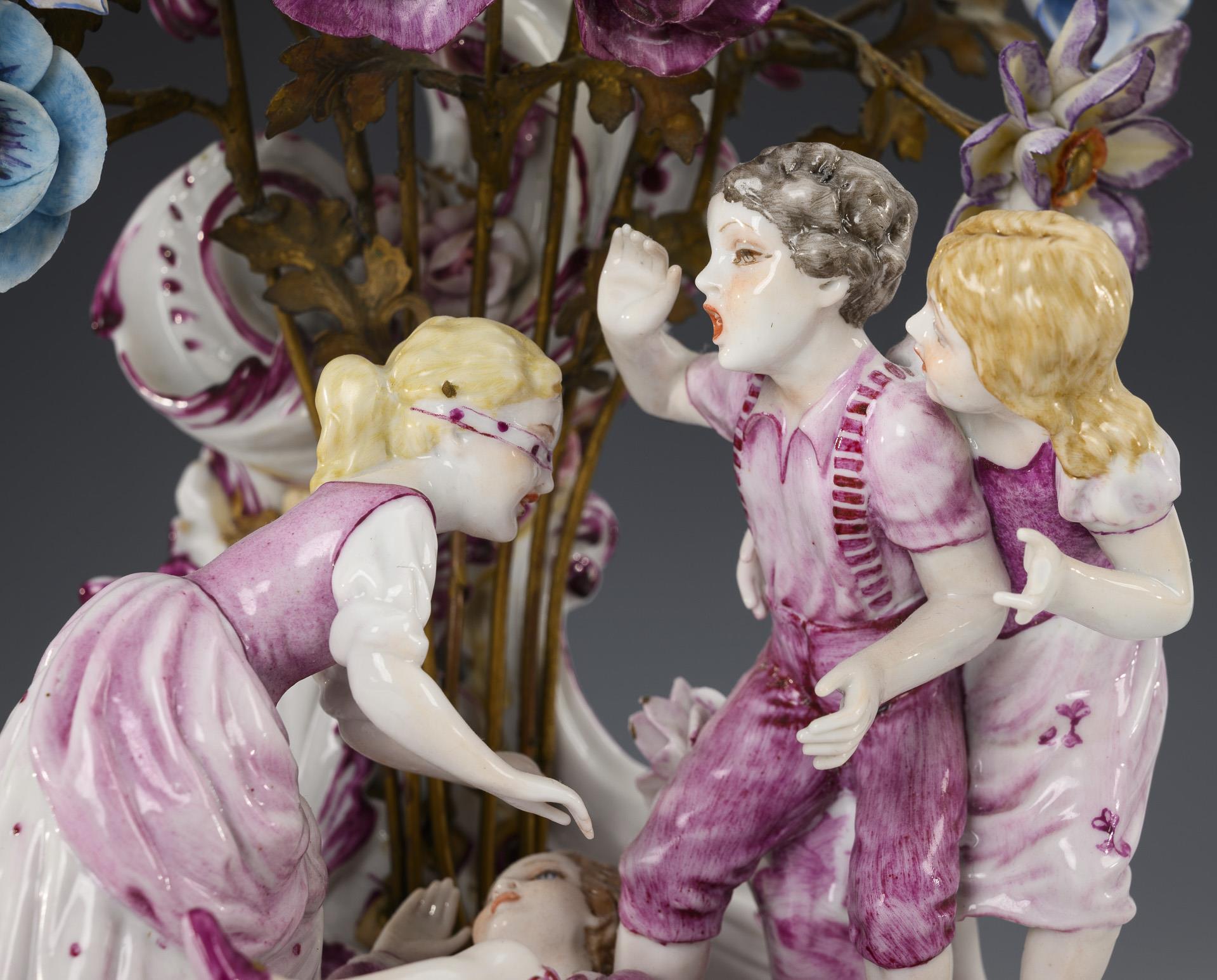 Rocaille case with battery-operated clock and flowers with metal stems; square, openwork rocaille base with four children playing blind man's bluff. 2 fingers bumped, traces of mounting between case and base.