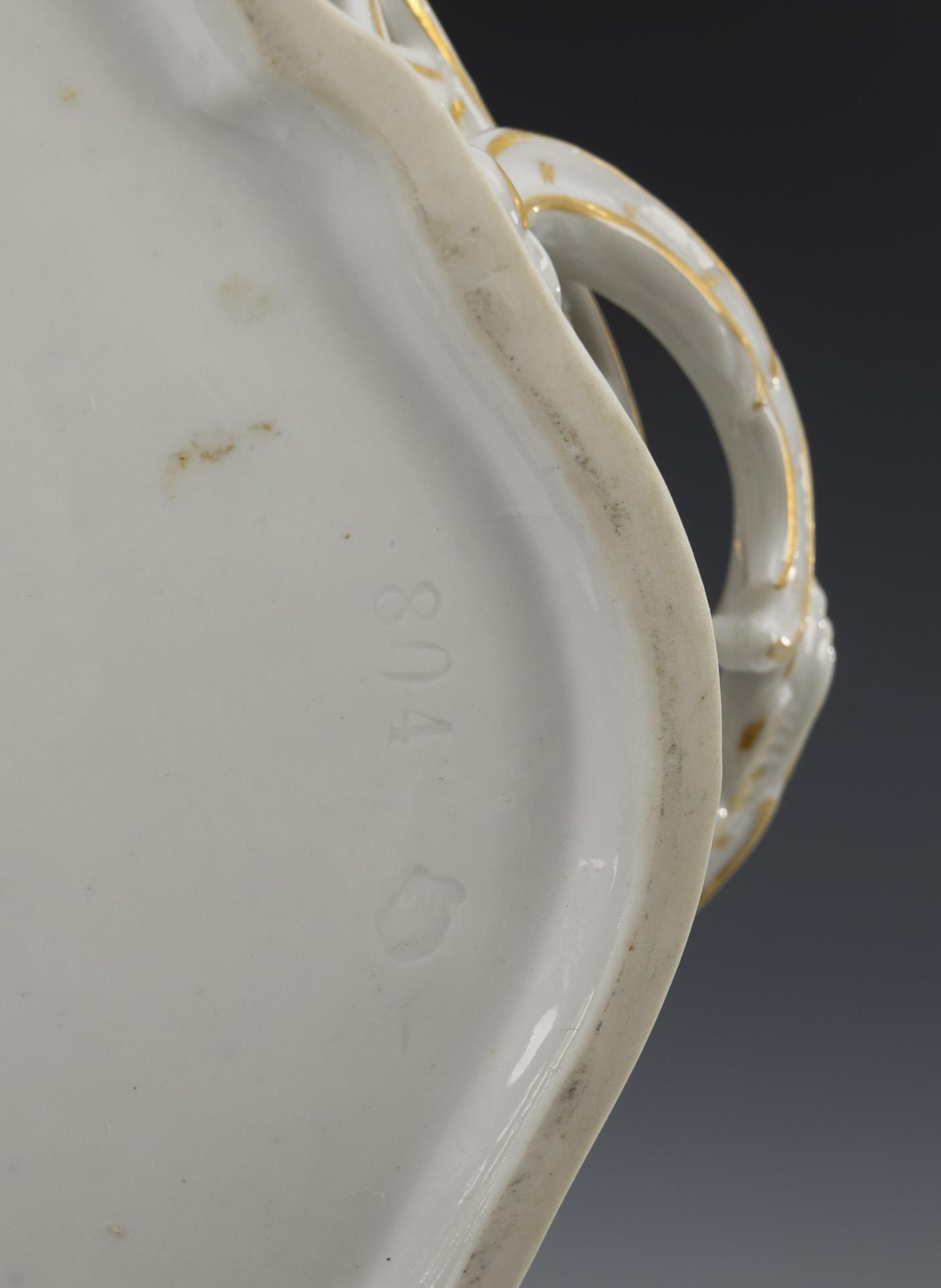 1x oval tureen with lemon pommel lid, two rocaille handles and four feet (h 16.5 cm, l 27 cm). / 1x oval fitted basket with two handles (L 27.5 cm). Minimal firing crack to the base of the tureen.