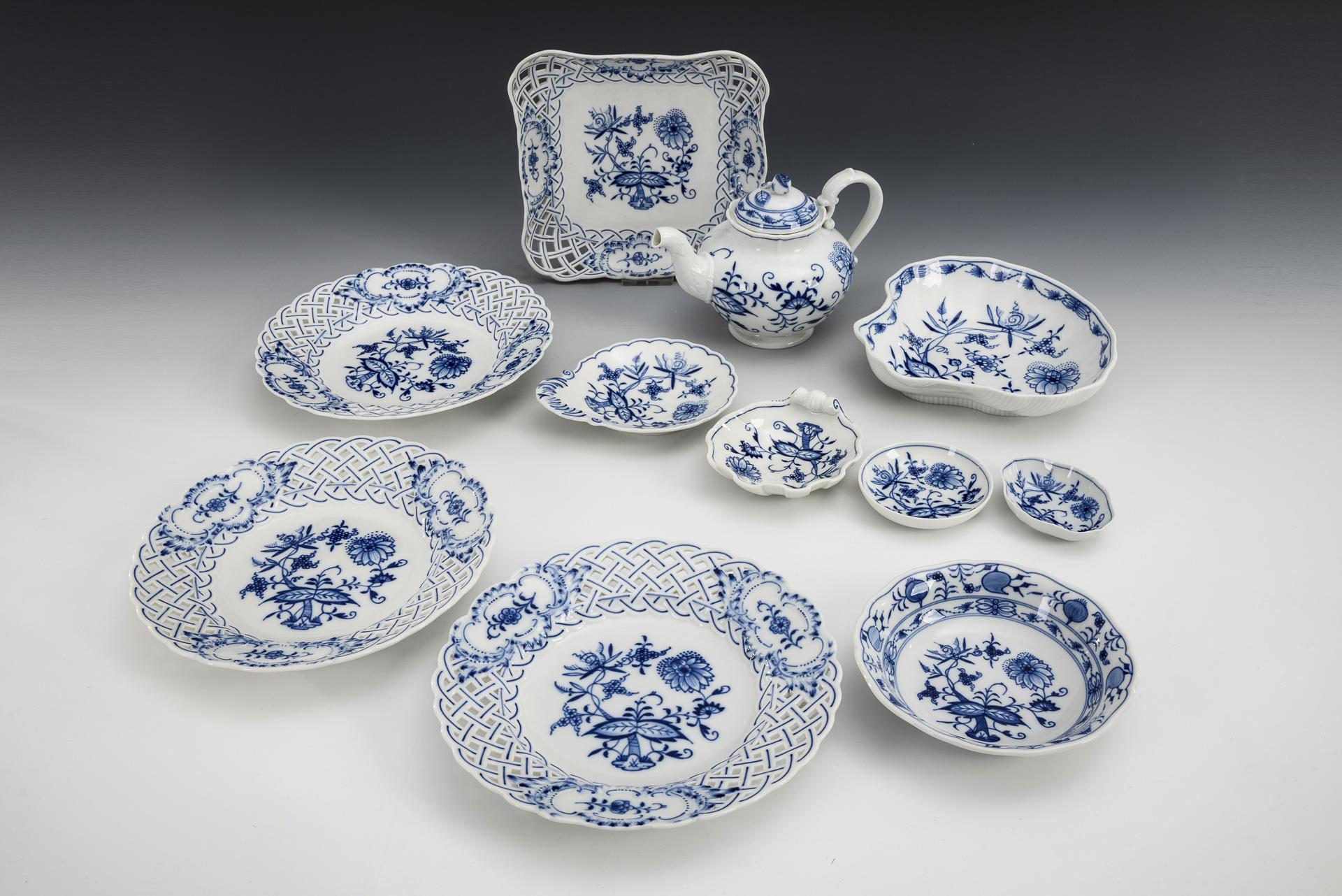 1 small jug (H 12.5 cm), 3 pierced plates (Ø 21 cm), 1 square dish (19.5 x 18 cm), 1 shell dish (Ø 19.5 cm), 1 compote dish (Ø 14.5 cm), 2 different shell dishes (L 11 and 14 cm), 1 quatrefoil dish (L 8.5 cm) and 1 nut dish (Ø 8.5 cm).