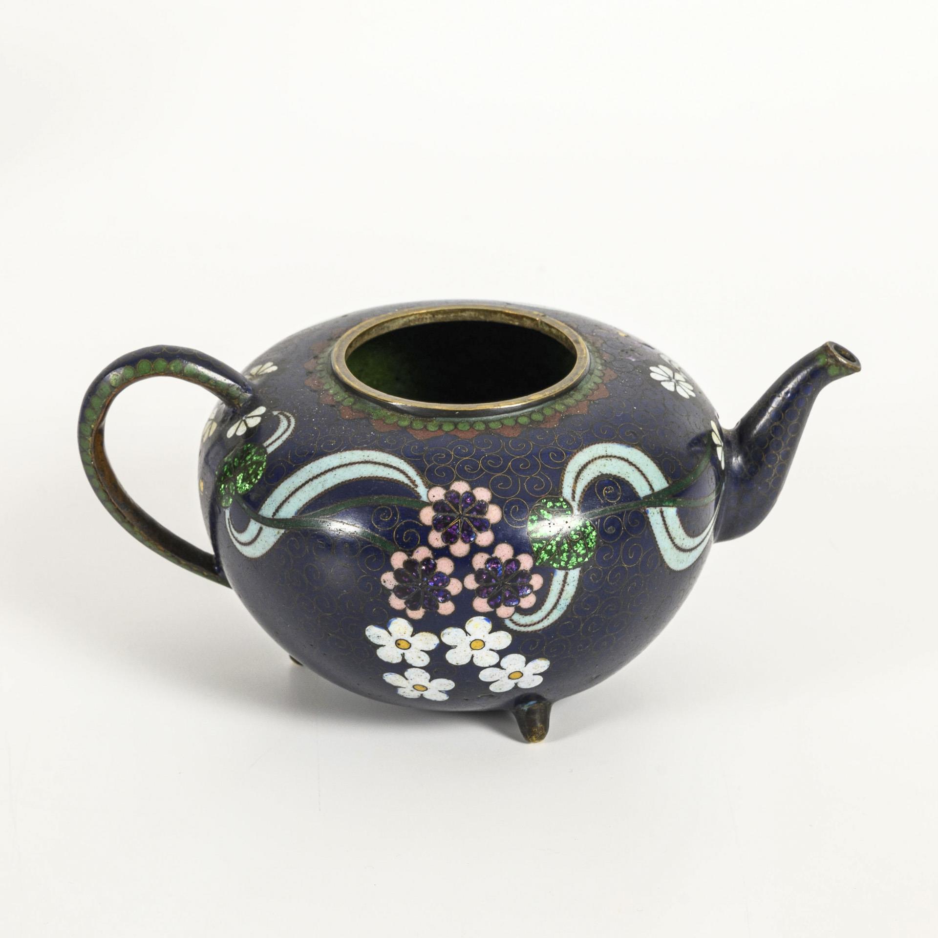 Pale blue jug with prunus blossoms and roses as decorative painting, high handle. (H 21 cm). / Two three-legged jugs in cloisonné technique. One lid missing. (H 10 cm).