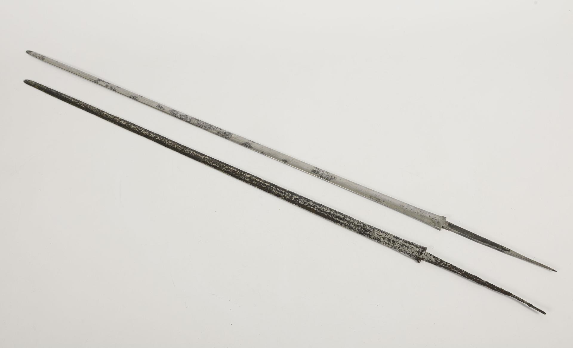 Blade with corrosion scars. (L 96 cm). Hexagonal cross-section, rounded point, heavy corrosion pitting, tang somewhat bent, minimal remnants of engraving. / Blade (L 101 cm). Lenticular cross-section, marked "W.S.&C", one side with a four-part hallmark and indistinct lettering.