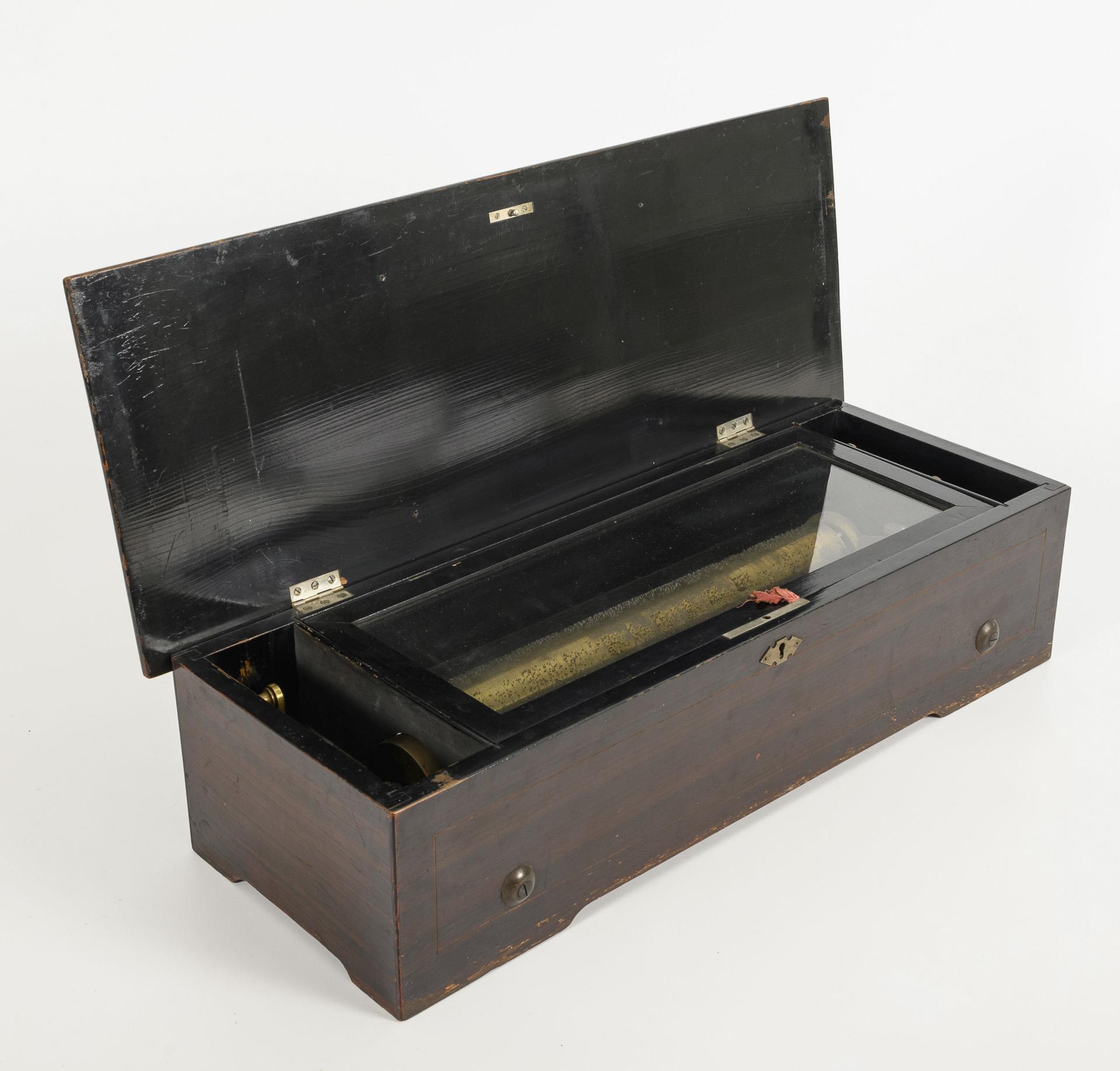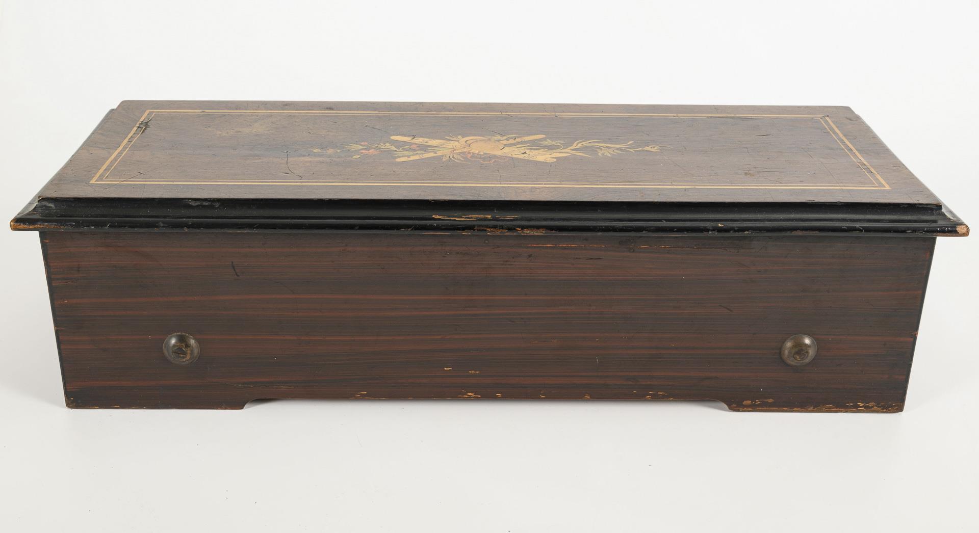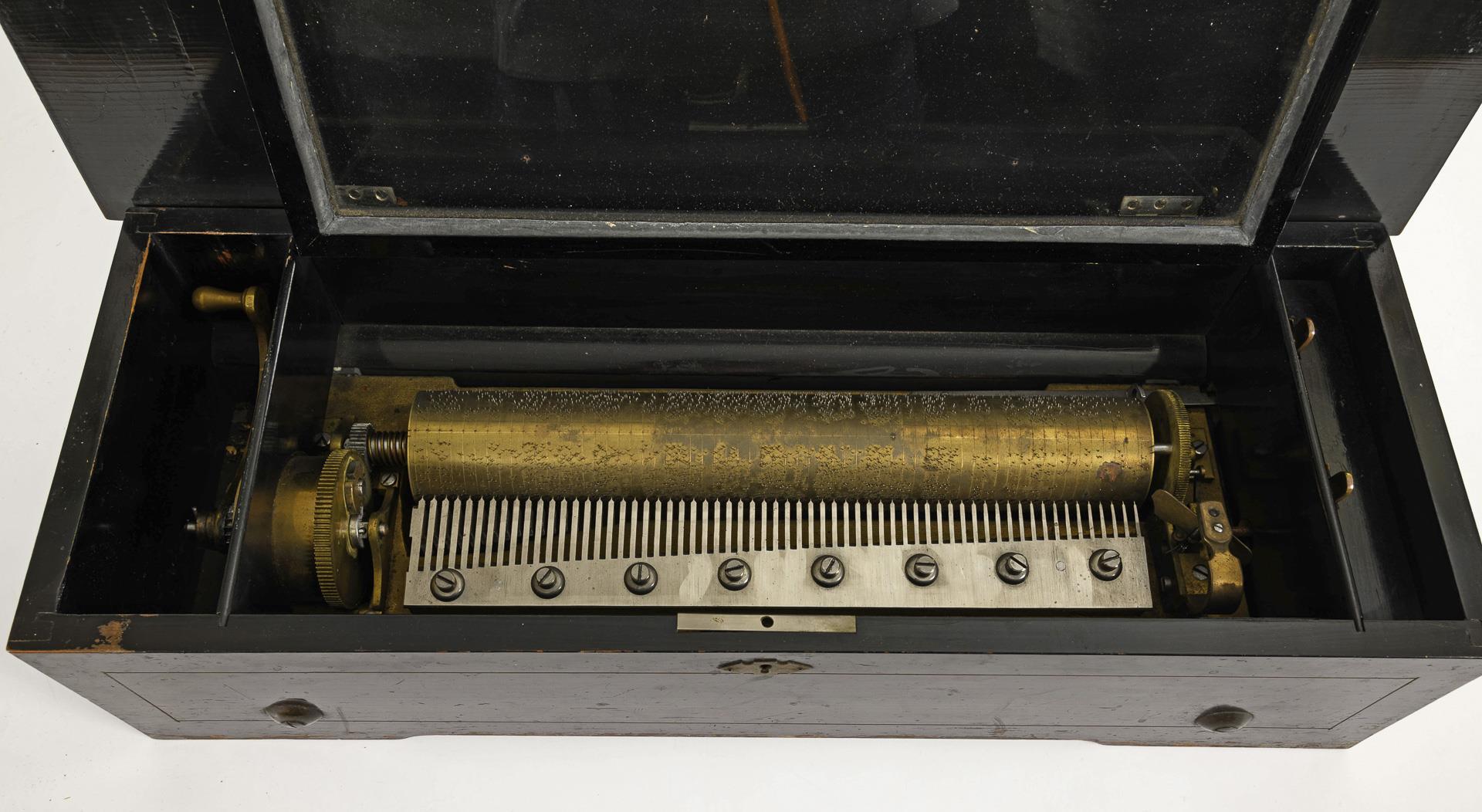 On the hinged lid of the "cylinder music box" marquetry with musical instruments on a branch. Inside, ratchet winding mechanism and 2 adjusting levers; under the glazing, the musical mechanism with stone-mounted wind wheel. Small signs of age/use, works, but runs somewhat slowly.