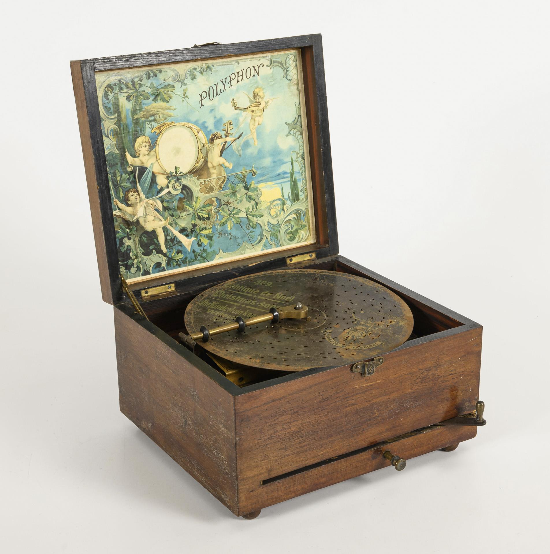 "Music box" with pull lever in the front and adjusting levers in the front and on one side as well as inlaid imitation ivory lettering on the hinged lid; color lithograph in the lid: Putti playing music. Fluted, gold-bronzed cast iron base plate, musical mechanism with central drive, covered reed comb and saddled and somewhat smaller second brass reed comb. Polyphonically marked, somewhat too small plates, e.g. Ihr Kinderlein kommet, Lobe den Herren, O Tannenbaum, Radetzky-Marsch etc. Functions with background noise, 1 reed missing, in need of overhaul, signs of age/use on the case, plates partly rusty.
