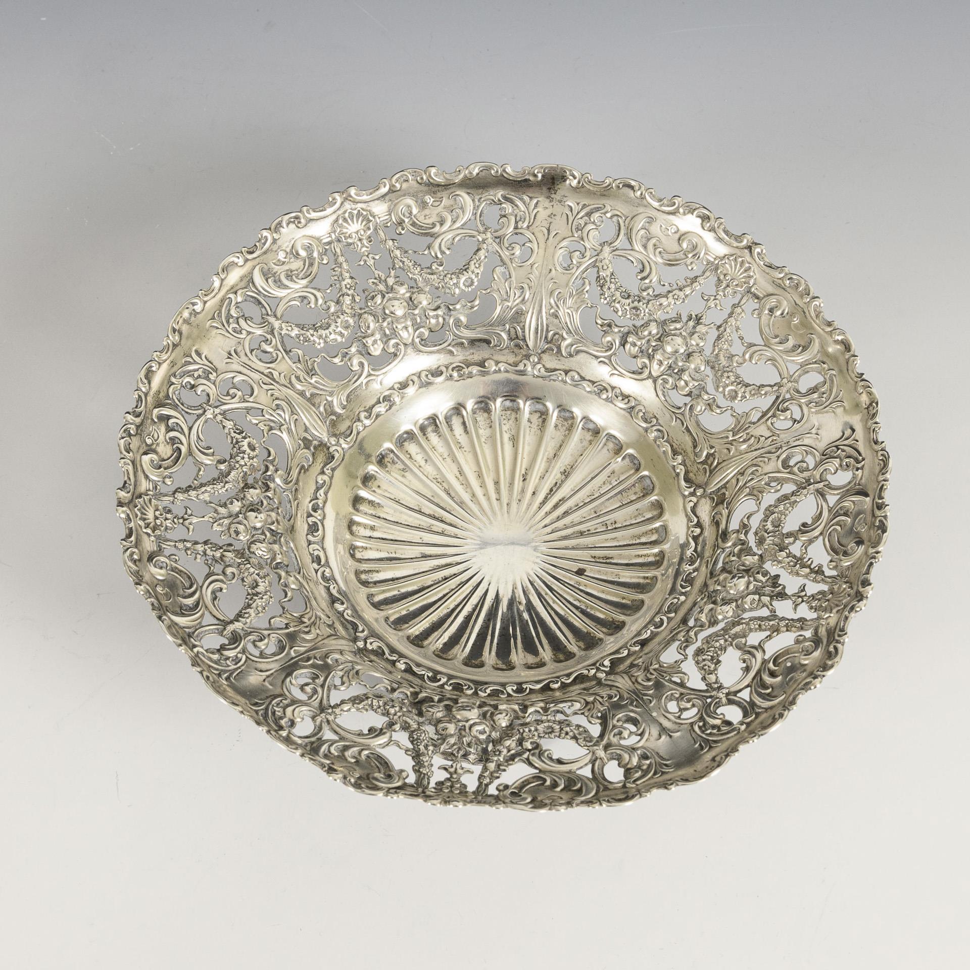 Round openwork bowl with flower garlands (Ø 18.5 cm), 2 sugar bowls with rocaille reliefs (1x round, Ø 10 cm, 1x oval, 14.5 x 9.5 cm).