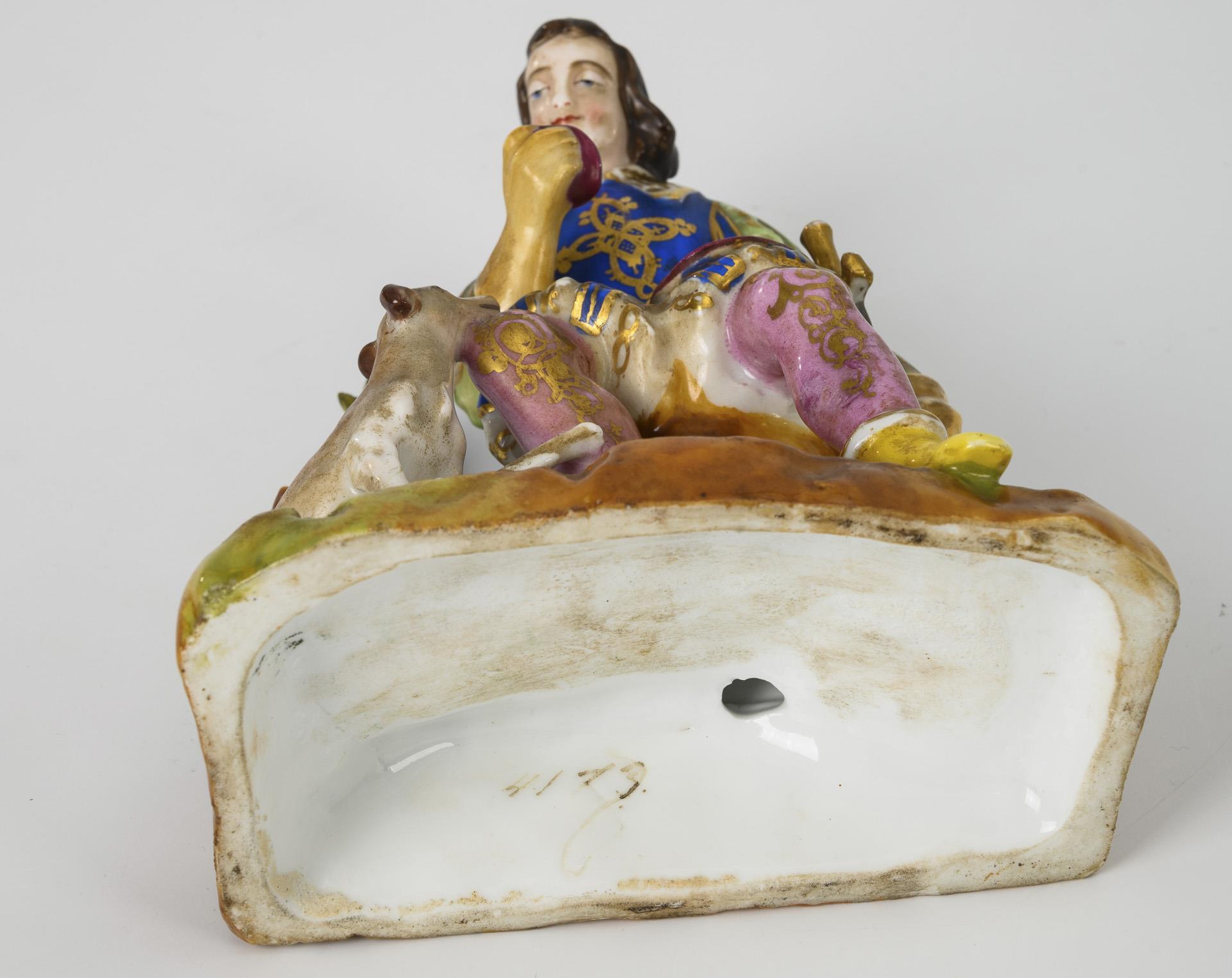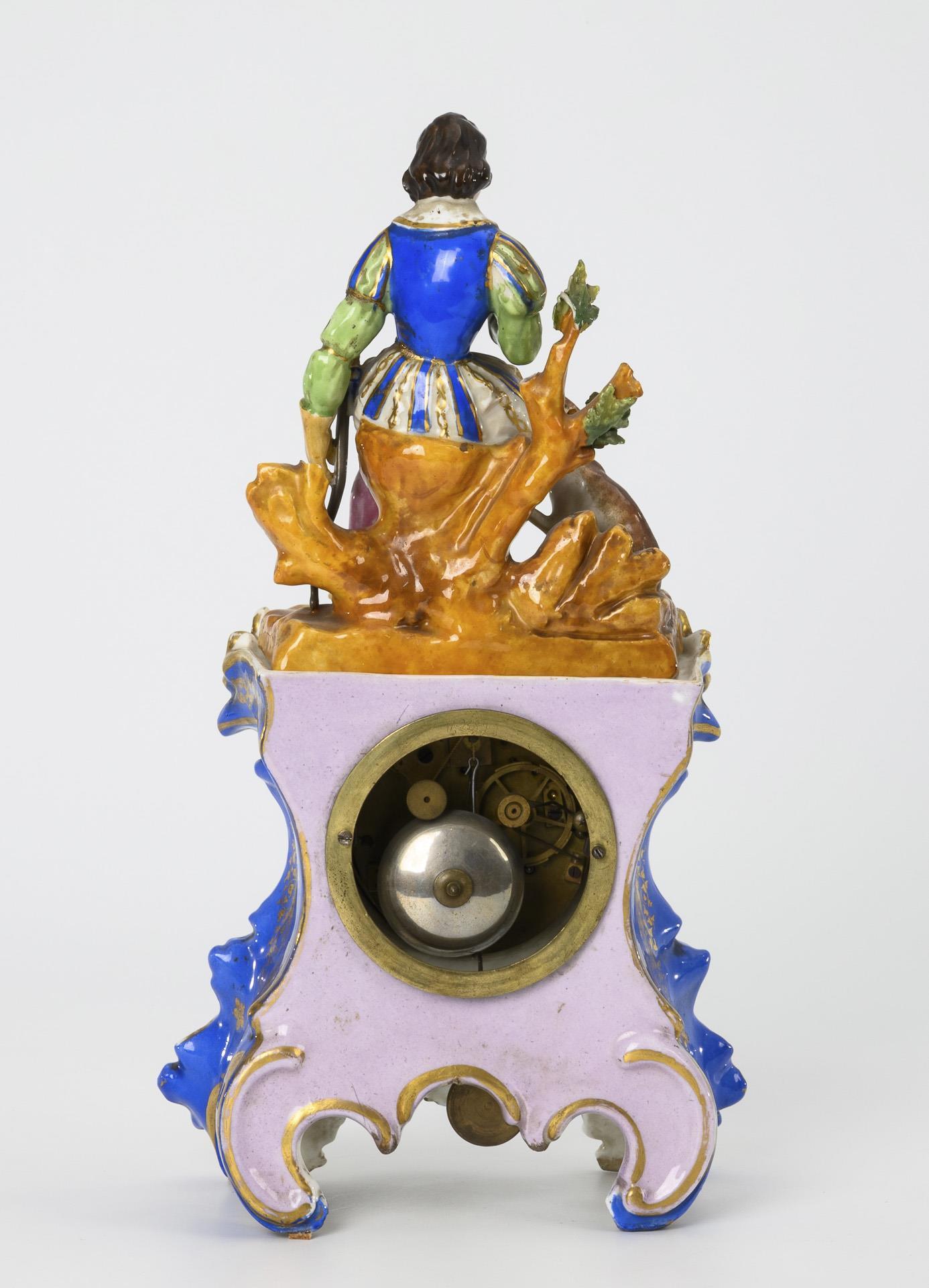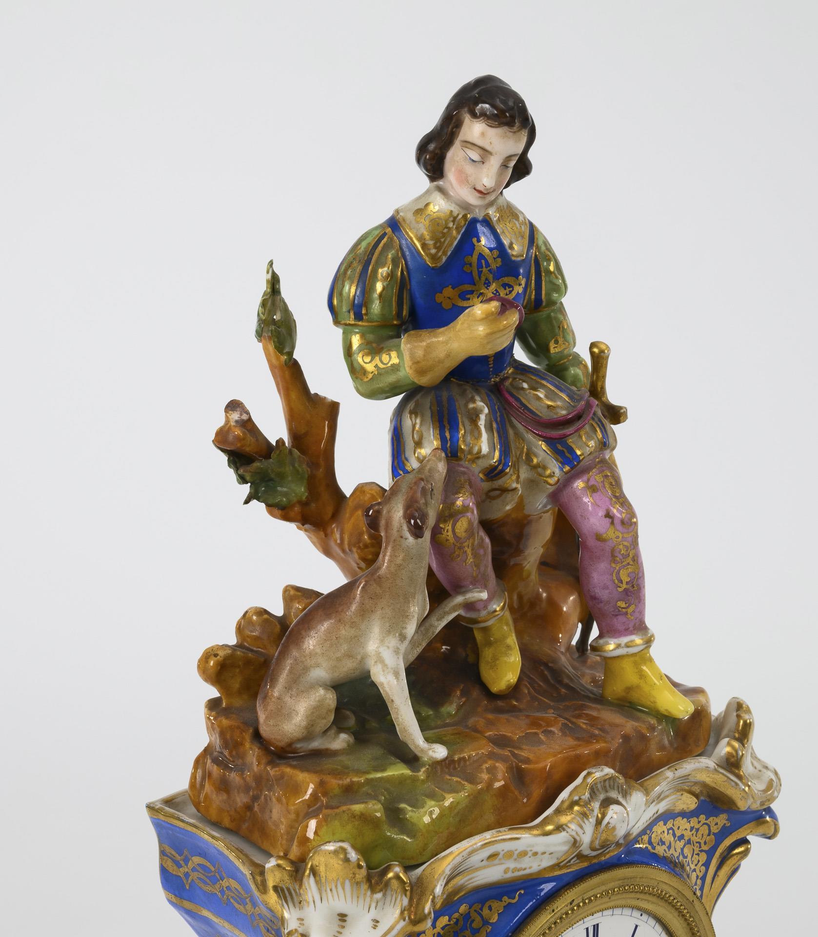 2-part. Rocaillé clock base and figure top with huntsman, with blue background, flower and gold painting. Minimal gold wear, dial hairline cracked, partially chipped.