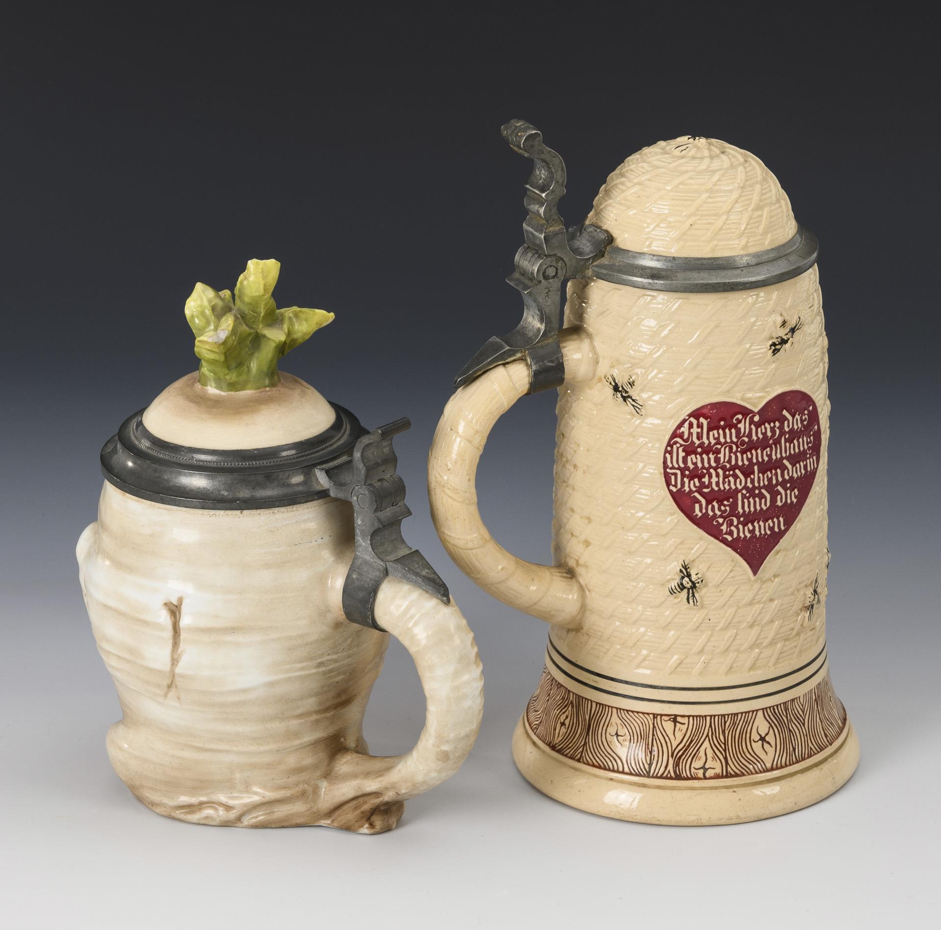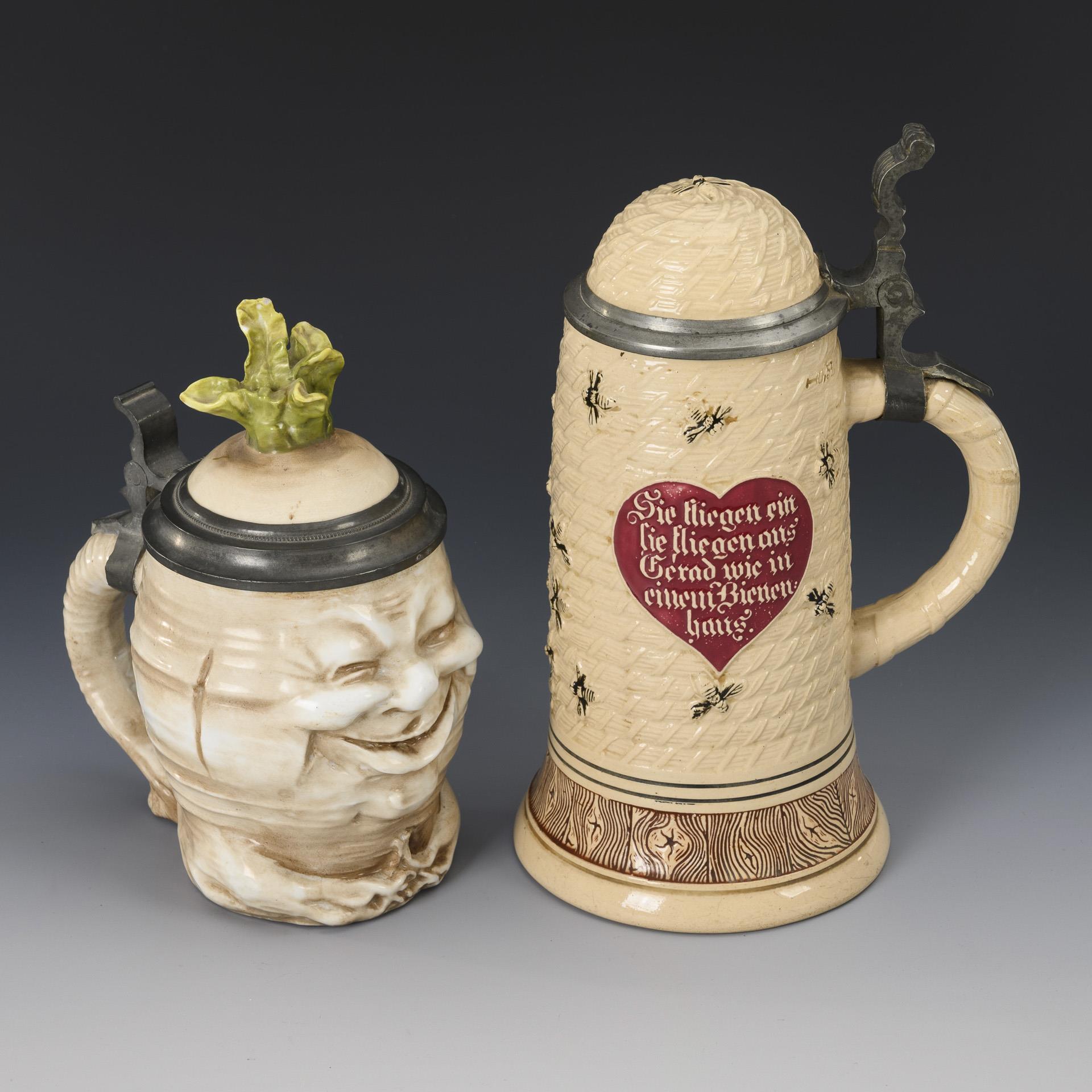 Joker jug in the shape of a laughing radish / Beekeeper jug in the shape of a hive with bees; both sides with mottoes on heart-shaped cartouches. Each 0.5 l. Slightly bumped leaves, ceramic base with slight glaze hairline cracks inside.