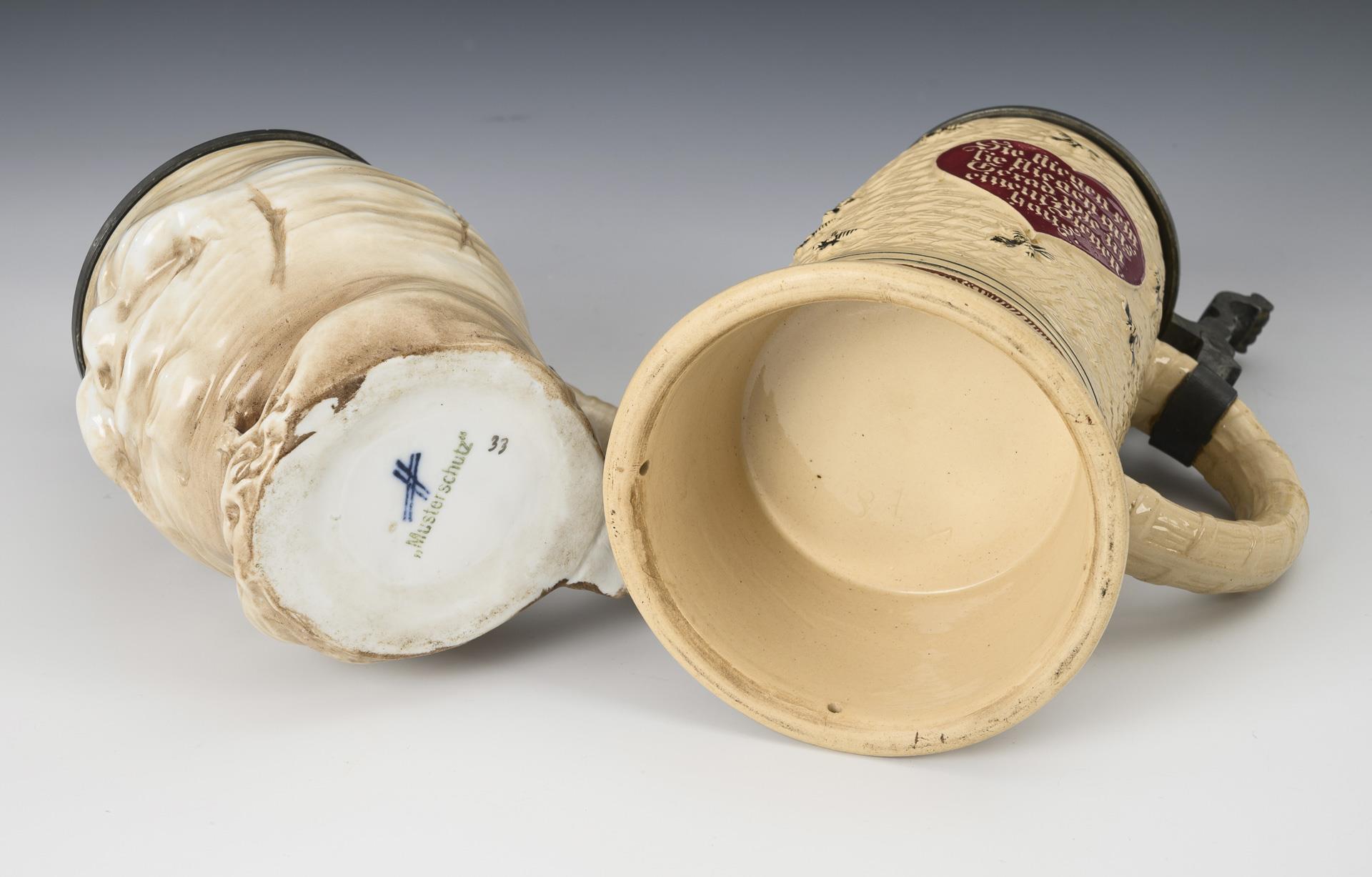 Porcelain and ceramic, each painted, each with pewter mount. H maximum 23.5 cm.