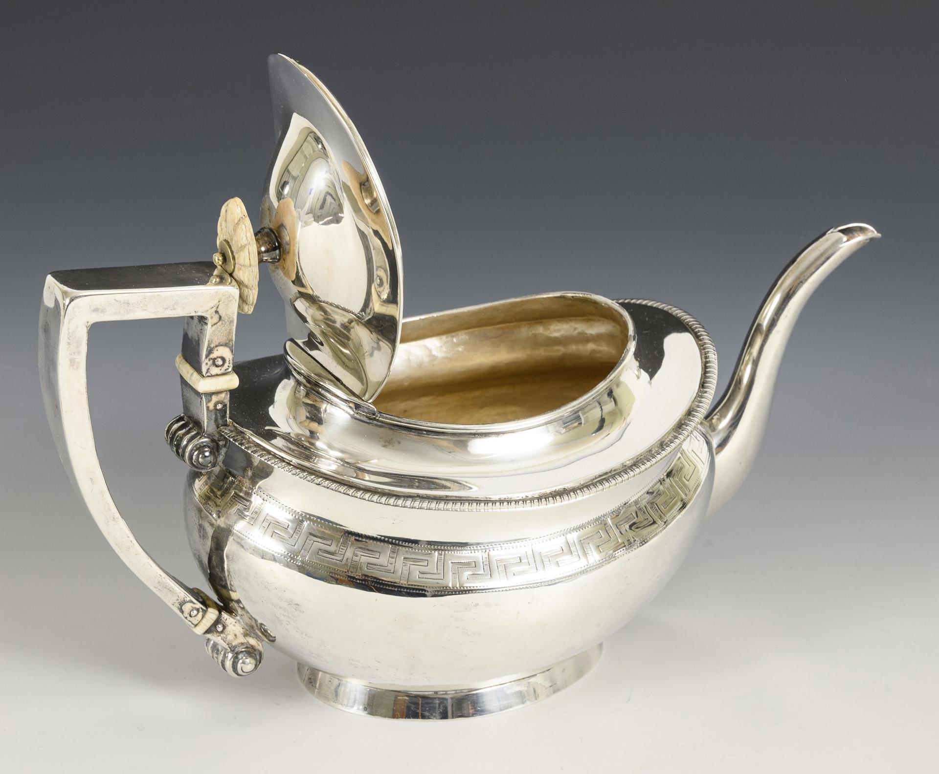 Bellied-oval shape with engraved meander band, leg pommel and angled handle. Minimally dented, base ring and handle base with traces of soldering, lid hinge somewhat loosened.