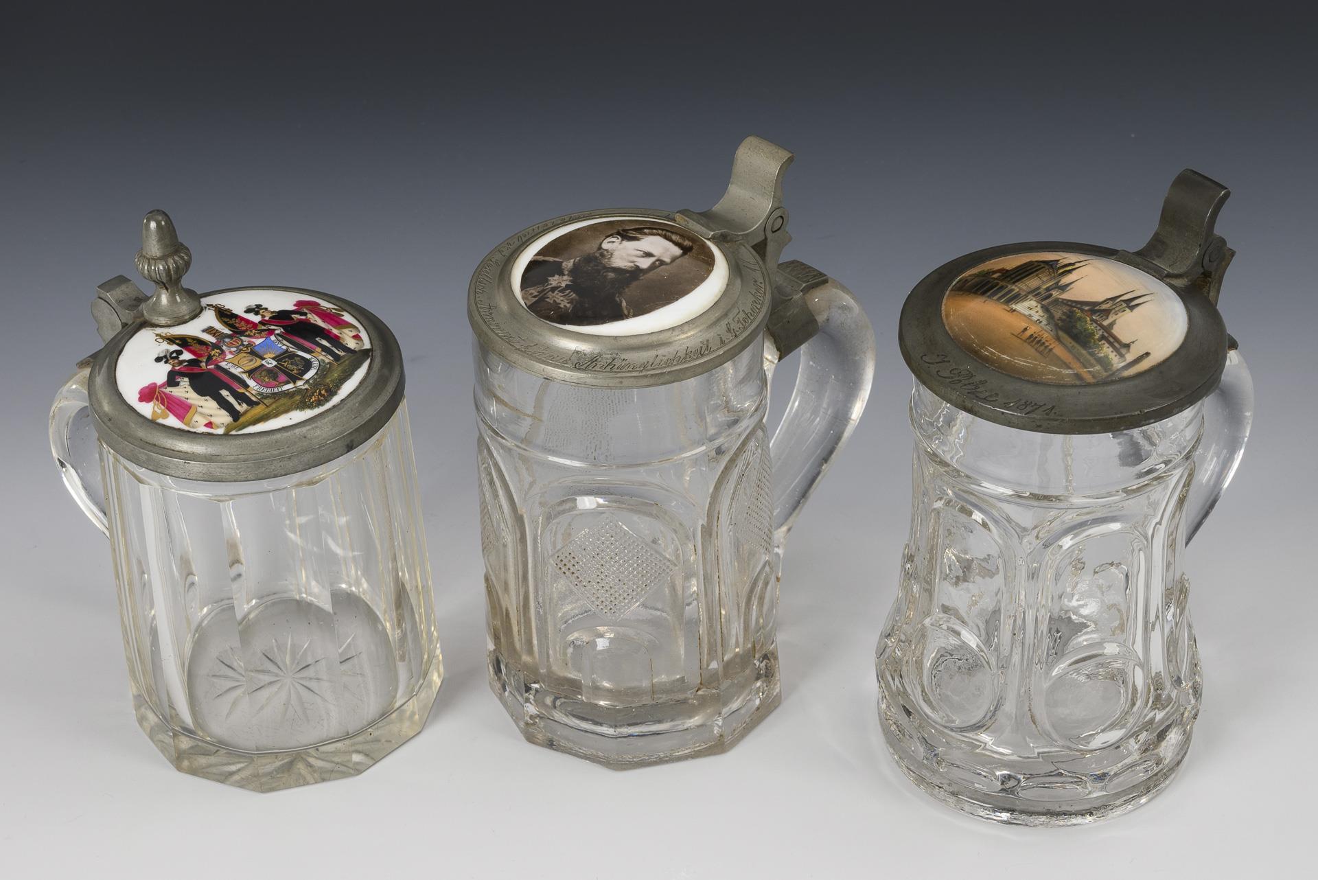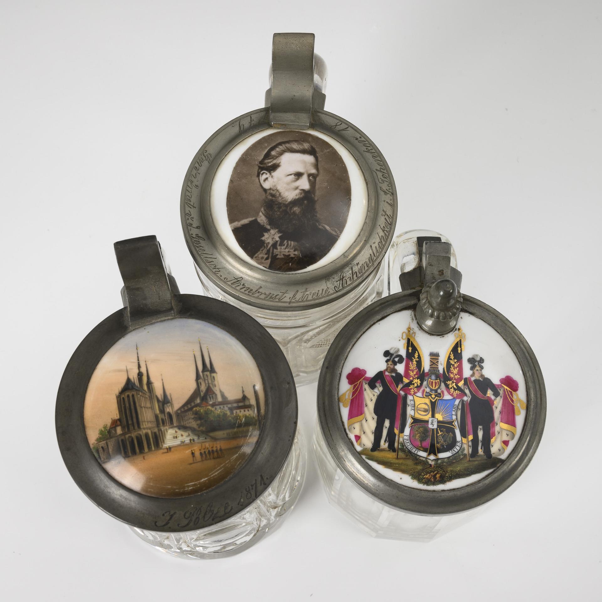 Faceted cut glass with star-shaped base. Painted Arminia coat of arms with shield holders on the porcelain lid: dedication dated 1856 in the lid. / Blown glass in shape with wall structure. "A. Biertümpfel Erfurt" marked pewter lid; painted view of Erfurt with cathedral and Severi church on the porcelain and engraving on the rim: "J. Polze 1871". / Molded glass with wall decoration. "Oskar Zacher Apolda" marked pewter lid; on the porcelain portrait of Frederick III (Crown Prince) and dedication engraving on the rim from the Armbrust company 1879. Arminia: chip to the base/handle transition / Erfurt: minor chipping to the handle at the bottom, scratches to the painting / Frederick III: chips to the stand.