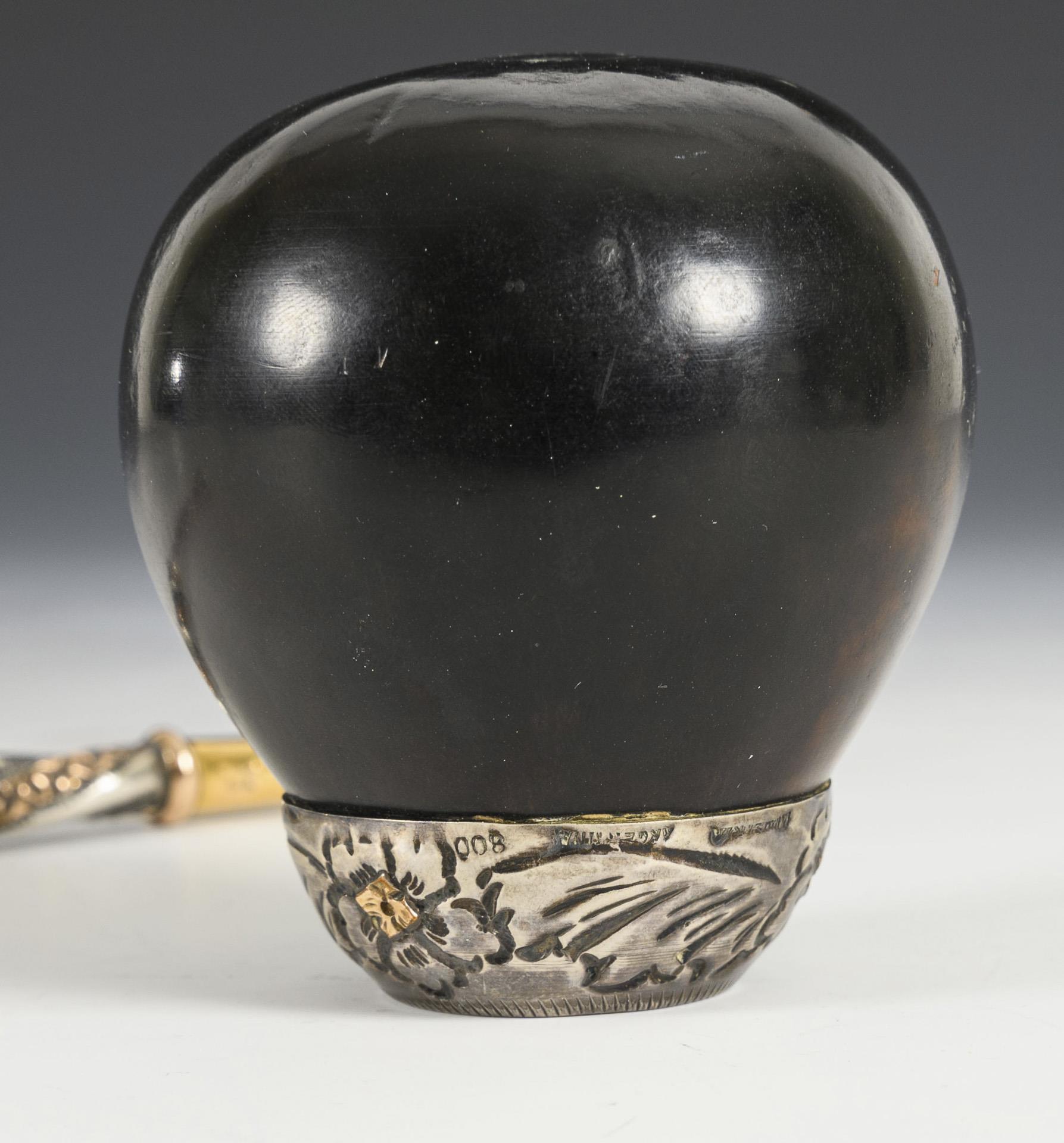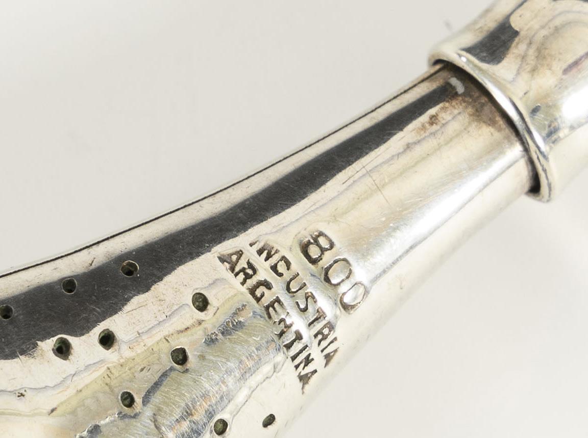 Calabash with florally decorated silver mount (H 7.5 cm), with silver bombilla (L 20 cm, 34 g) with gold mouthpiece (stamped 18 K). Hardly any signs of use.