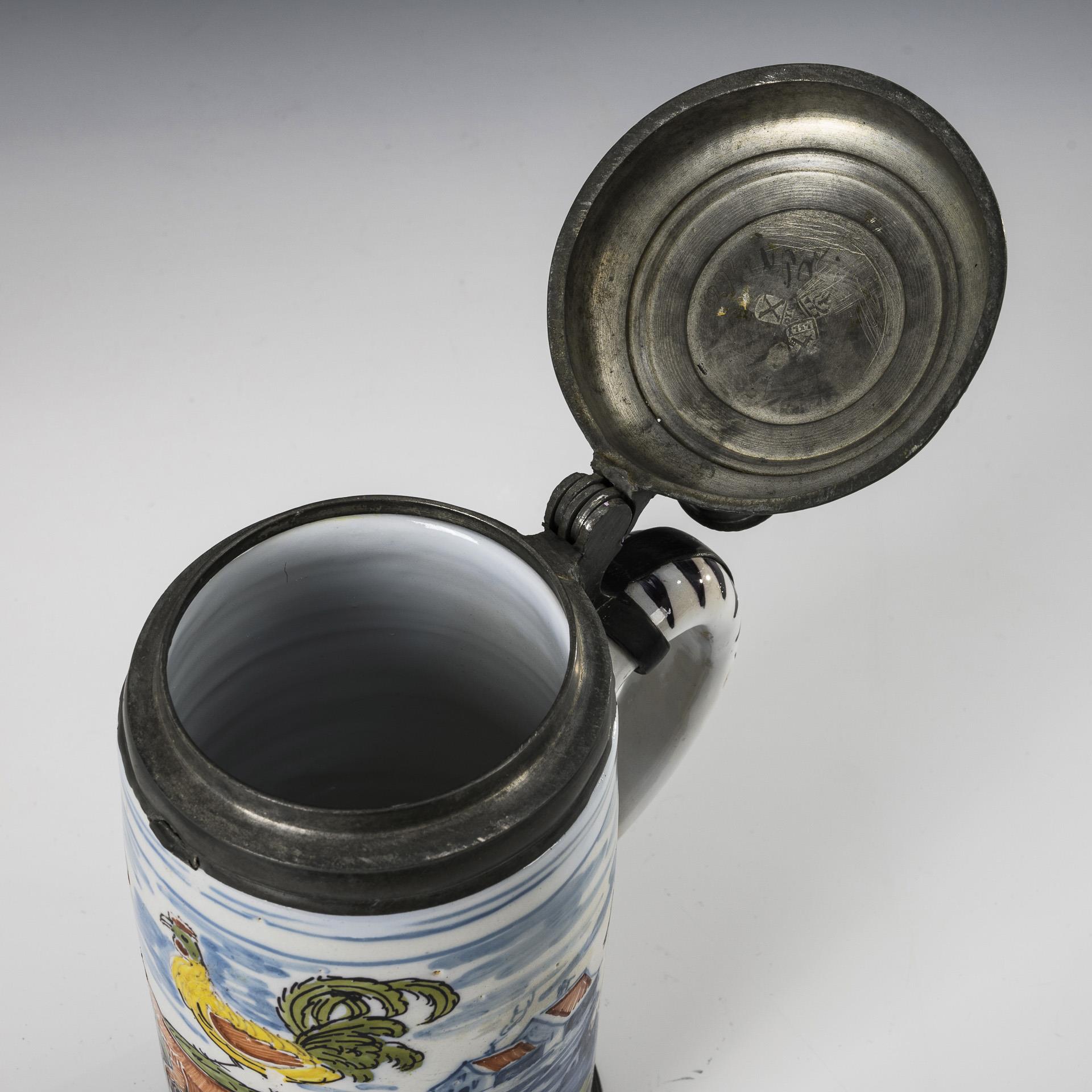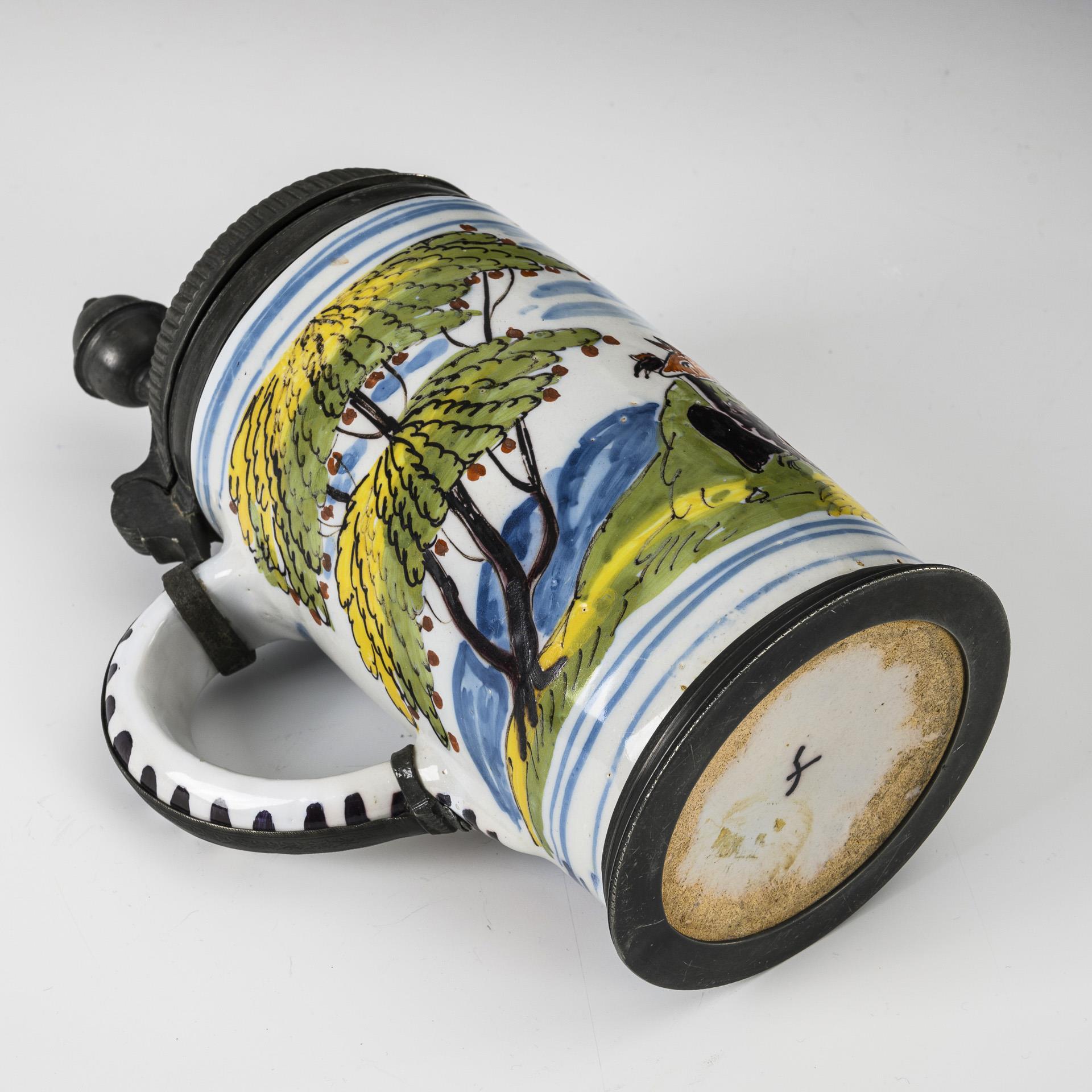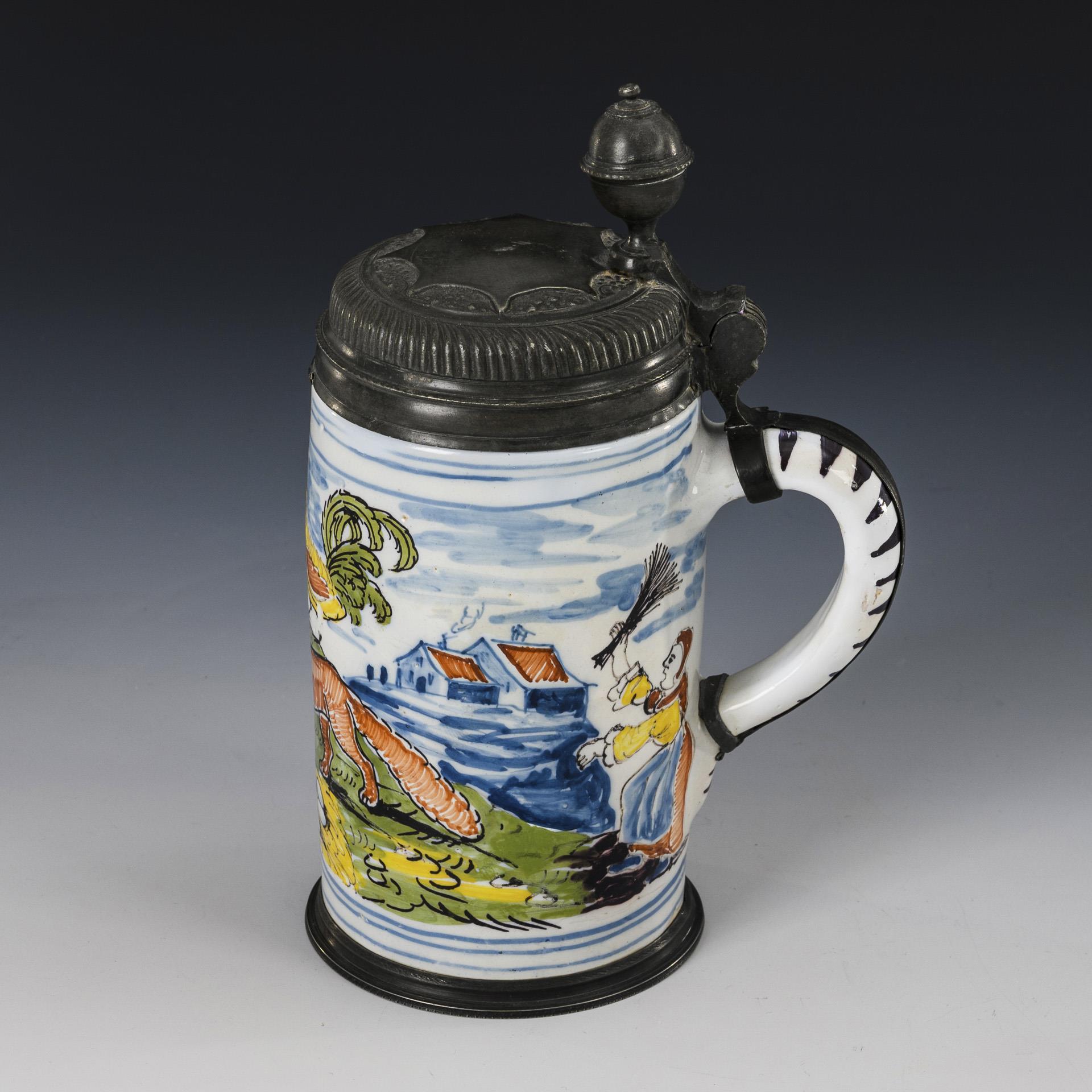 Cylindrical body with a ribbon-decorated handle, the front depicting a predatory fox with feathered animals and a raging peasant woman in a landscape with architecture. Relief pewter lid with ball pusher, punched inside, pewter band and pewter stand ring. Restored, pewter with slight defects.