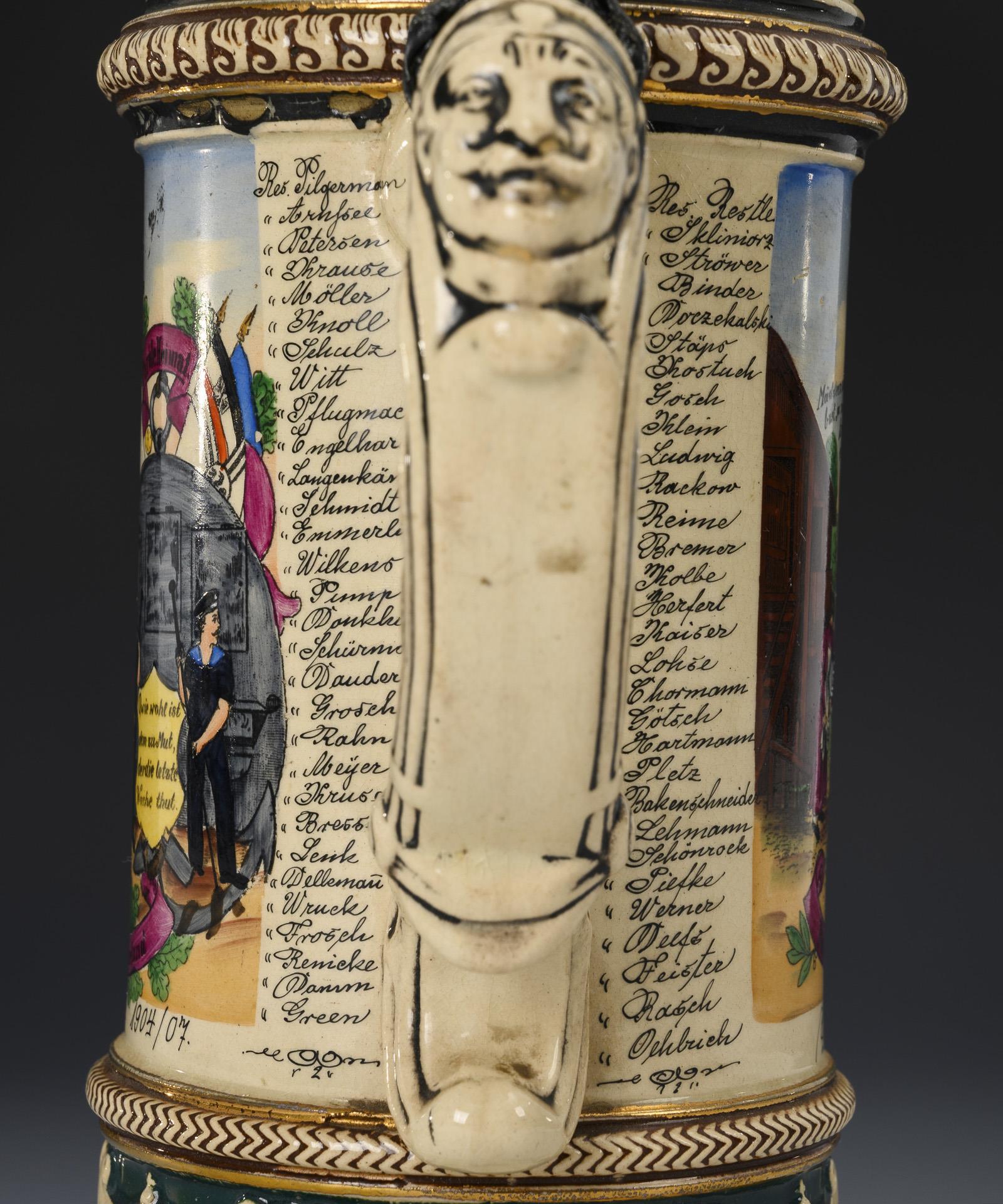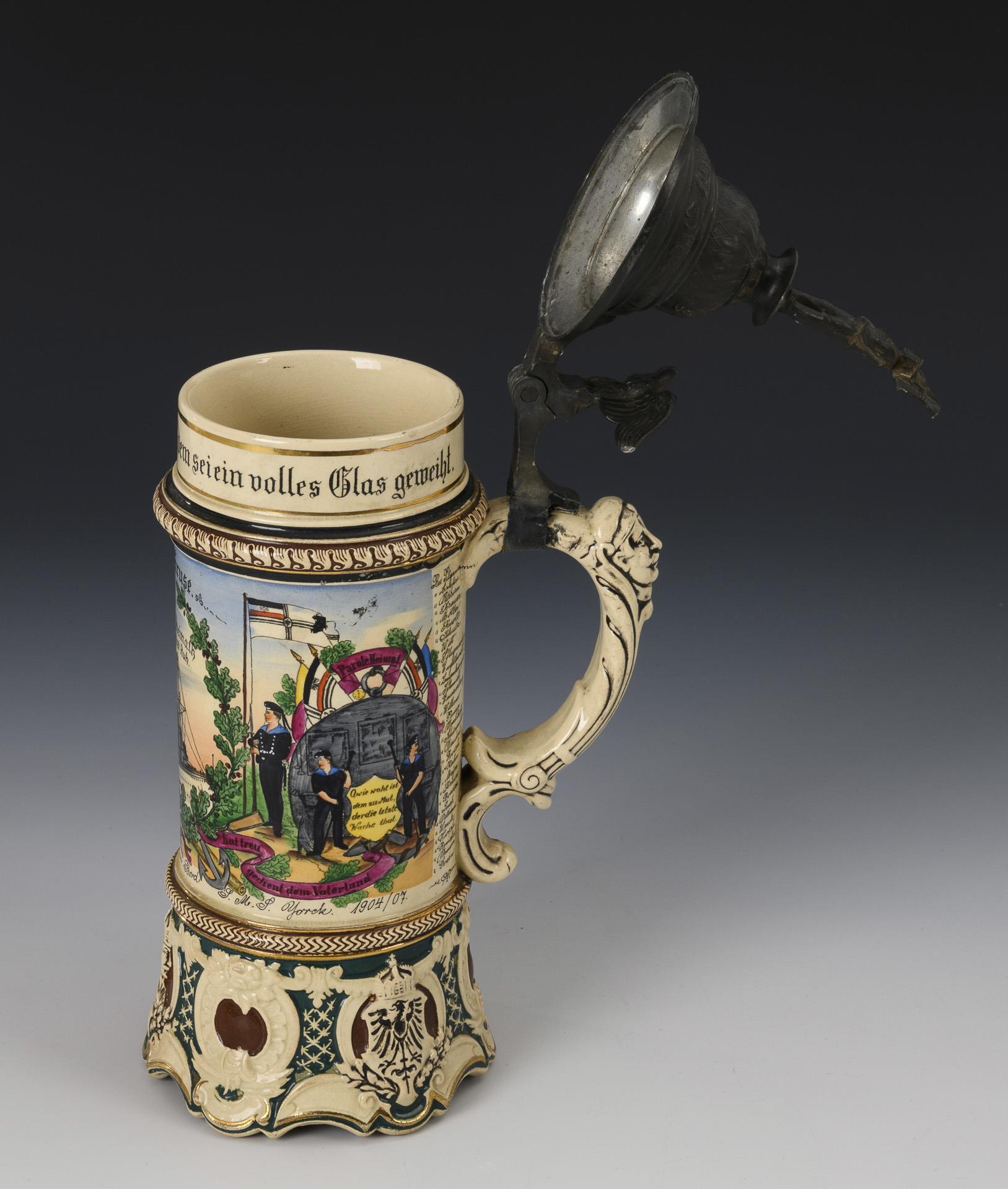 High relief base, central image of the armored cruiser, flanked by scenes of soldiers and a list of names. "Res. Kruse" "In memory of my service on the 'S.M.S. York'". Lid with eagle pusher and standing sailor with imperial war flag as a crown. Solder/glue mark at the pewter/handle connection, minimal glaze craquelure on the base.
