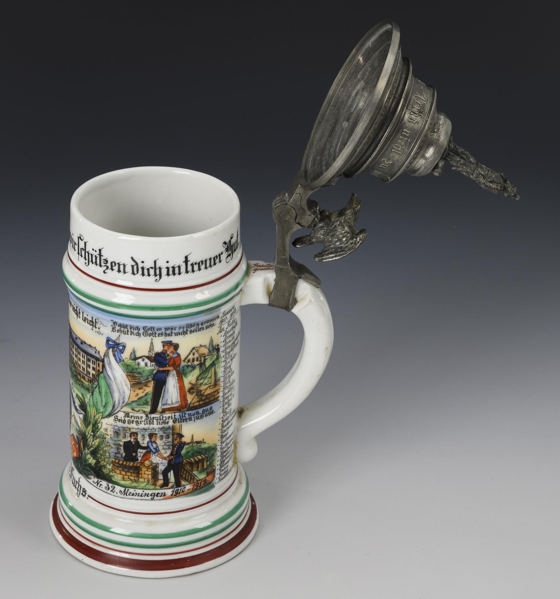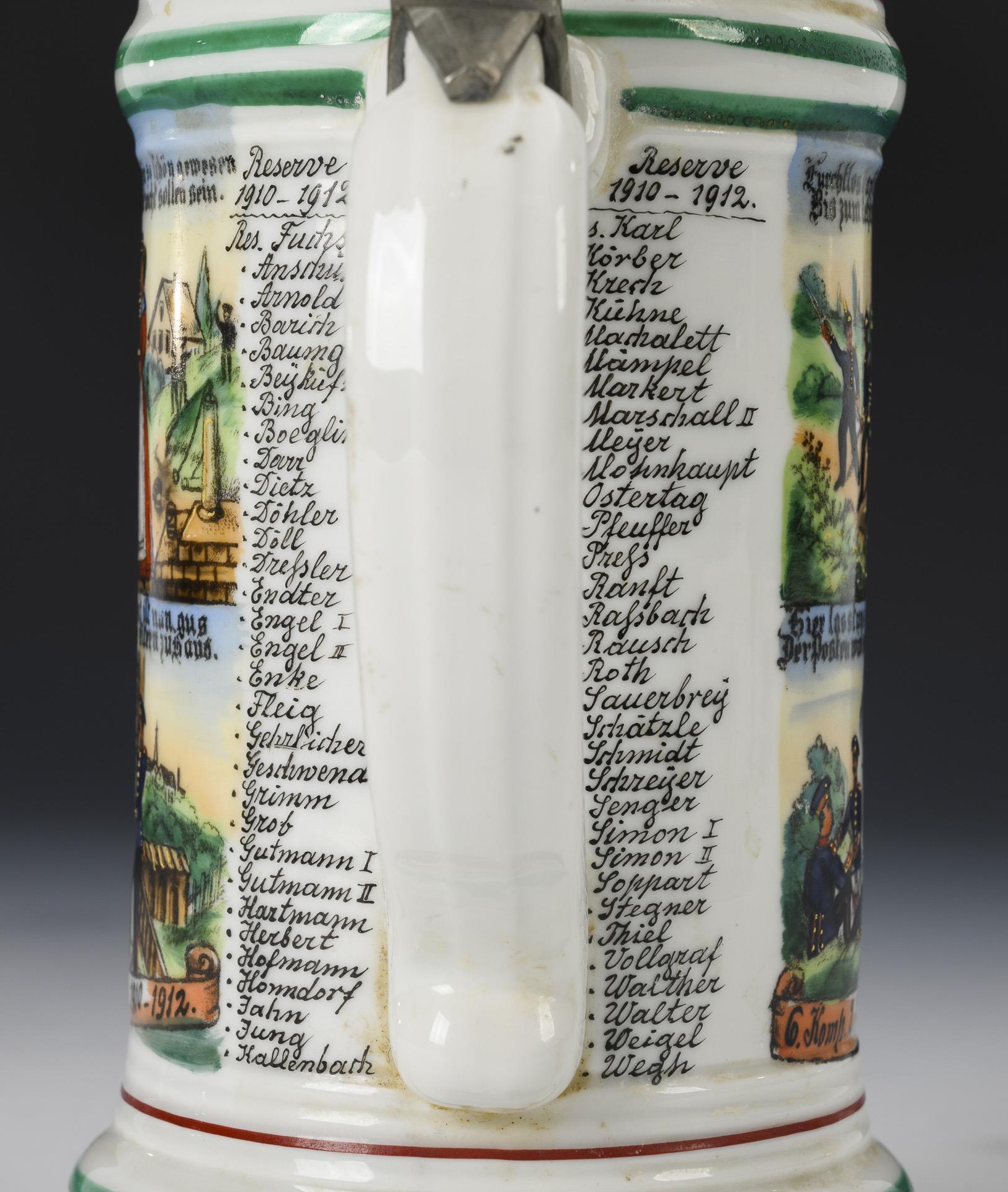 Central view of barracks and soldier, flanked by military scenes and list of names. "Reservist Fuchs" "6th Comp. 2nd Thür. Inft.-Regt. no. 32 Meiningen". Pewter lid with eagle pusher and standing cannoneer as crown. Slip marks on the lid.