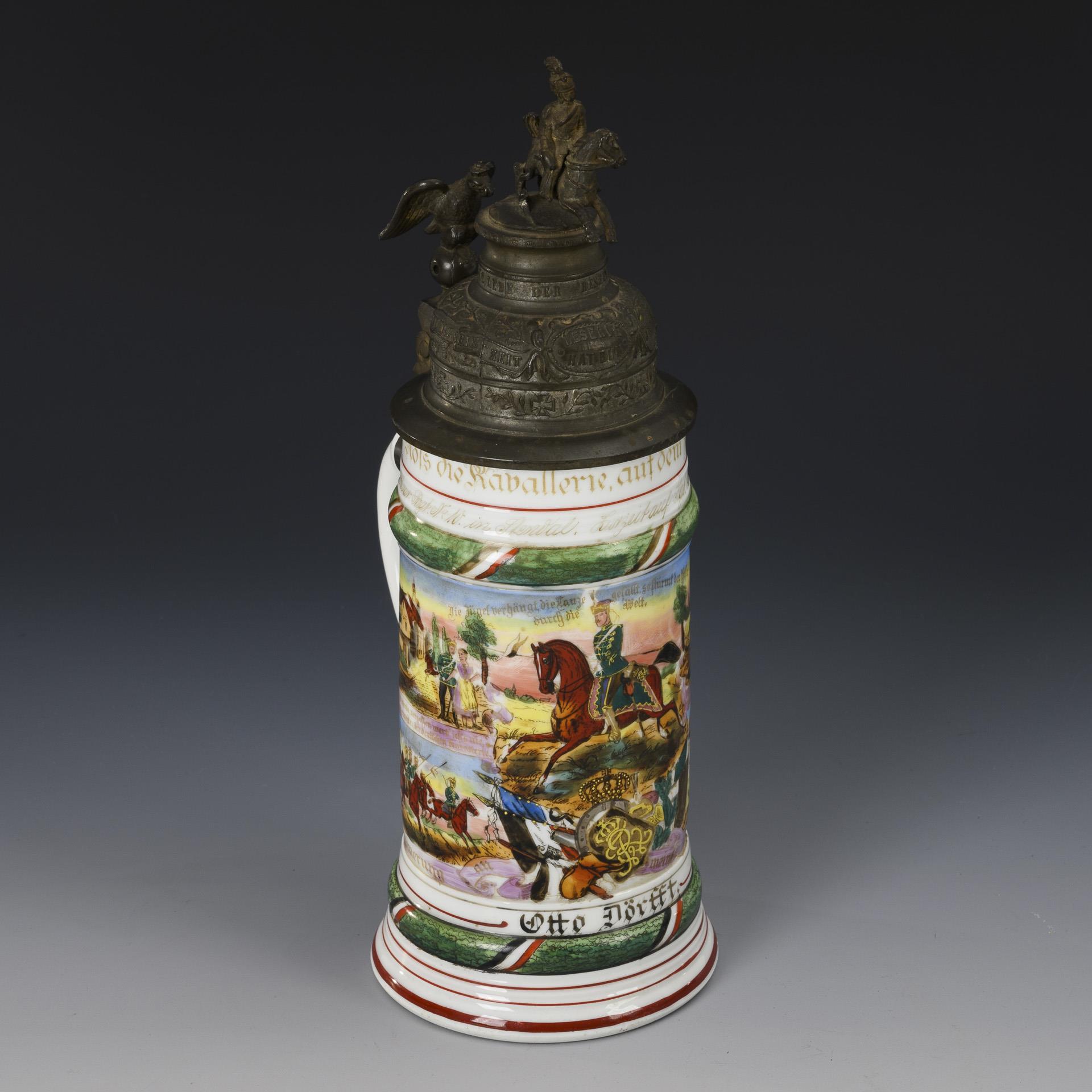 Central shoulder piece with monogram, above rider, flanked by military scenes; without list of names. "Otto Dörfft" "1st Esk. Magdeburg. Hussar. Rgt. F. W. in Stendal". Lid with eagle pusher and equestrian figure as crown. Bruised, rider slightly bent, missing Stanhope magnifying glass miniature in the eagle's beak.