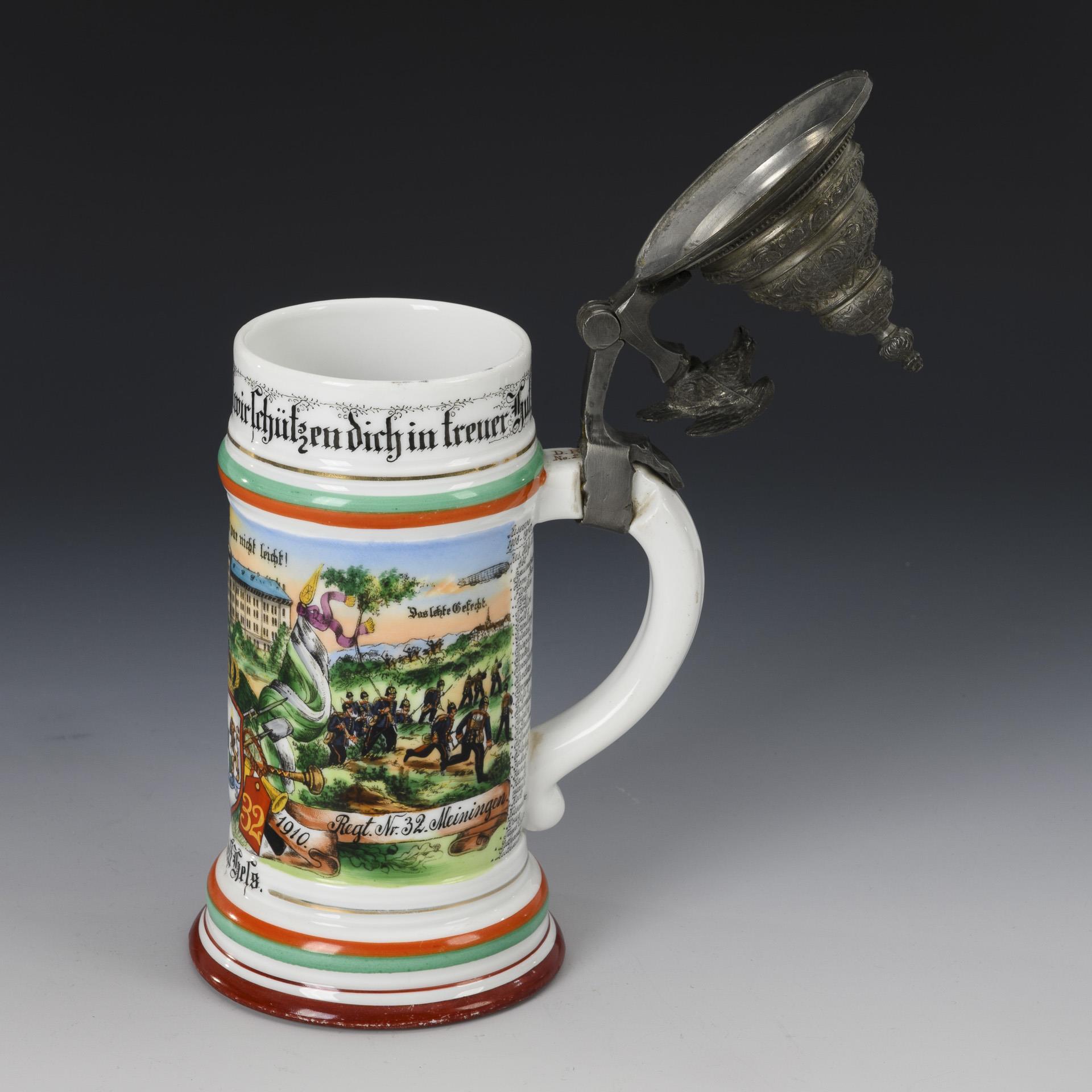 Central coat of arms with barracks view, "Reservist Hess" "3. Comp. 2. Thür. Inft. Rgt. Nr. 32 Meiningen 1908 - 1910" and list of names. Pewter lid with eagle pusher.