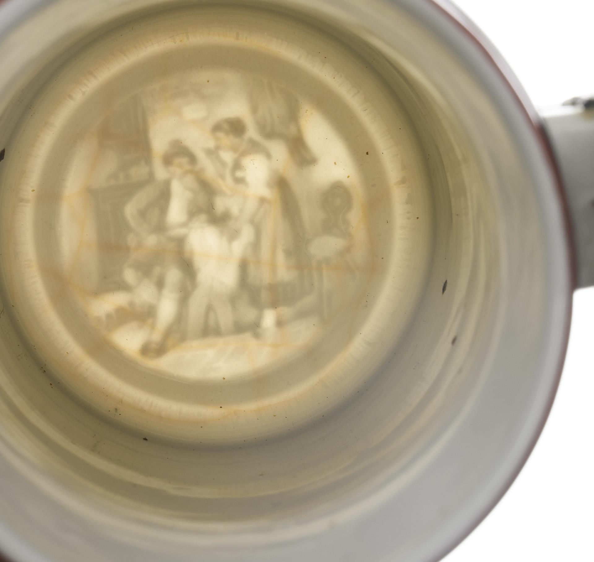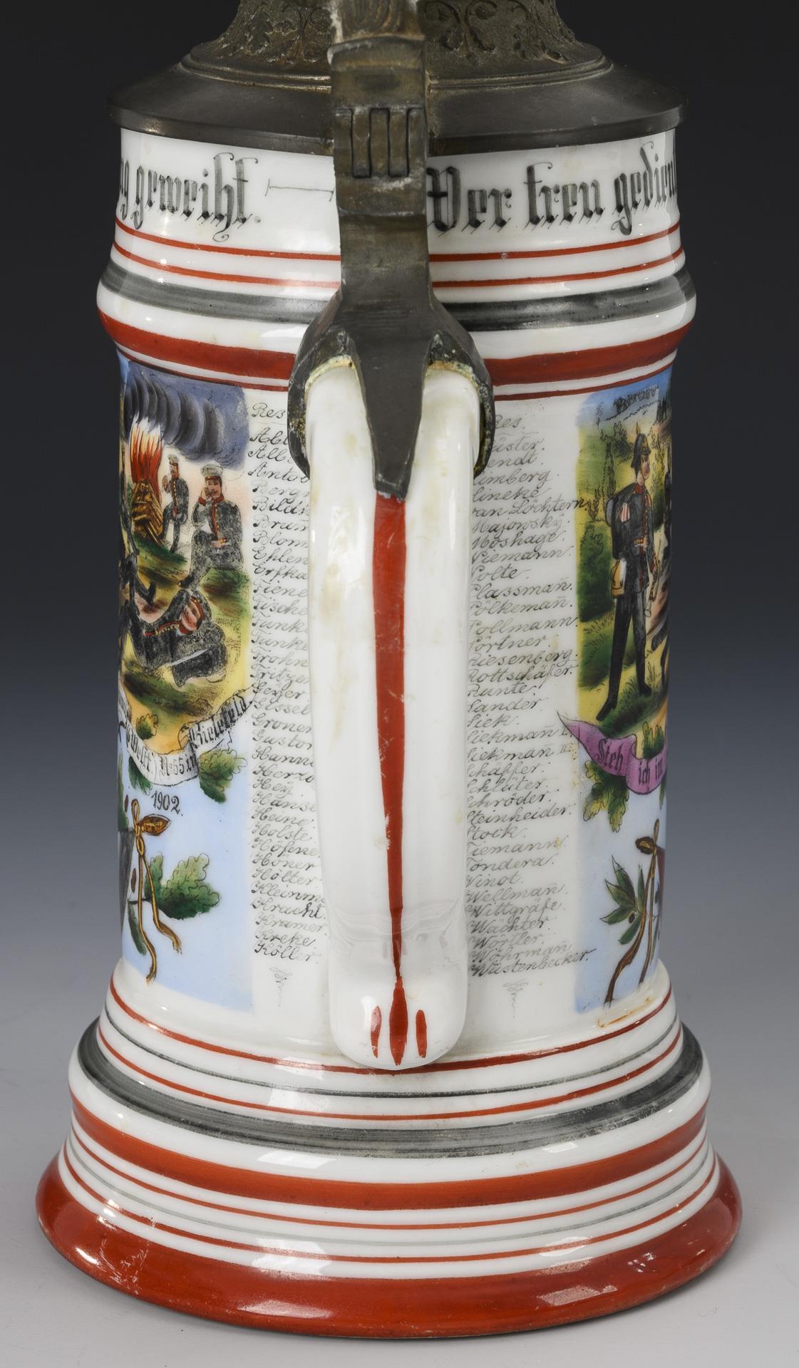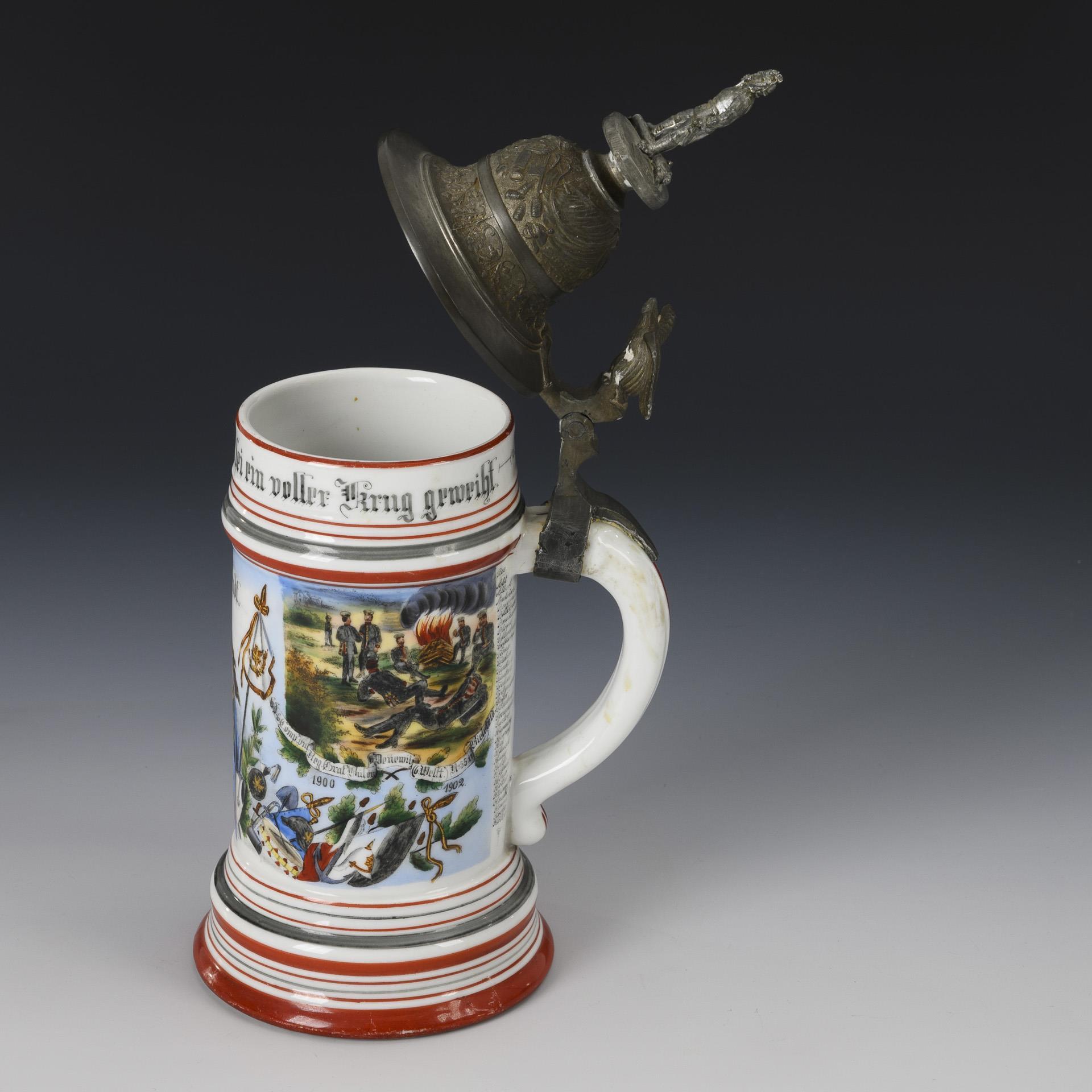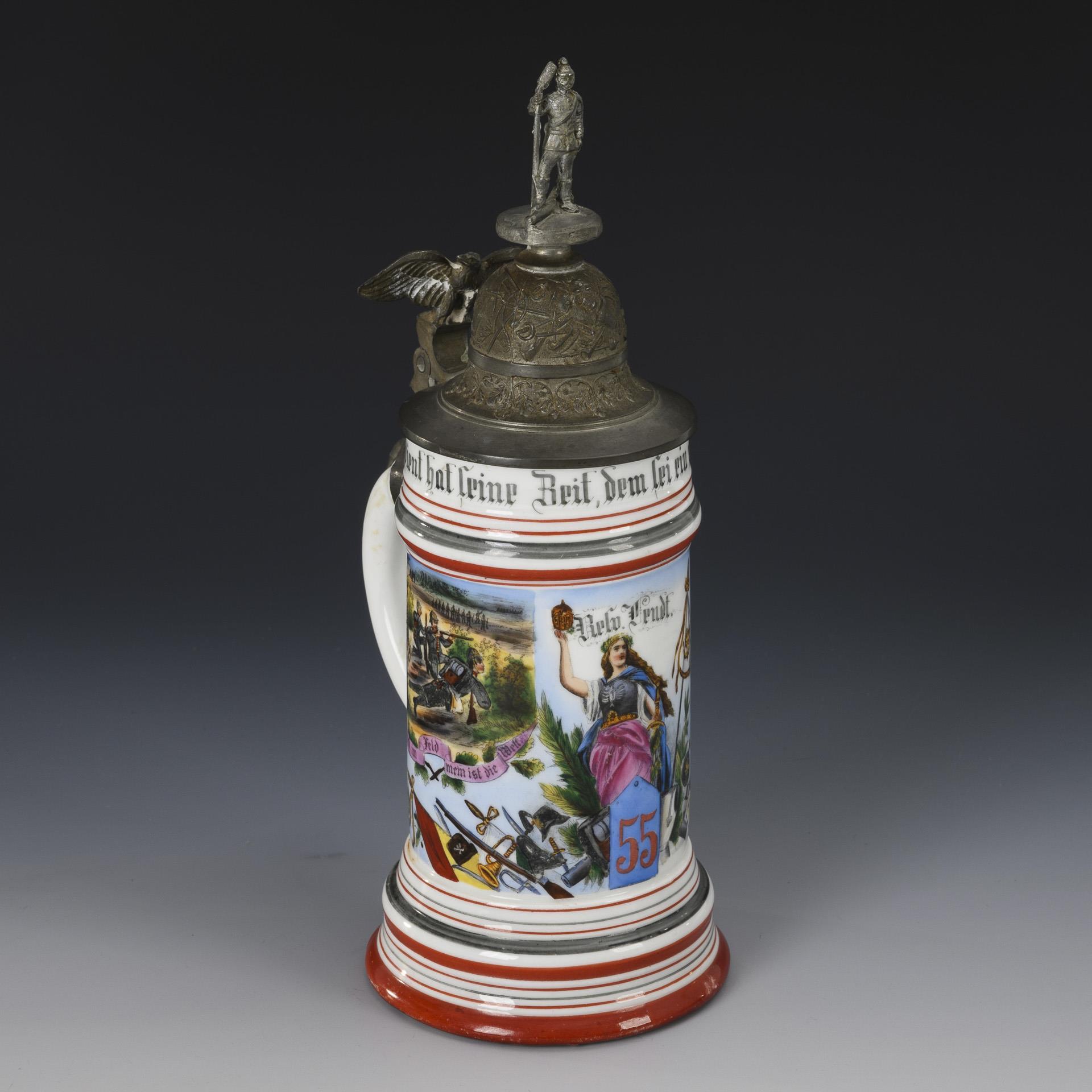 Central Germania from the Niederwald monument with shoulder piece, flanked by military scenes and a list of names. "Resv. Vendt" "6th Comp. Inf. Rgt. Graf Bülow Dennewitz (6th Westf.) No. 55 in Bielefeld". Lid with eagle pusher and standing cannoneer as crown. Slightly rubbed, pewter connection to the handle soldered.