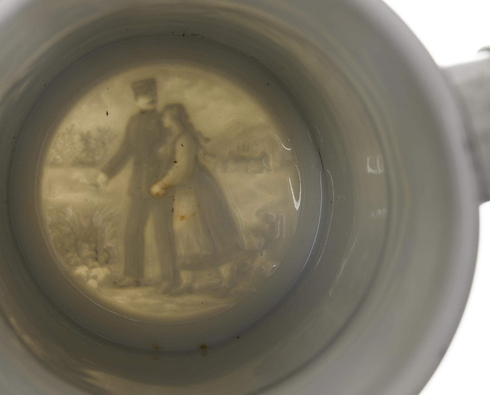 Each porcelain with bottom lithophane (farewell or couple), colored outline print, pewter, 1x Stanhope loupe miniature. H 32 and 24 cm respectively.