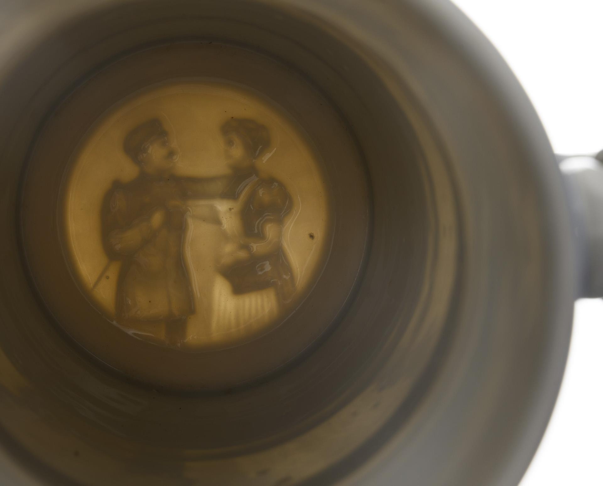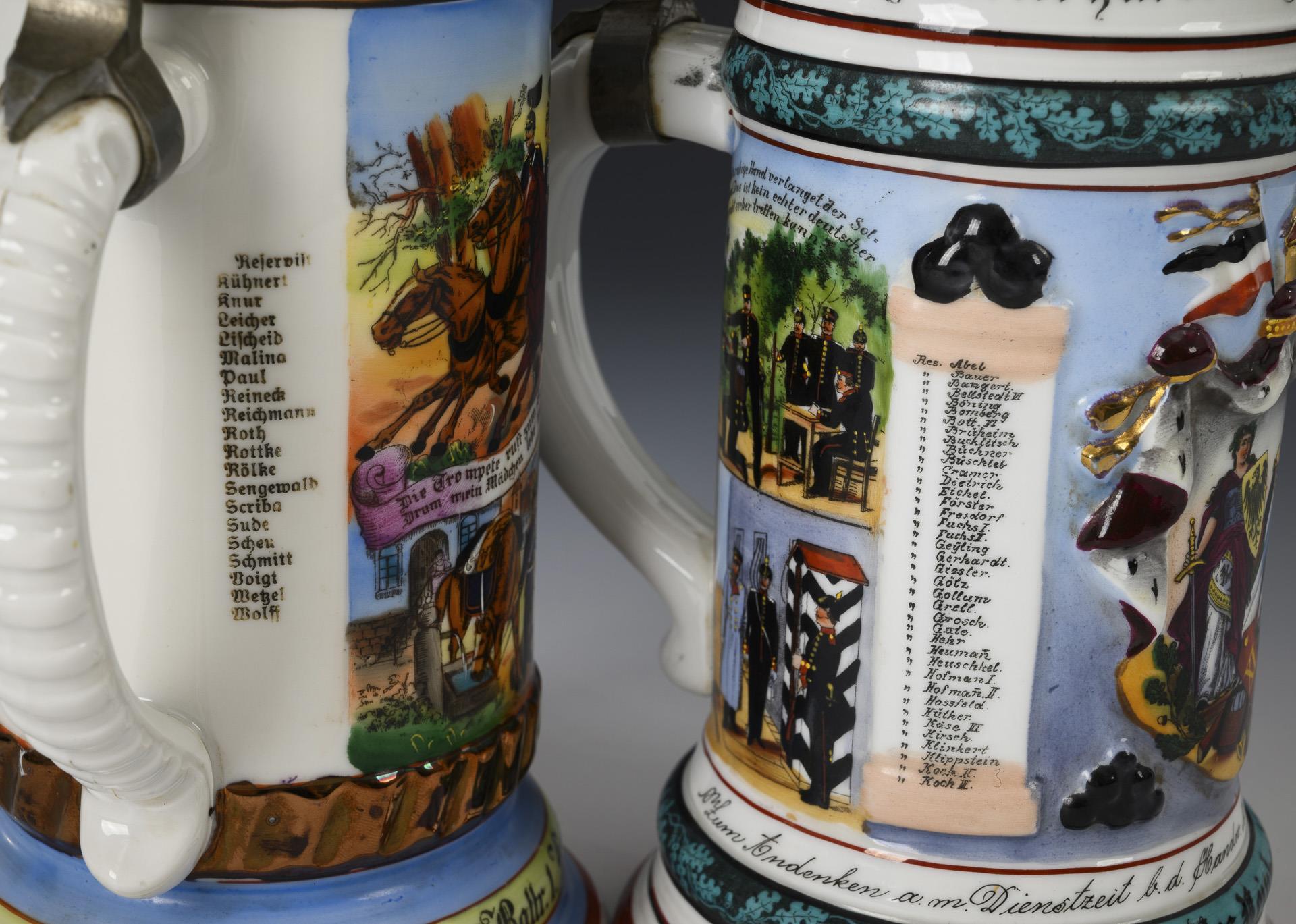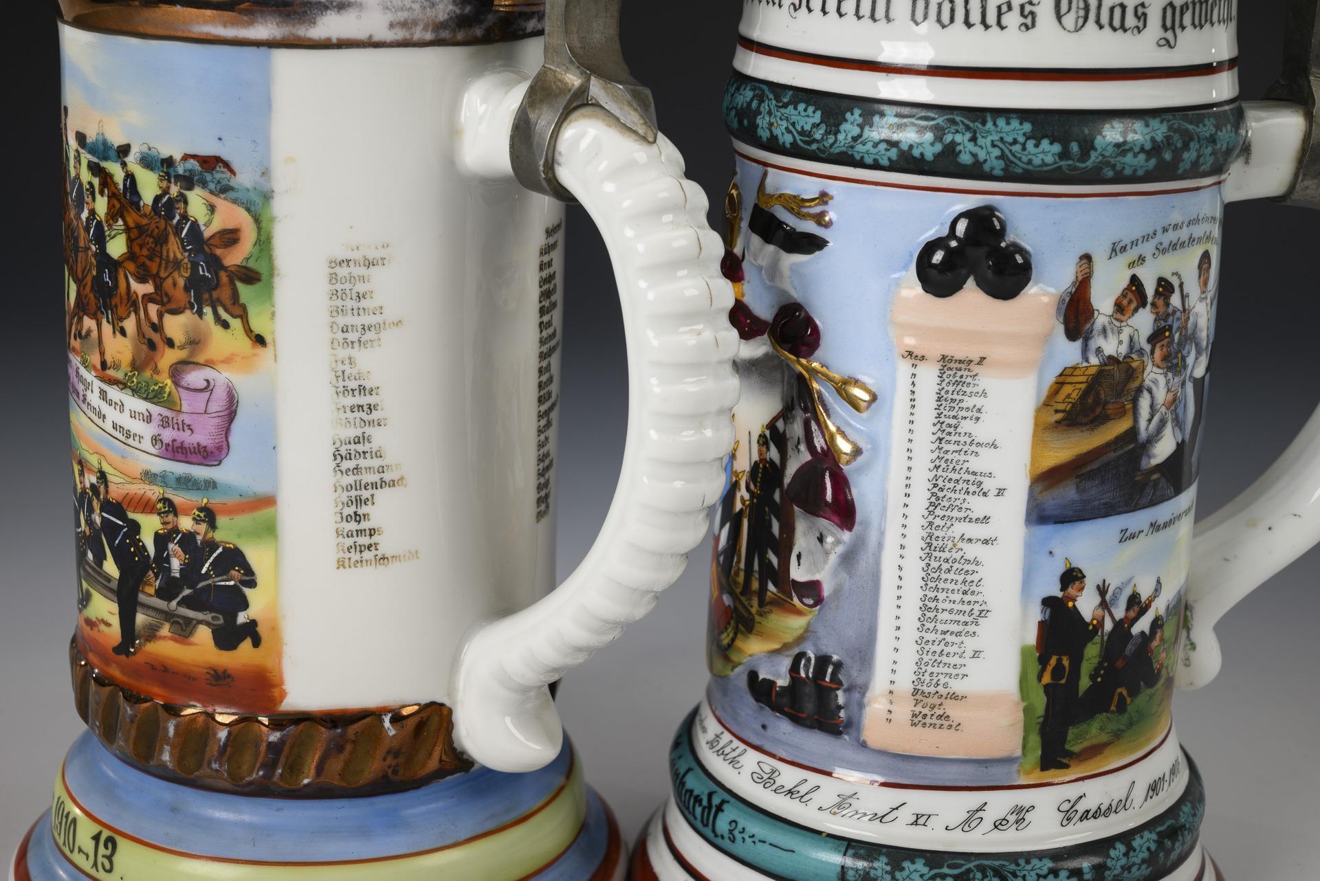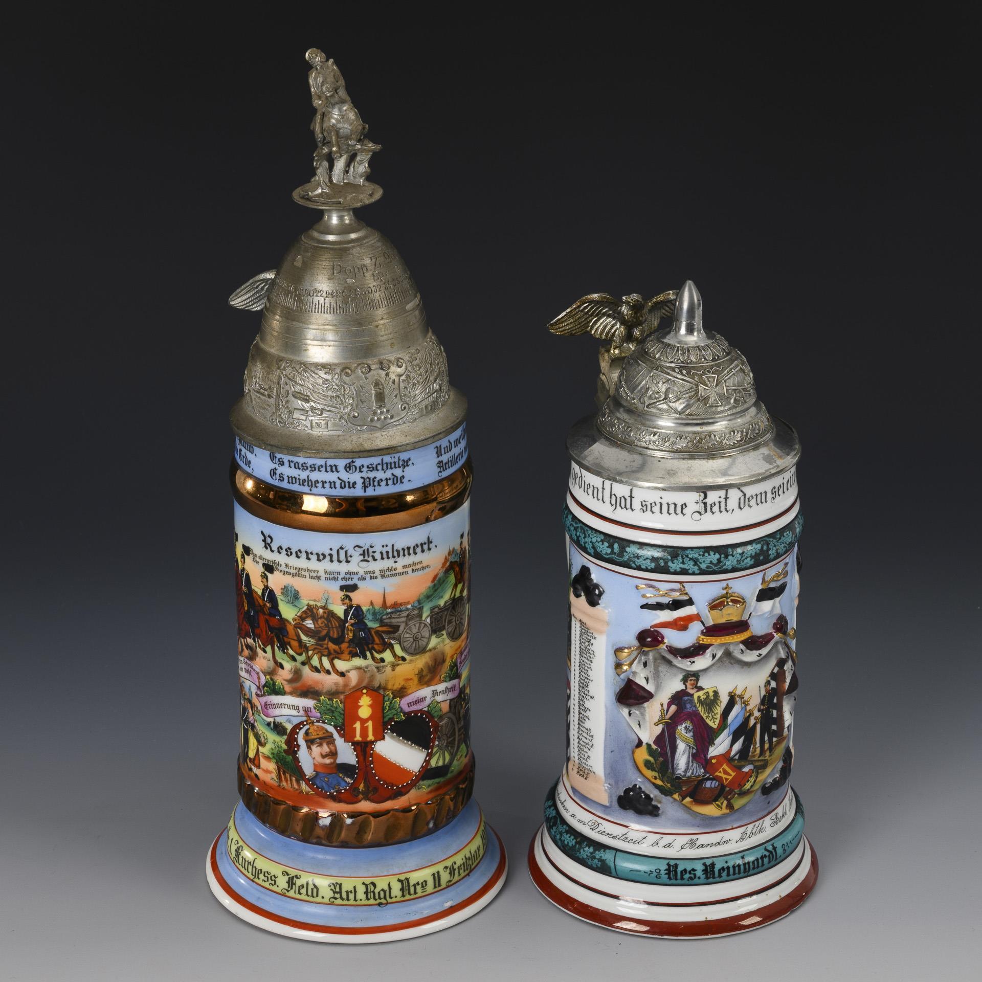 Large tankard with central shoulder piece between the portrait of Frederick II and coat of arms, above it a horseman with gun carriage flanked by military scenes with cannon and a printed list of names. "Reservist Kühnert" "1 Reit. Battr. 1. Kurhess. Field. Art. Rgt. Nro. II Fritzlar 1910-13". Lid in grenade form with equestrian crown (Stanhope magnifying glass miniature in the horse's head) and eagle pusher / On the wall Germania with flags and guard soldier flanked by columns with lists of names and military scenes. "Reservist Reinhardt" "Handw. Abth. Bekl. Amt XI A H Cassel 1901-1903". Pewter lid in relief with eagle pusher. Large jug somewhat rubbed, lid somewhat loose, horseman's head broken, missing microphotograph.