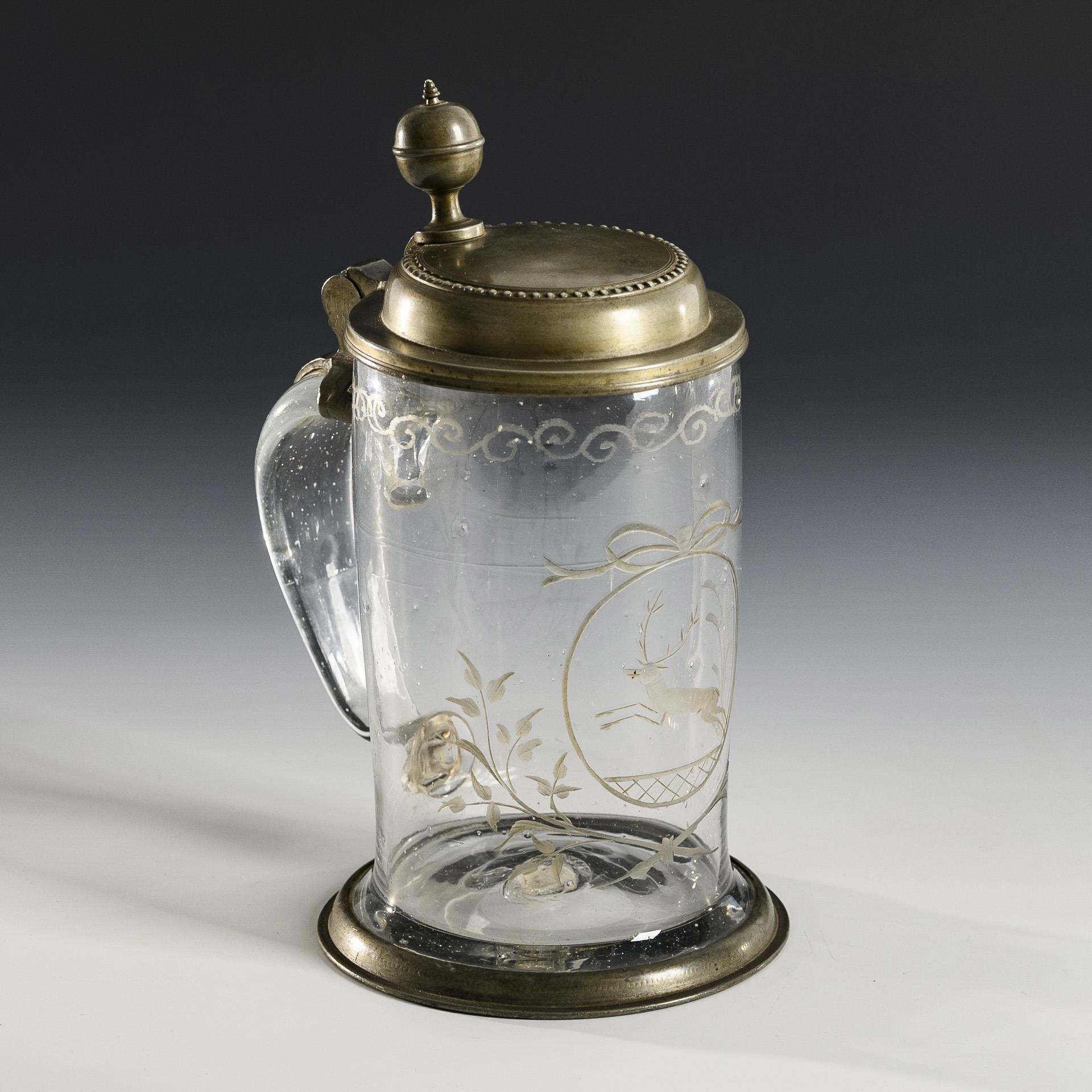 Cylindrical jug with strap handle and pewter-mounted stand and hinged lid. The front engraved with the motif of a leaping stag in a bow-crowned medallion.