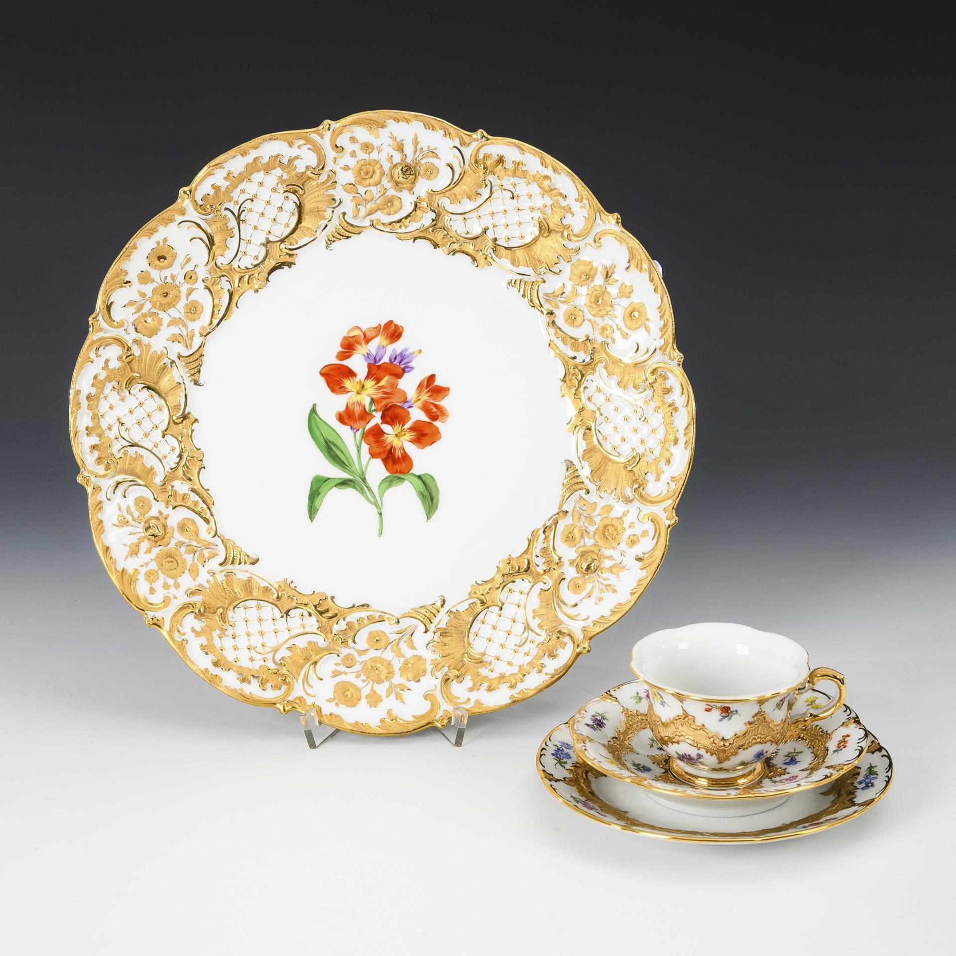 Mocha set "B-shape" with scattered flower painting: Mocha cup (H 5 cm), saucer (Ø 13 cm) and pastry plate (Ø 15.5 cm). / Cake plate with gold-bronzed floral and rocaille enamel rim and flower painting (Ø 29.5 cm).
