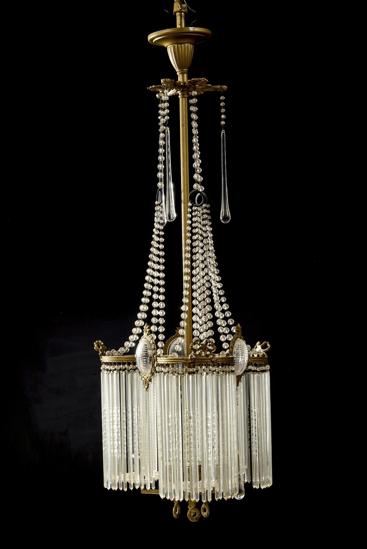 Arms braced on the fluted central shaft with the sockets in the cylindrical glass hanging over a three-pass ground plan. Under the canopy a decorated holder for the suspended glass bead chains and long glass drops. 1 glass drip tray missing, otherwise complete, function not tested.