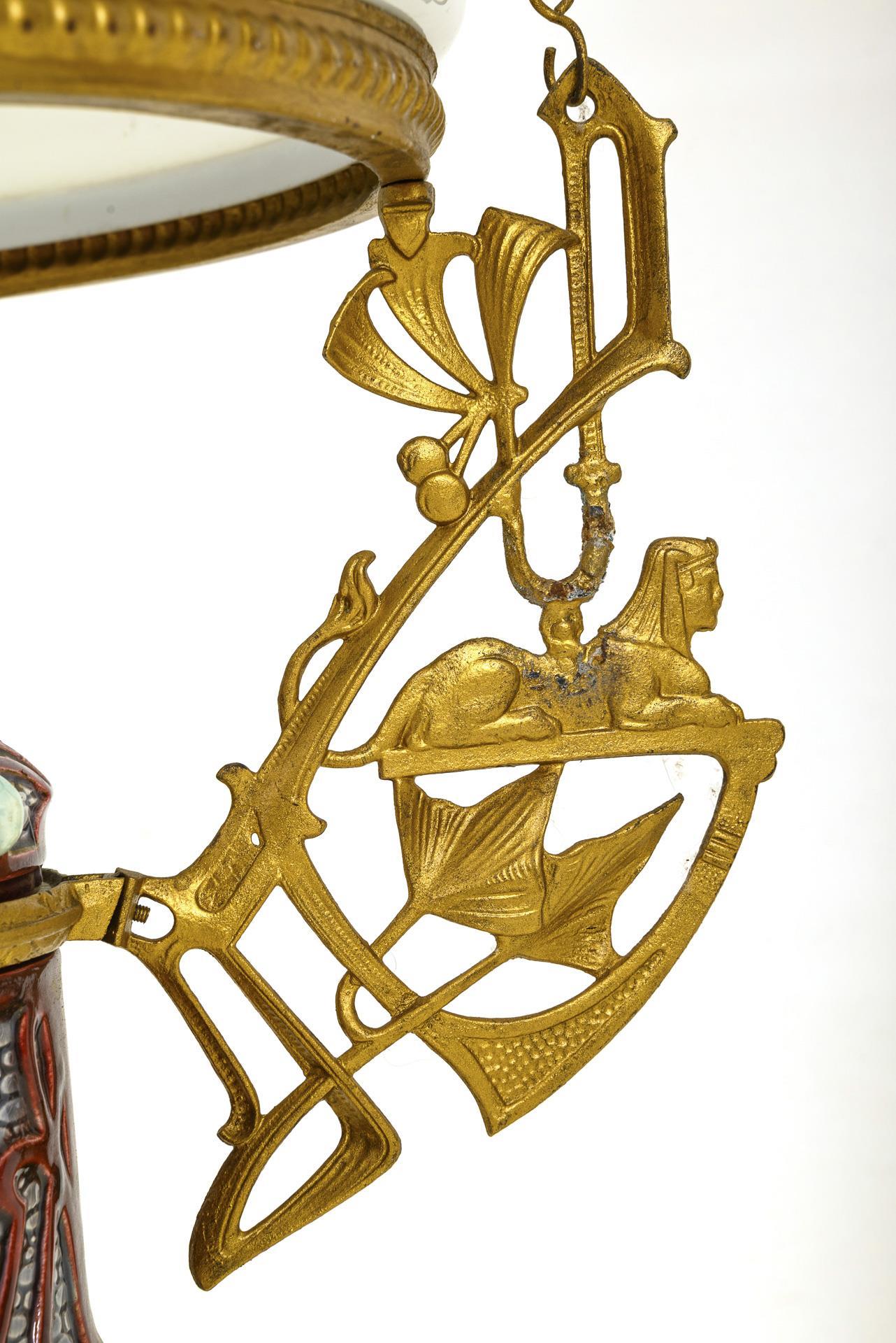 Ceramic container with Art Nouveau relief, 3 ornamental arms with sphinxes, leaves and struts as well as chain suspension with decorated counterweight under the canopy with pulleys. Round burner chimney and glass shade. 1 arm welded, glass tank with breakage, missing part on the burner air grille, filling in the counterweight missing.