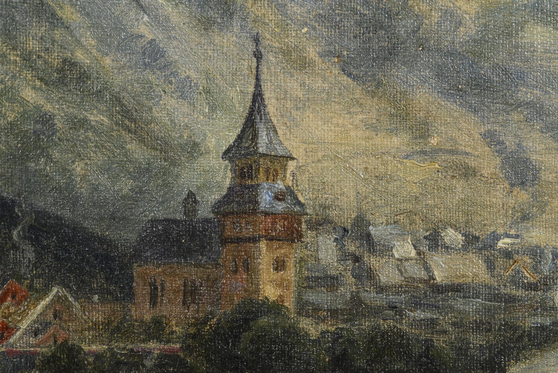View along the riverbank with the village below the castle in the sunshine. Minimal traces of age.