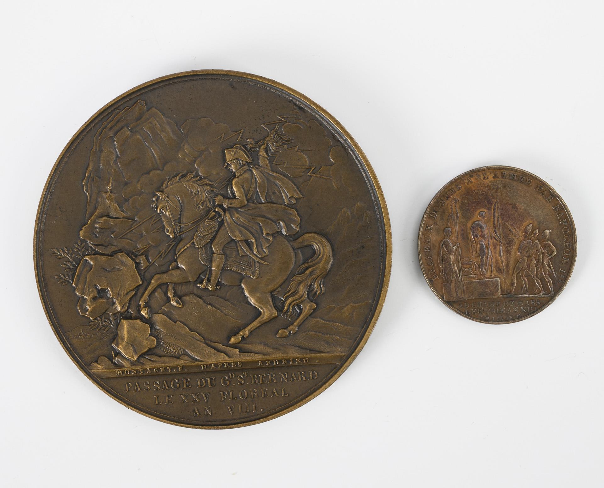 Portrait above trophies and bataille cartouche, inscription "Bonaparte Premier Consul de la Republique Fran.se", "Bataille de Marengo, le XXVI Prairial An VIII.". On the reverse Napoleon on horseback in the mountains, "Passage du Gd. St. Bernard le XXV Floreal AN VIII.", each inscribed Montagny. Punched bronze on the rim. Ø 6 cm, 84 g. / Portrait "Napoleon Empereur"; Denon dir. and Droz fecit inscribed. Homage "Drapeaux Donnes..." on the reverse. Ø 2,7 cm, 9 g. Large few, small strong traces of age/use.