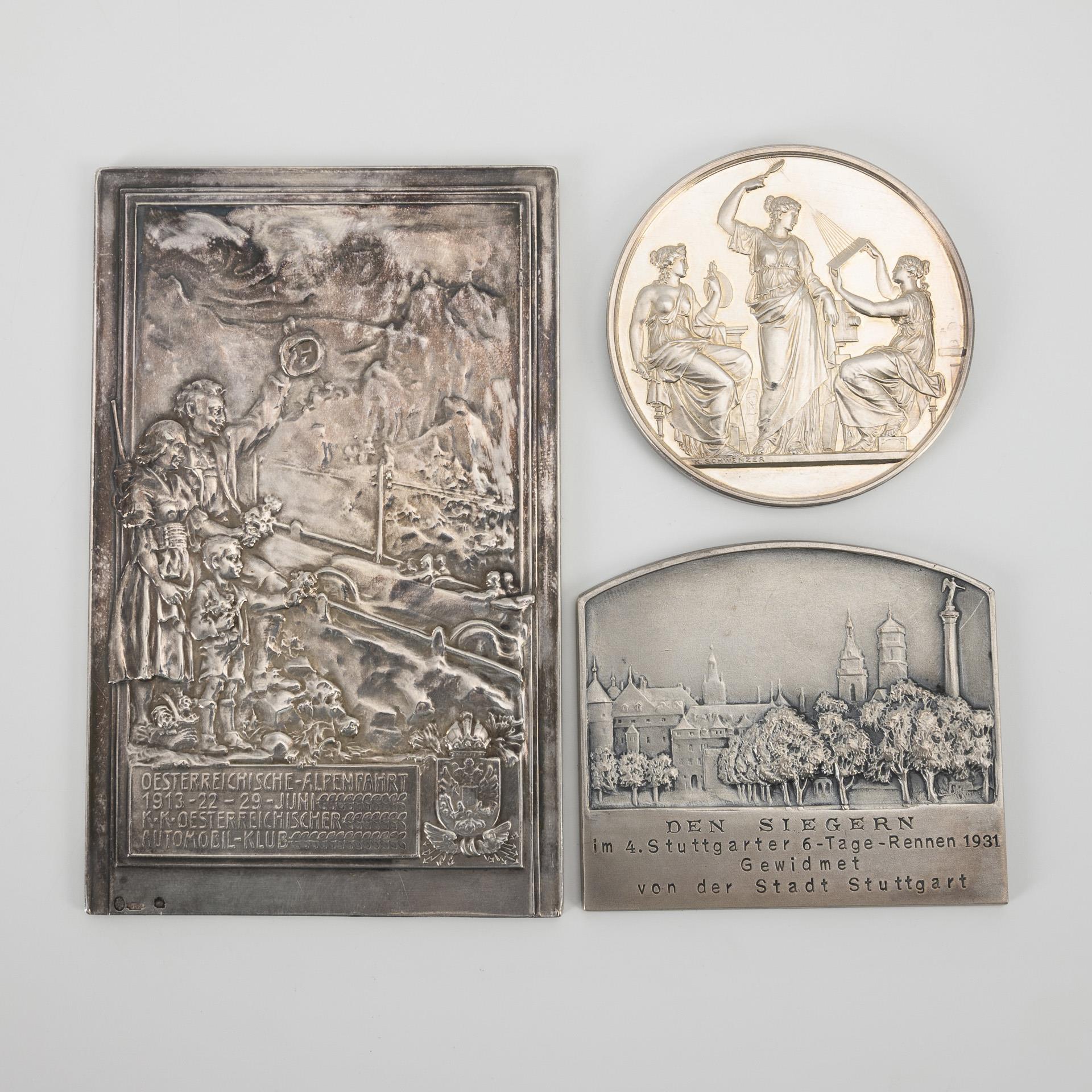 Silver plaque in high rectangle relief on one side "Oesterreichische-Alpenfahrt 1913 - 22 - 29 - Juni K .K. Oesterreichischer Automobil-Klub". Diana's head hallmarked for 950 and Josef Carl von Klinkosch. / Silver medal in relief on both sides "Photographische Gesellschaft in Wien" "Ernst Müller 1905"; design K. Schwenzer. Diana head Vienna 950 and J.C hallmarked. / City view "To the winners of the 4th Stuttgart 6-day race 1931. Dedicated by the city of Stuttgart". "950 silver" and "Mayer u. Wilhelm Stuttgart" hallmarked.