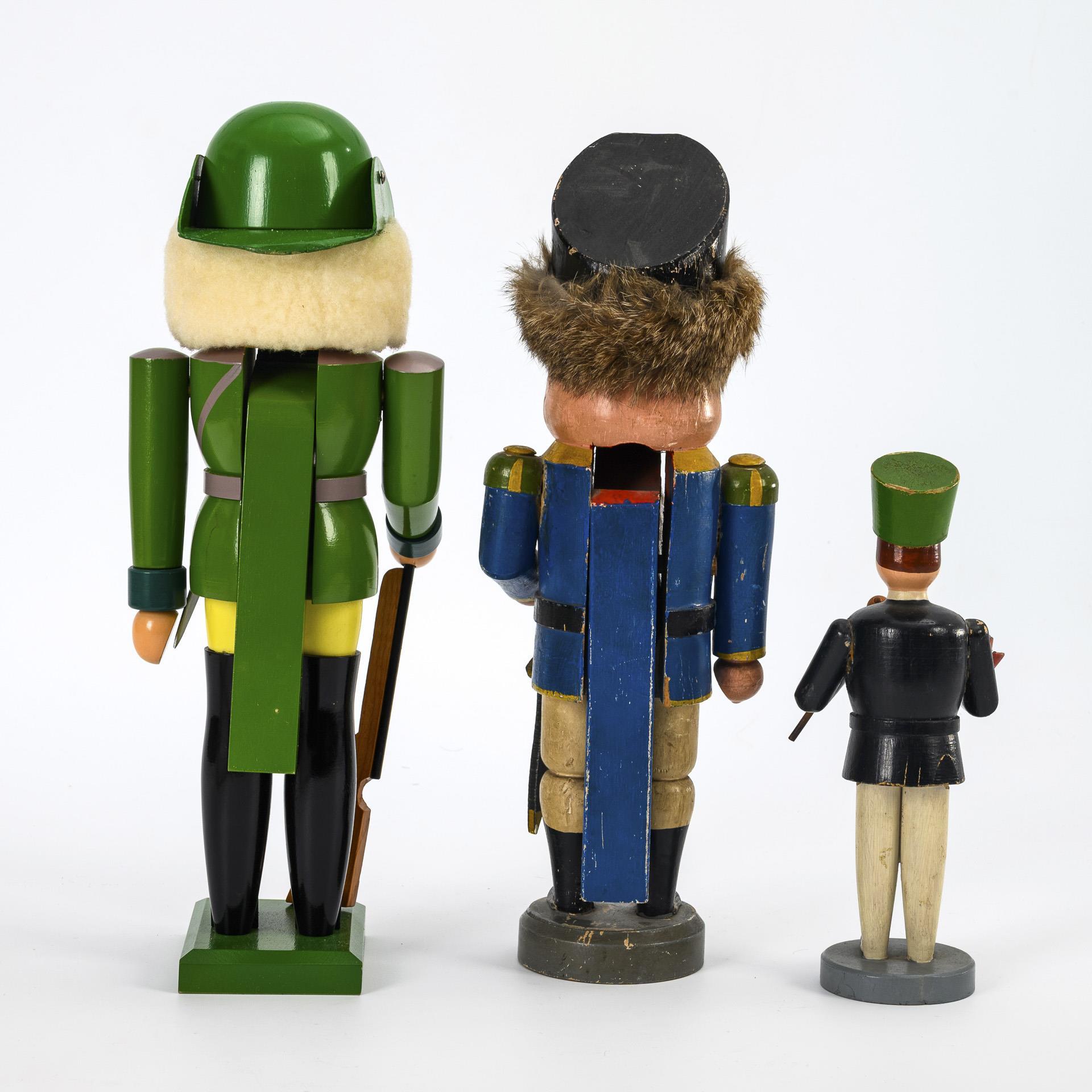 1 nutcracker in blue uniform, 1 nutcracker as a hunter in green clothes (+ Seiffener cardboard "Vero"), 1 smoking man in miner's uniform, with candle spout in the right hand. 1x unused, 2x with traces of age and paint defects.