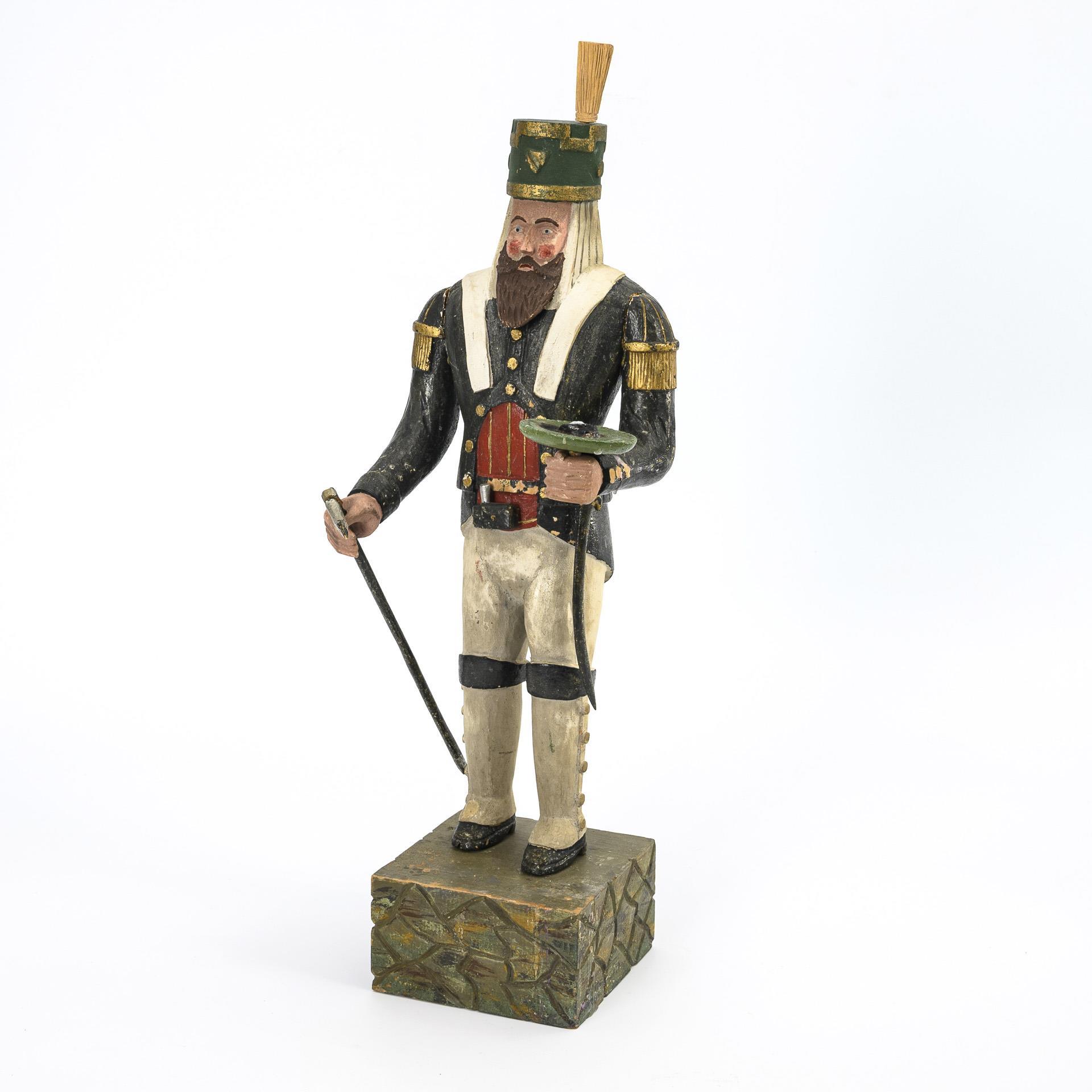 Miner in parade uniform, with candle in his left hand. On a square base in stone look. Signs of age, minor paint defects.