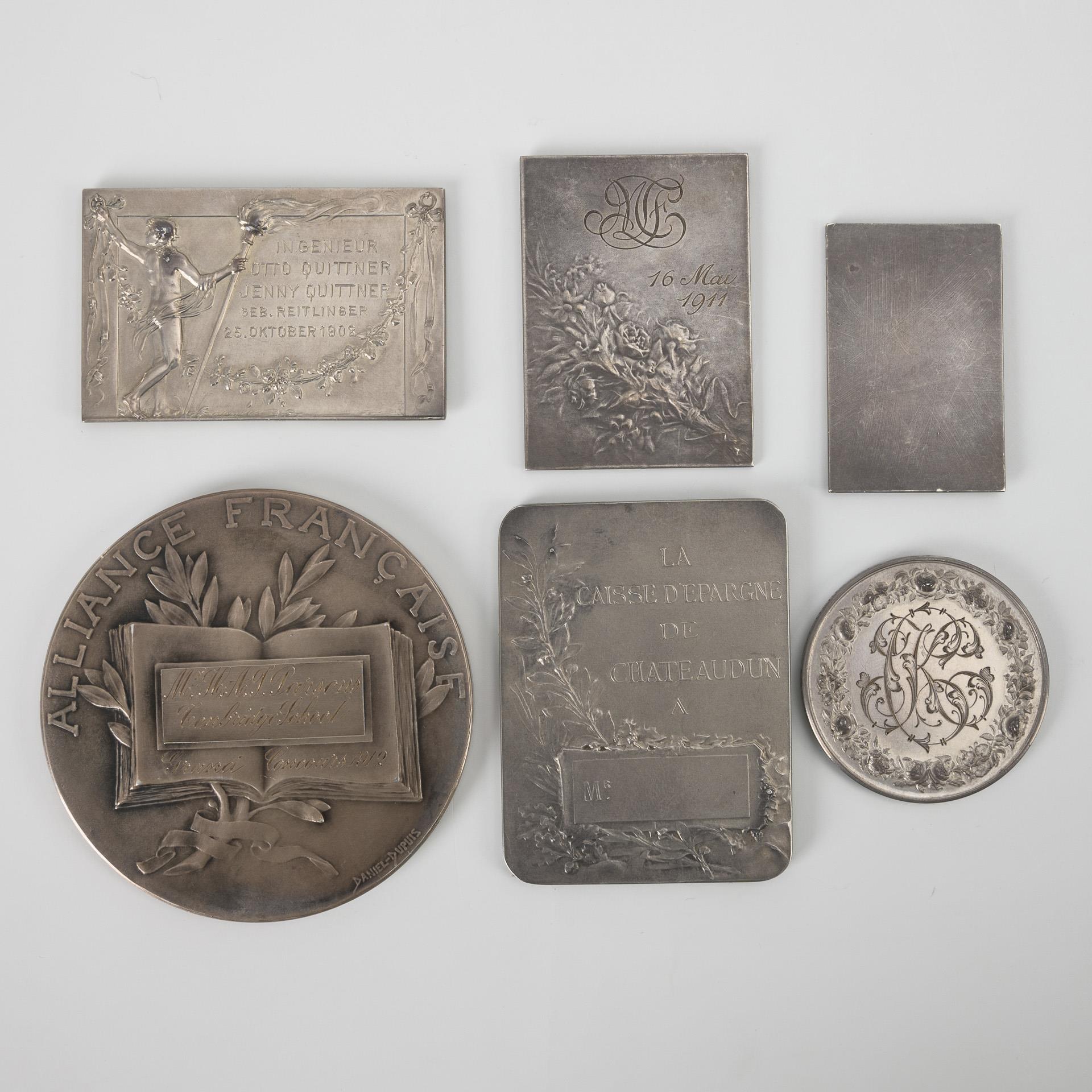Allegory of France as teacher of children from all over the world. On the reverse book with laurel branch "Alliance Francaise" cartouche with engraving: name and "Conbridge School Grand Concours 1912"; inscribed Daniel-Dupuis on both sides. 1 Argent hallmarked. / Goddess of Victory under the tree; inscribed J. Rasumny. Laurel branch "La Caisse d'Épargne de Chateaudun" and cartouche on the reverse. Without engraving on both sides. Indistinctly hallmarked Argent. / Lovers and violinist. Torch bearer with garland and engraving on the reverse: married couple "Quittner 1908". Hallmarked 1000 silver. / Embracing lovers; F. Vernon inscribed. On the reverse a bouquet of roses with engraving: monogram and date 1911. Argent and indistinct hallmarks. / Standing couple at the altar "Fidelite Bonheur". Rosary with engraved monogram CK on the reverse. Engraved names with date 1880 on the rim, hallmarked argent. / Standing couple at the burning altar, cartouche with engraving: monogram and date 1908; inscribed E. Dropsy. Back side empty. 1 Argent hallmarked. Goddess of Victory under the tree small scratch near inscription and notch on edge.