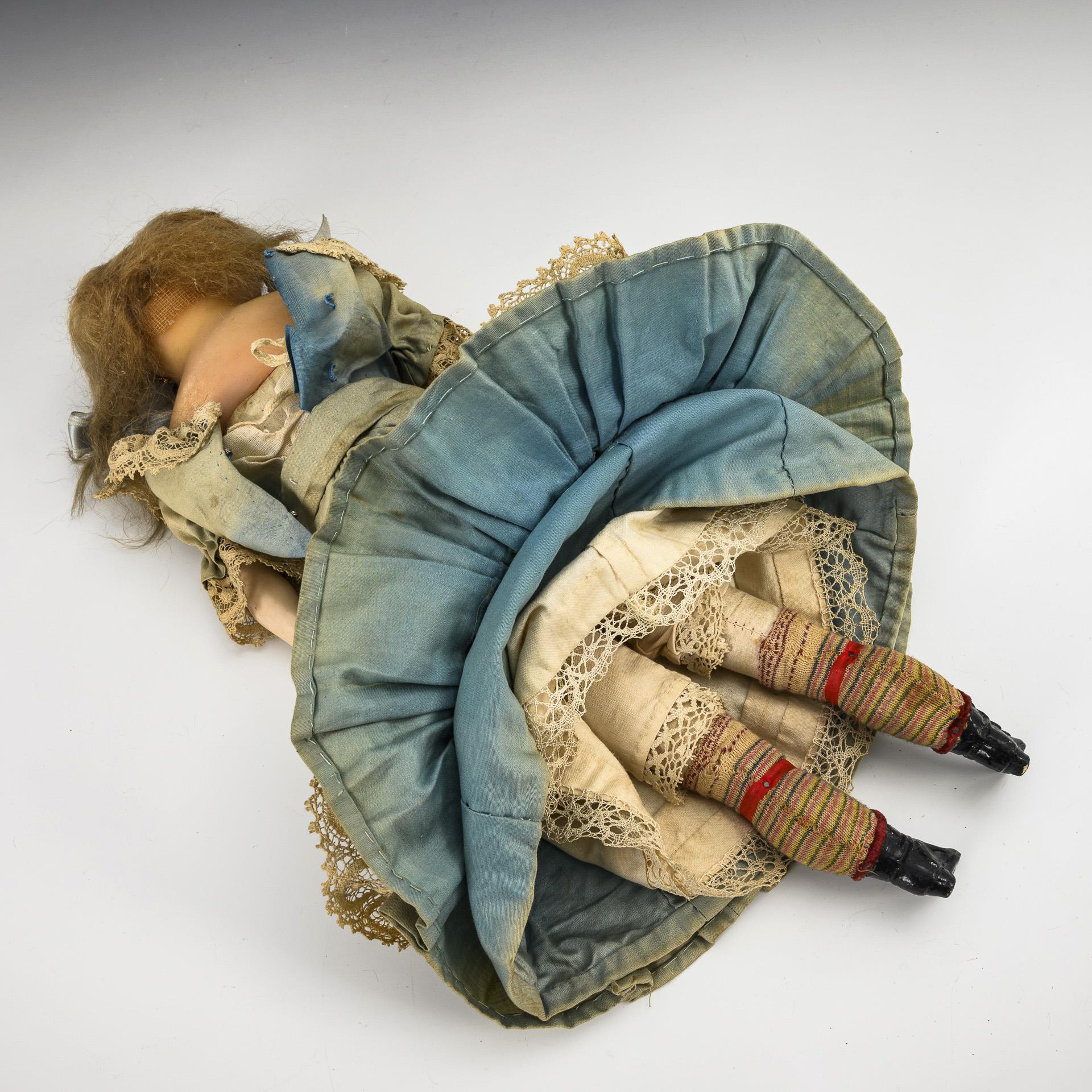 Chest head, fixed blue glass eyes, earrings, blond mohair beads. Cloth body with waxed mass links and molded boots. Original light blue dress and straw hat.