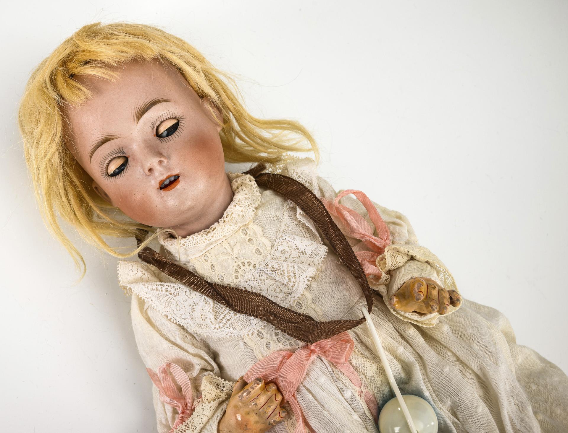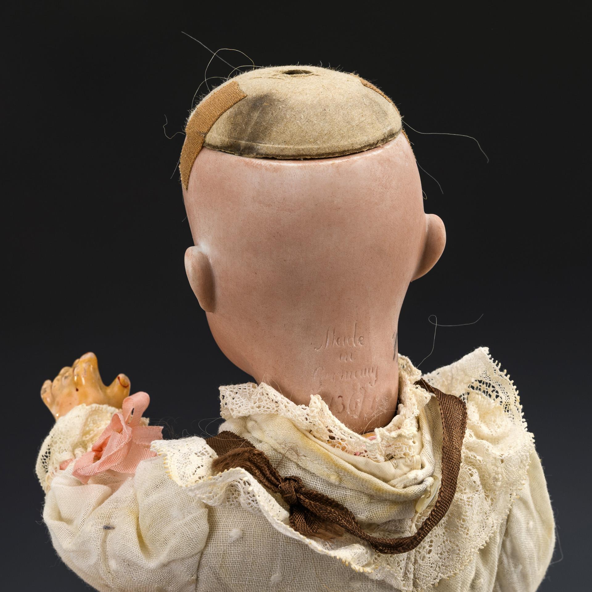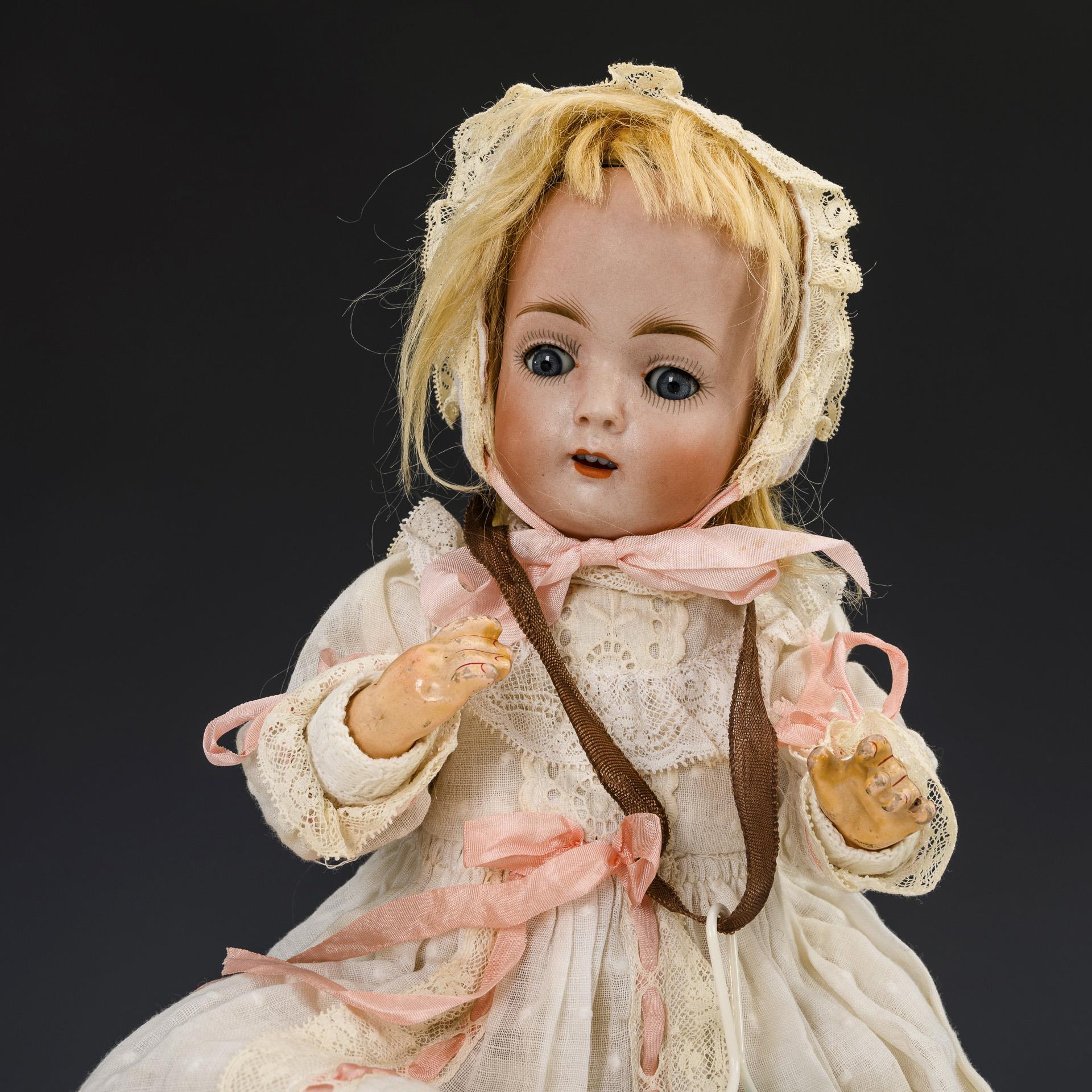 Cranked head, blue sleeping eyes, mohair beads. 5-part sitting baby body. Long white dress and matching hood with pink bows. Head x-rayed: without defects.