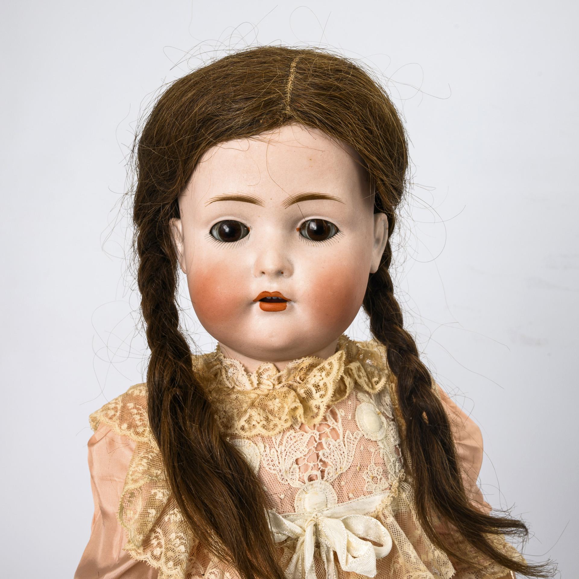 Cranked head, brown sleeping eyes, eyelashes, brown real hair beads with plugs. 15-piece articulated body. Dress with lace, matching hood. Chip and 2 burn marks to the crown of the head. 2 fingers punctured.