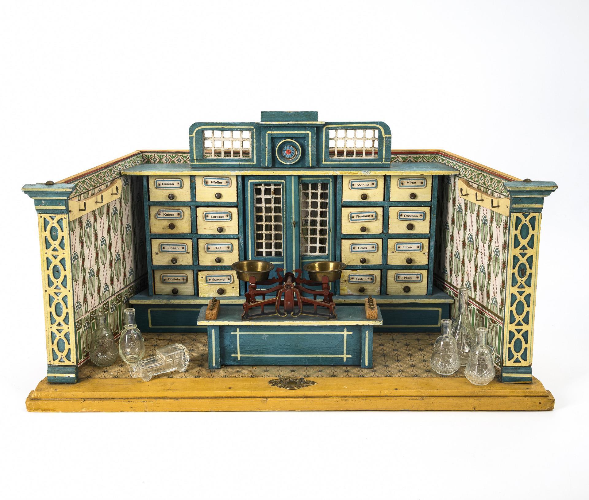 Trapezoidal 1-room cabinet with decorative pilaster strips, fixed store fittings and counter. Shelf with 16 drawers, cardboard sign and 2 barred doors. Also tin scales, 2 weight scales and 6 glass jars. Signs of age, small defects, dry cracks in the floor.
